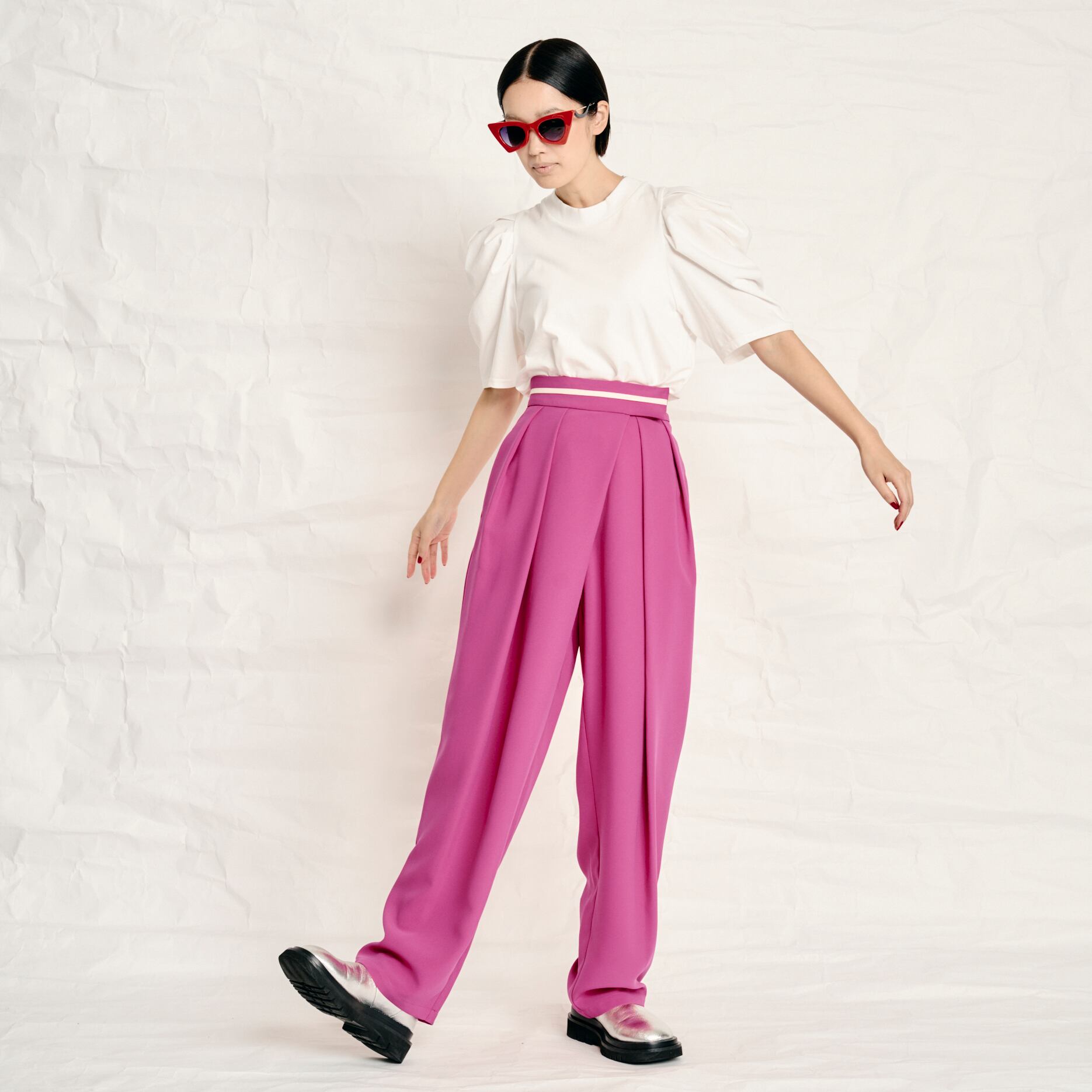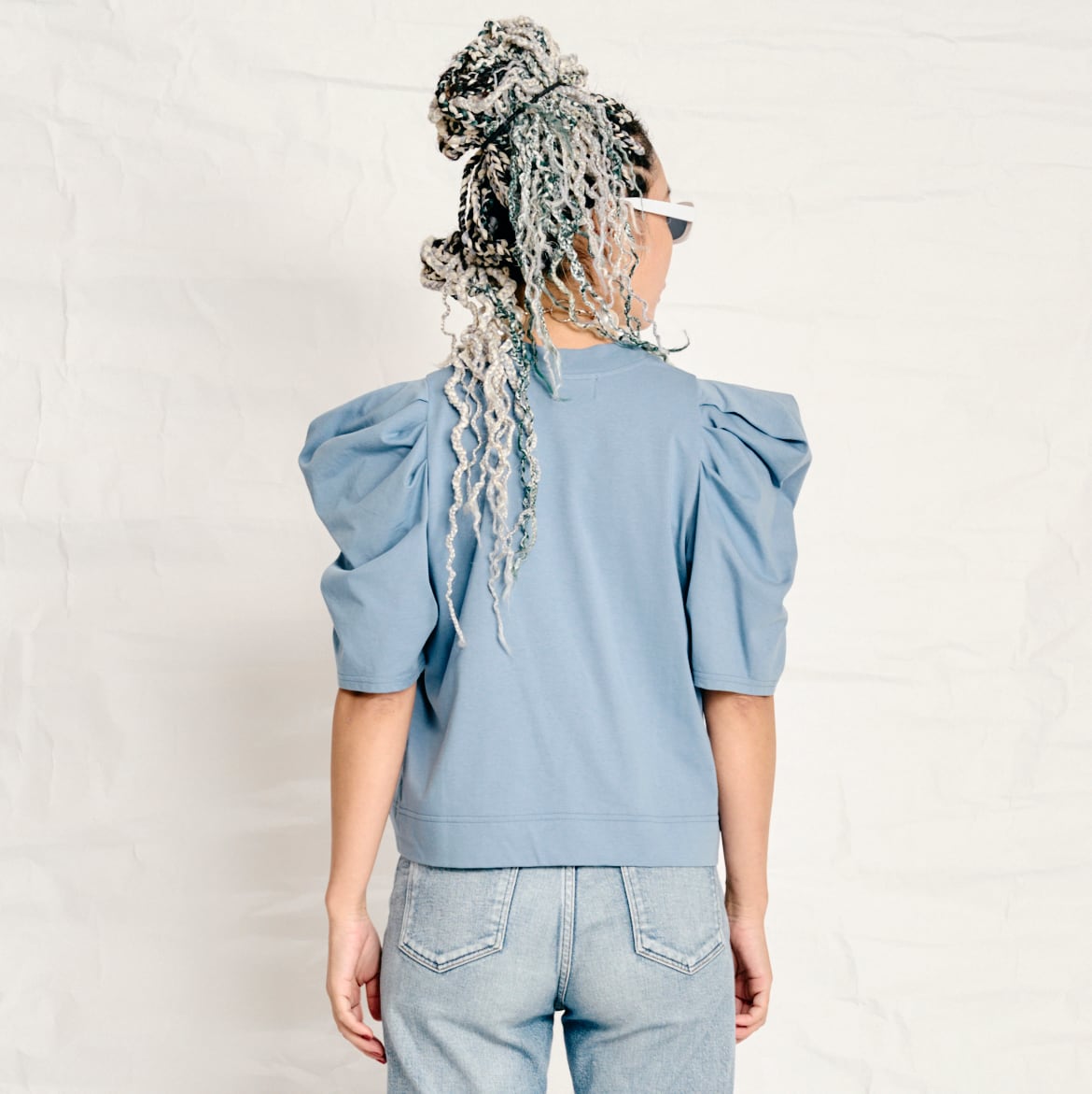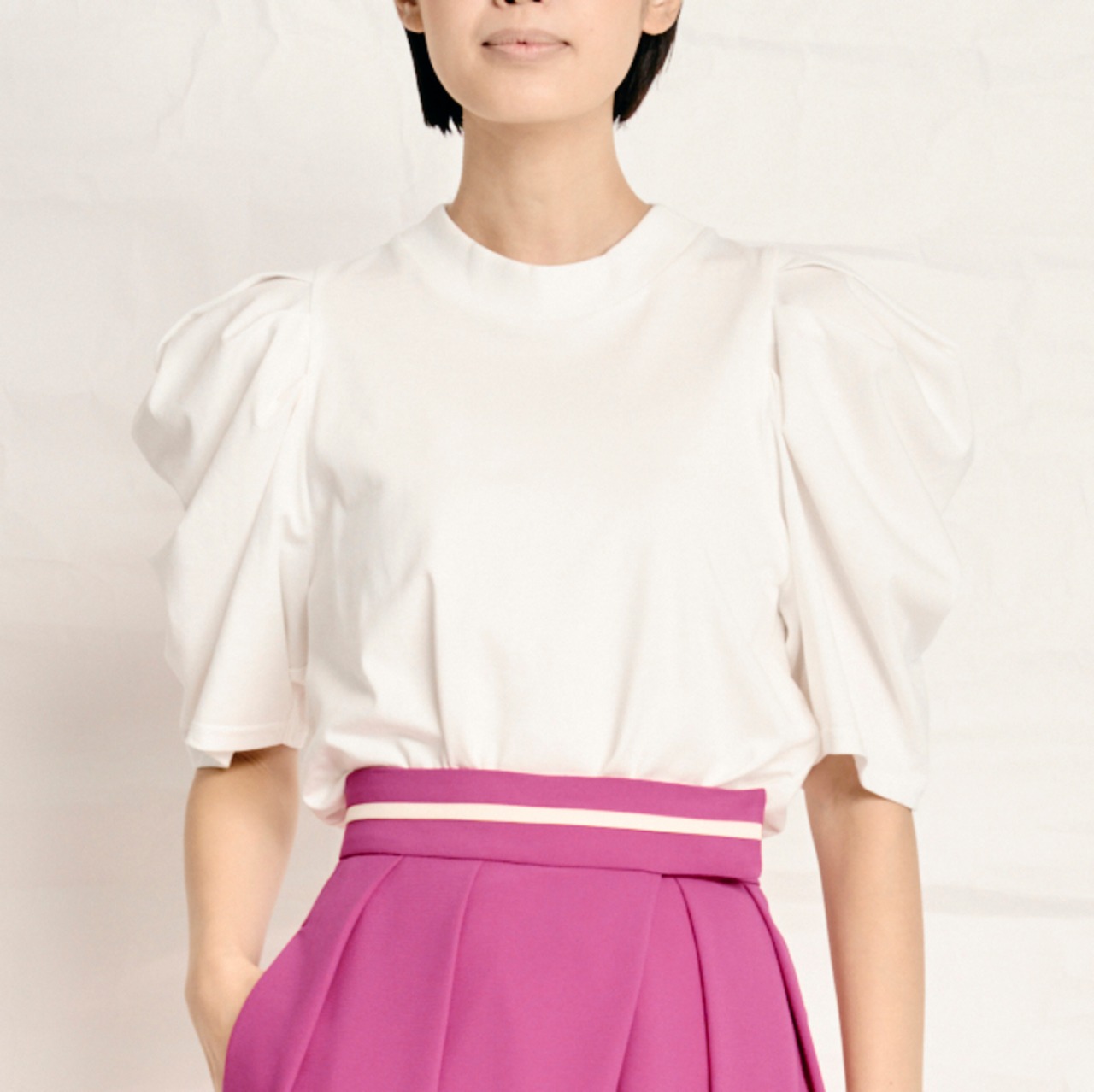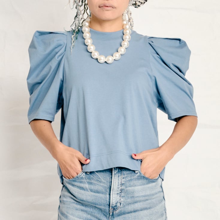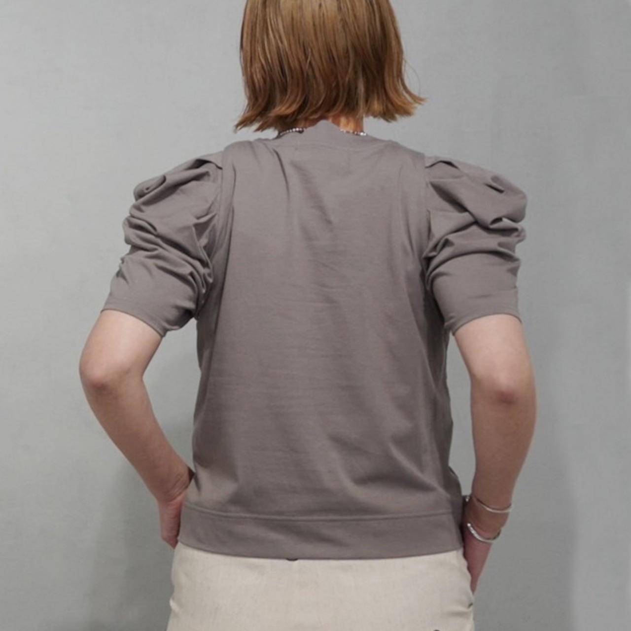 大胆なギャザーでボリュームを持たせたパフスリーブが印象的な一枚。