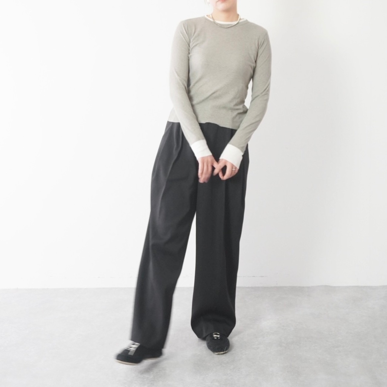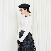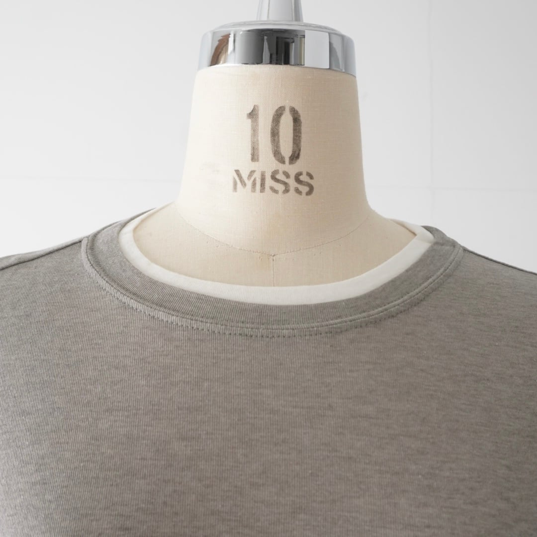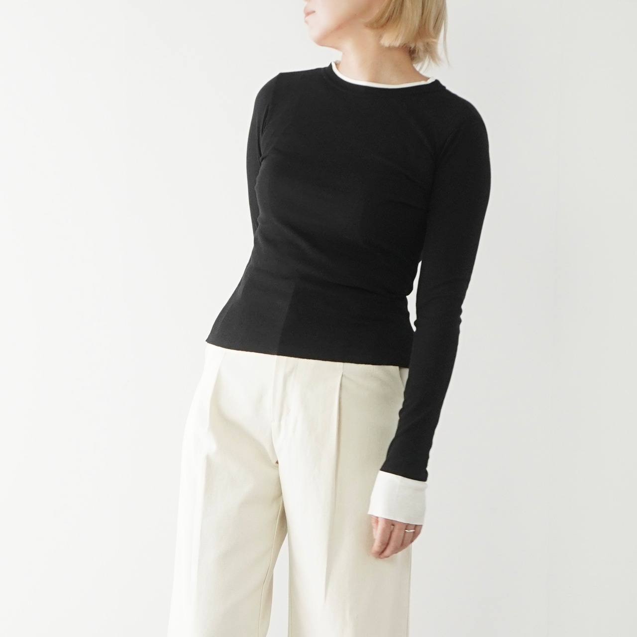 袖口と襟ぐりは、レイヤード風のさりげないデザインで、1枚で着てもスタイルに変化をプラス。