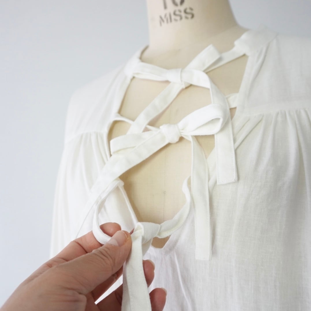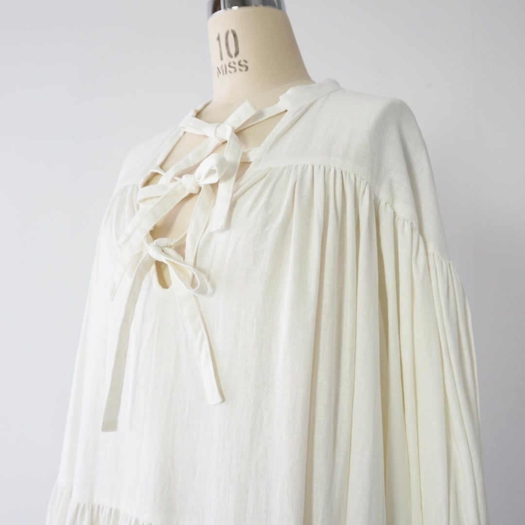 ラミーとコットンのナチュラル素材を使用し、軽やかで涼しげな着心地を叶えます。ホワイトのカラーが清楚で上品な印象を与え、1枚でスタイリングが完成する存在感あるアイテムです。