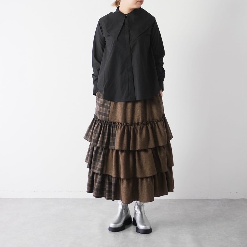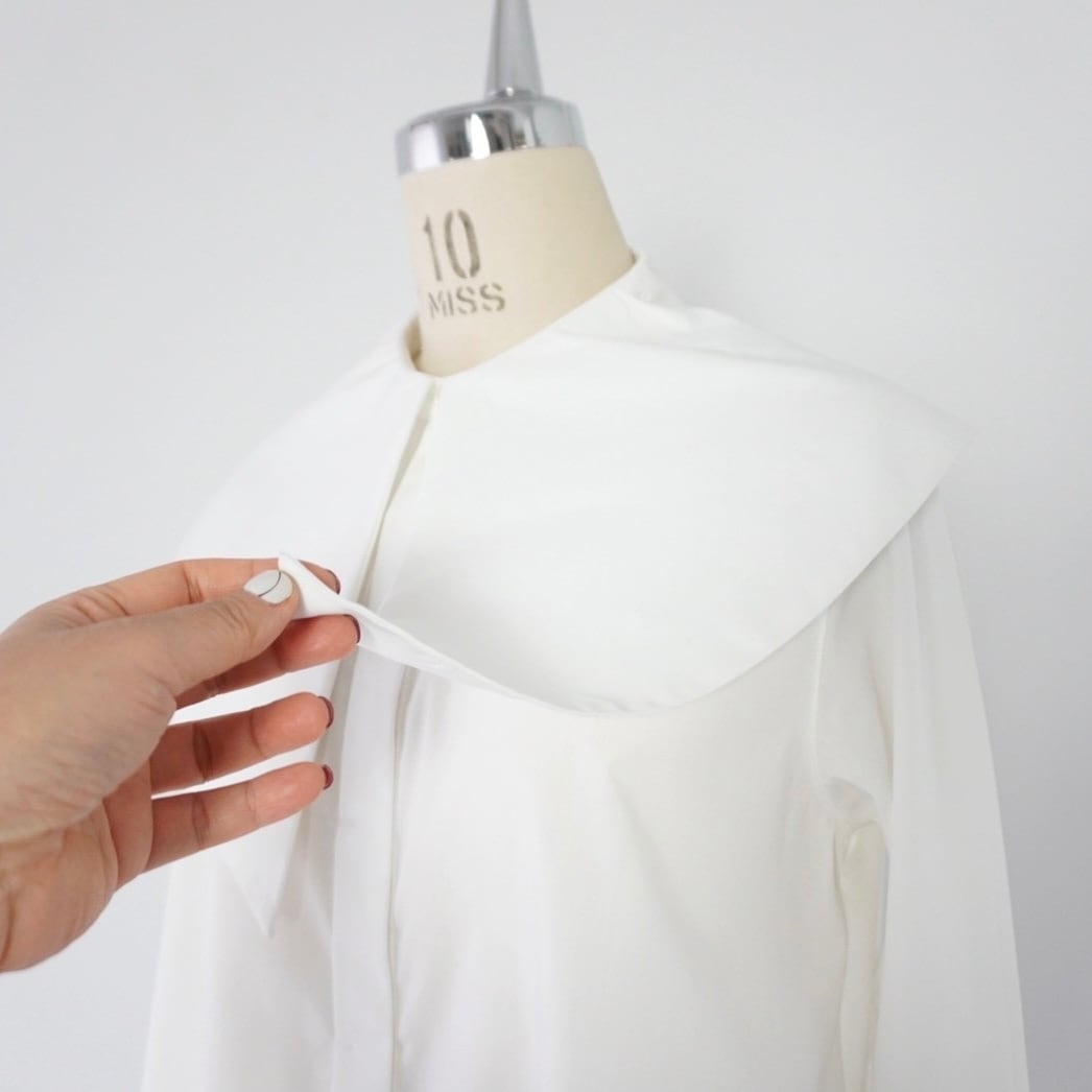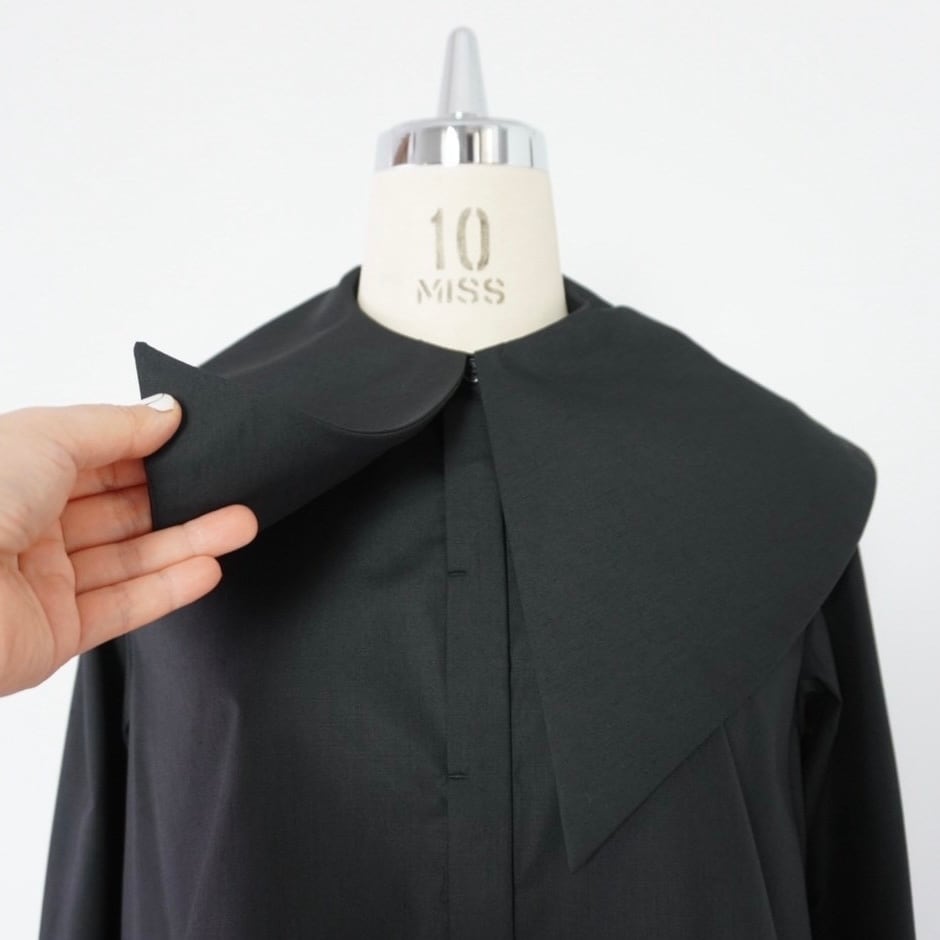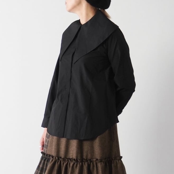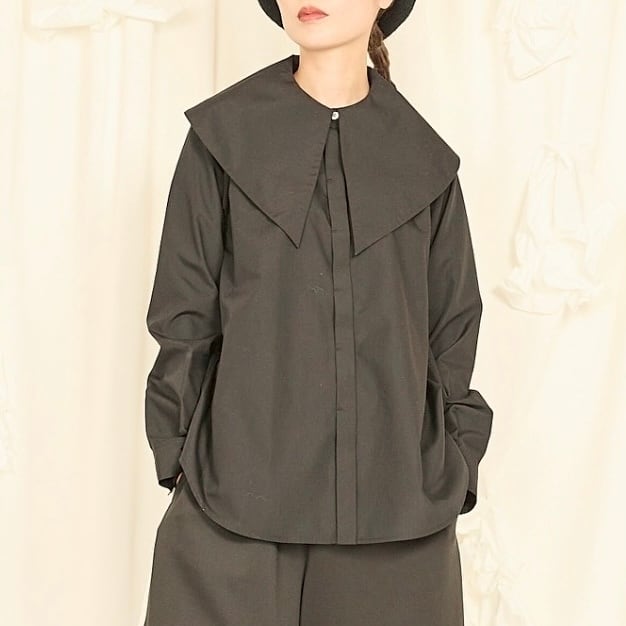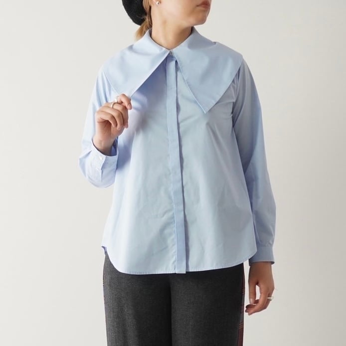 大きめの襟が印象的なビッグカラーシャツ。比翼仕立てでボタンを隠し、ドレス感と上品さを演出しました。肩に収まる襟幅で抵抗なく着られ、シンプルなスタイルに重ねるだけで鮮度をアップ。シワになりにくいコットンポリ素材で、ノーアイロンでも着用可能です。