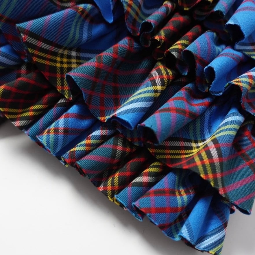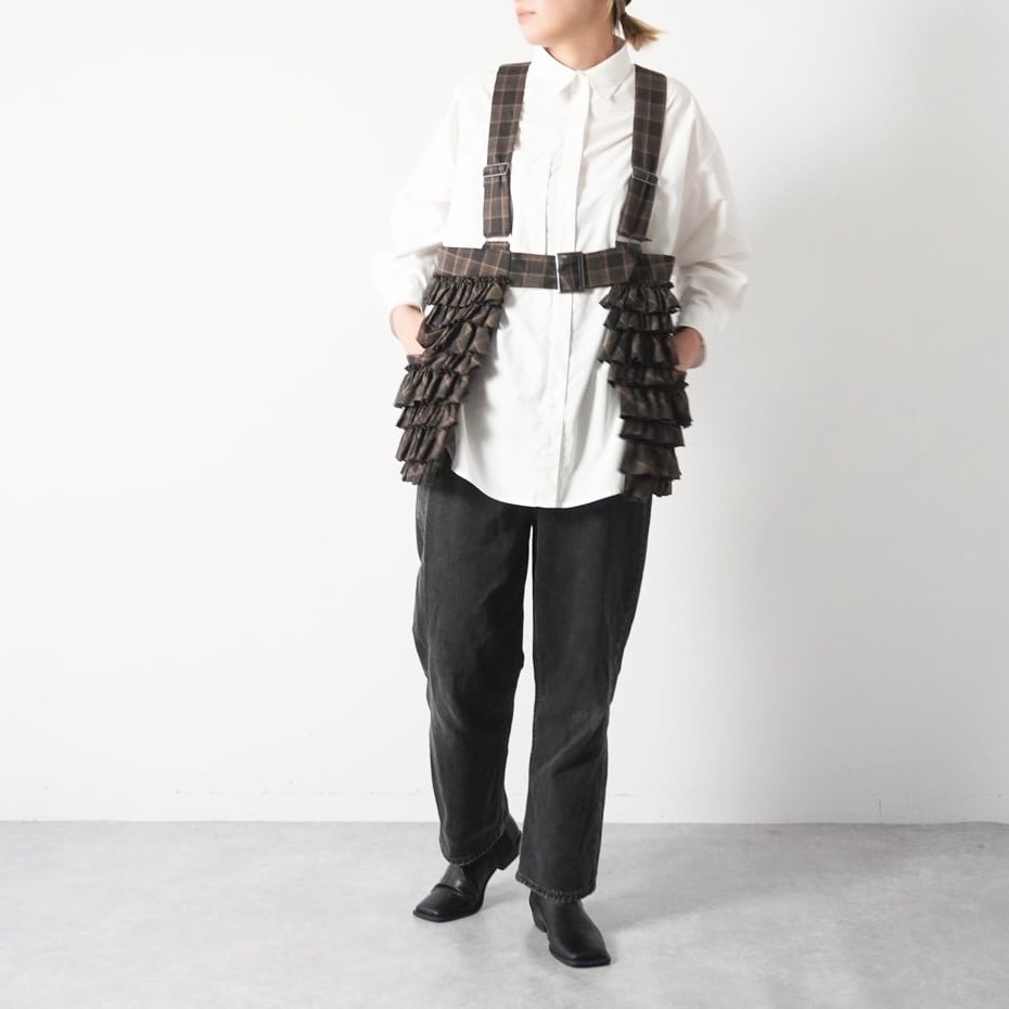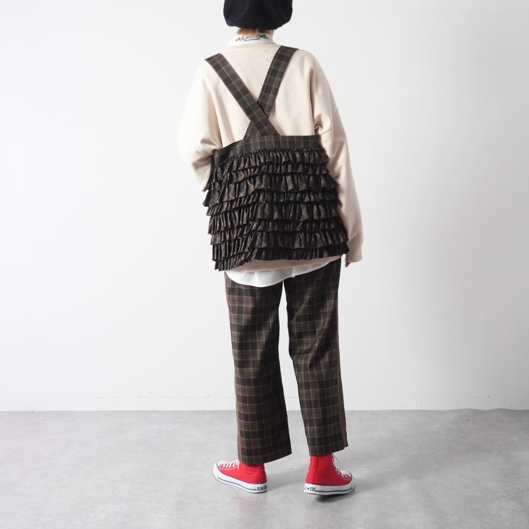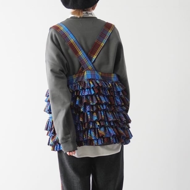 定番ポケットベストの新作のタータンチェック。細かいフリルと大きめポケットで華やかさと実用性を両立。Tシャツやシャツに重ねるだけでコーディネートが一気に格上げ。サイズ調節可能なストラップ付きで、春夏秋冬問わずコートやジャケットの上にも重ねられる万能アイテム。大きめのポケットがバッグ代わりとしても活躍。