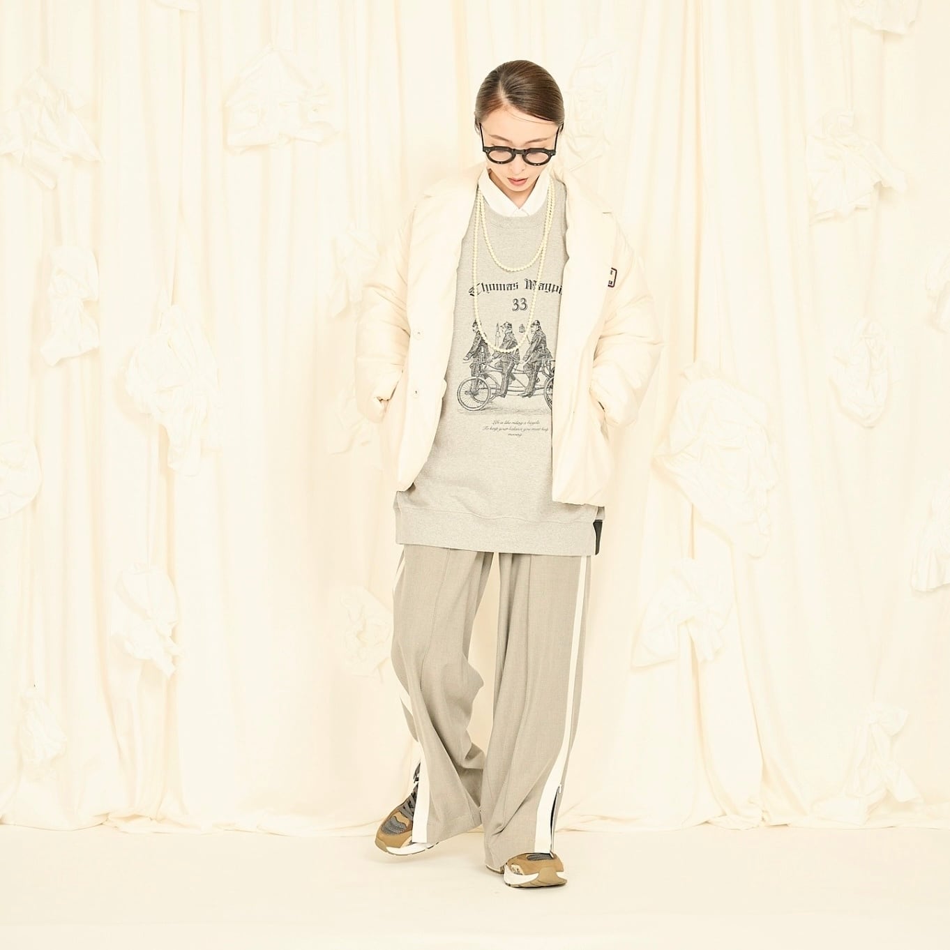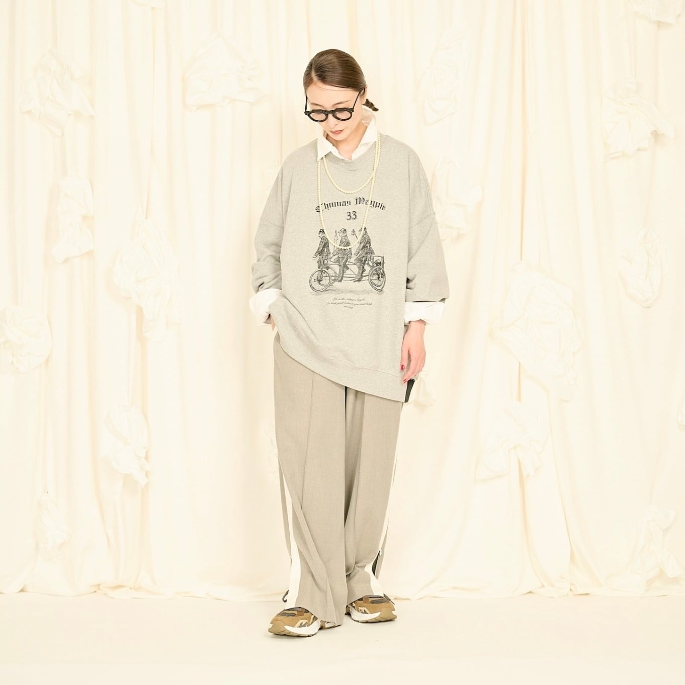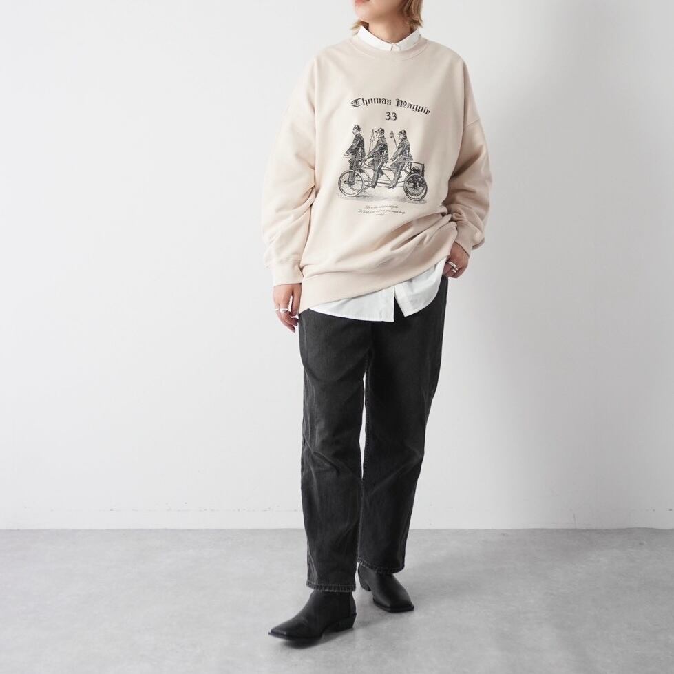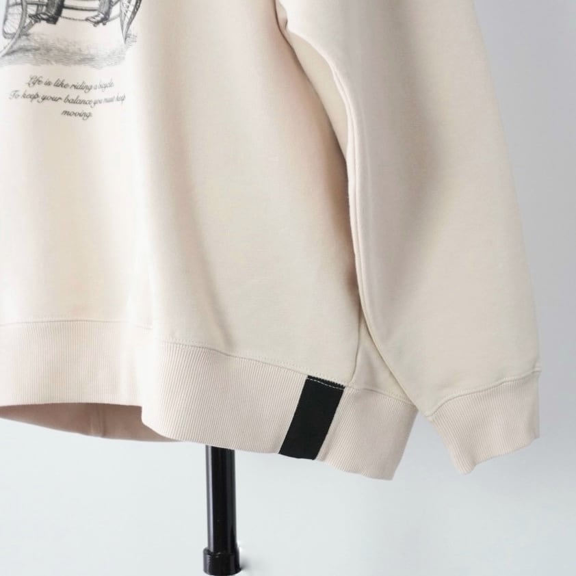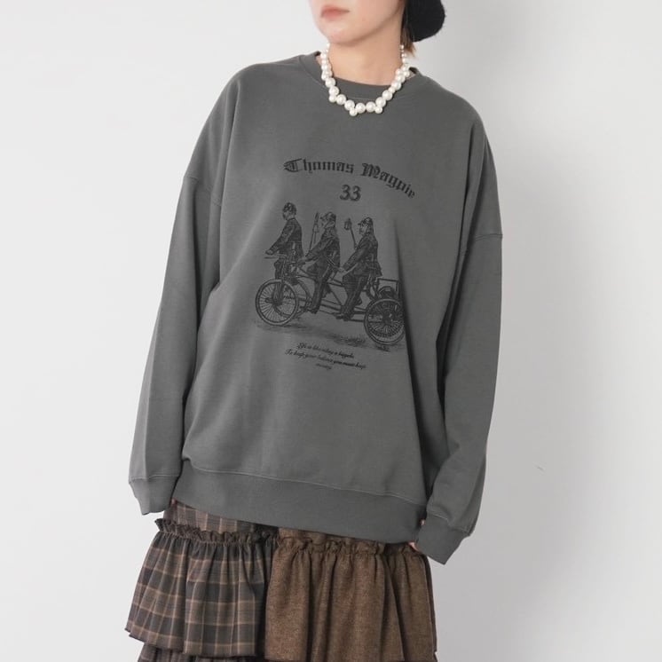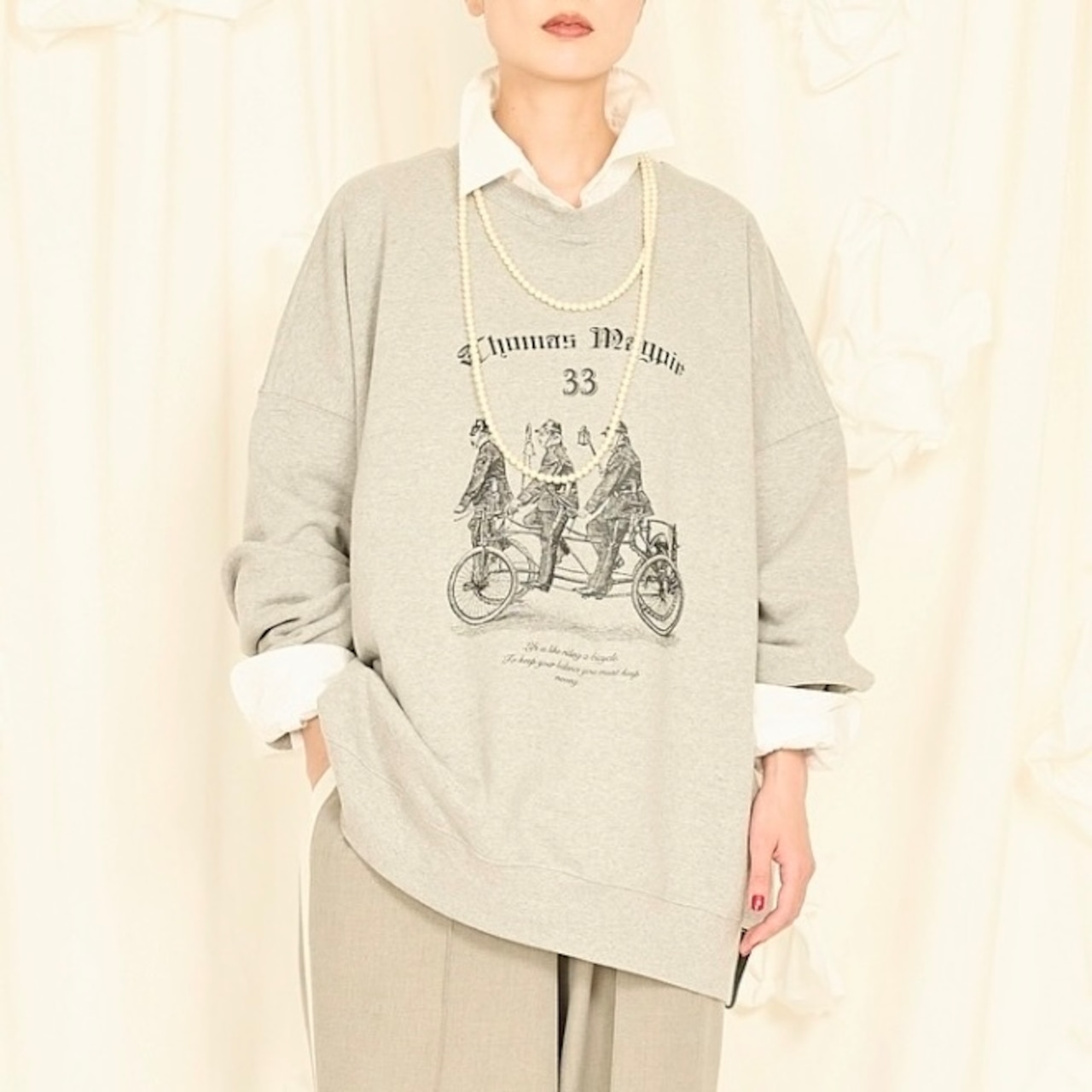 自転車に乗る男性のクラシカルなグラフィックと「33」のコレクションナンバー入りで、テーマ「NOT BORE」に沿った遊び心と人生のバランスを表現。着丈は長めでワンピース風にも、タイトスカートとのコーディネートも◎。しっかりとしたオリジナルボディで耐久性が高く、長く愛用できる一着です。