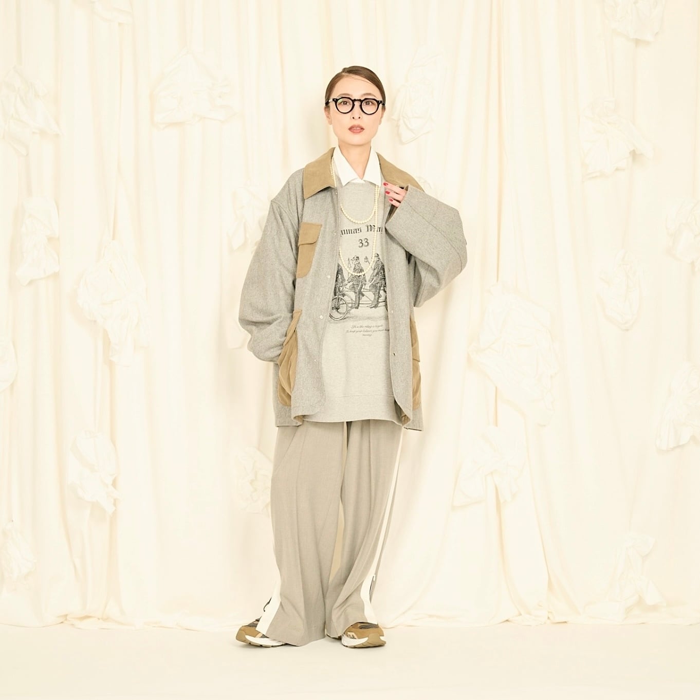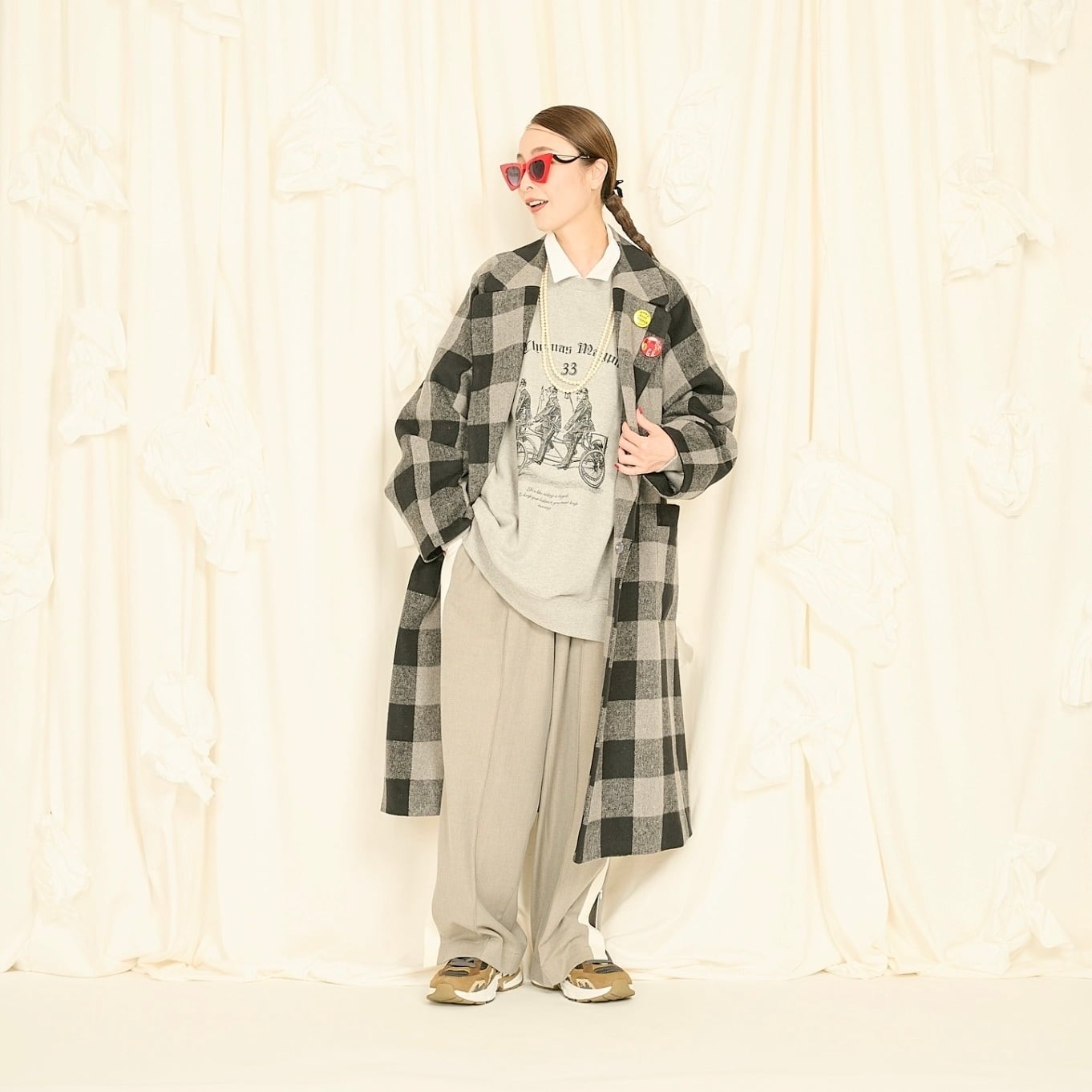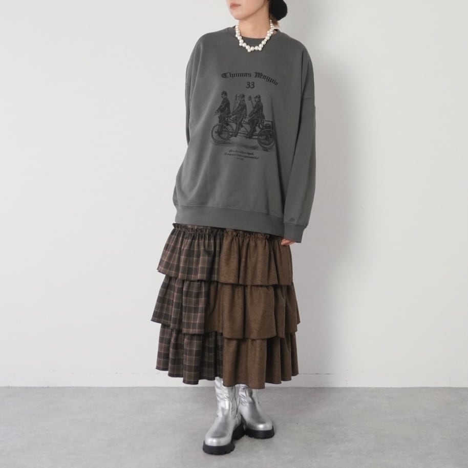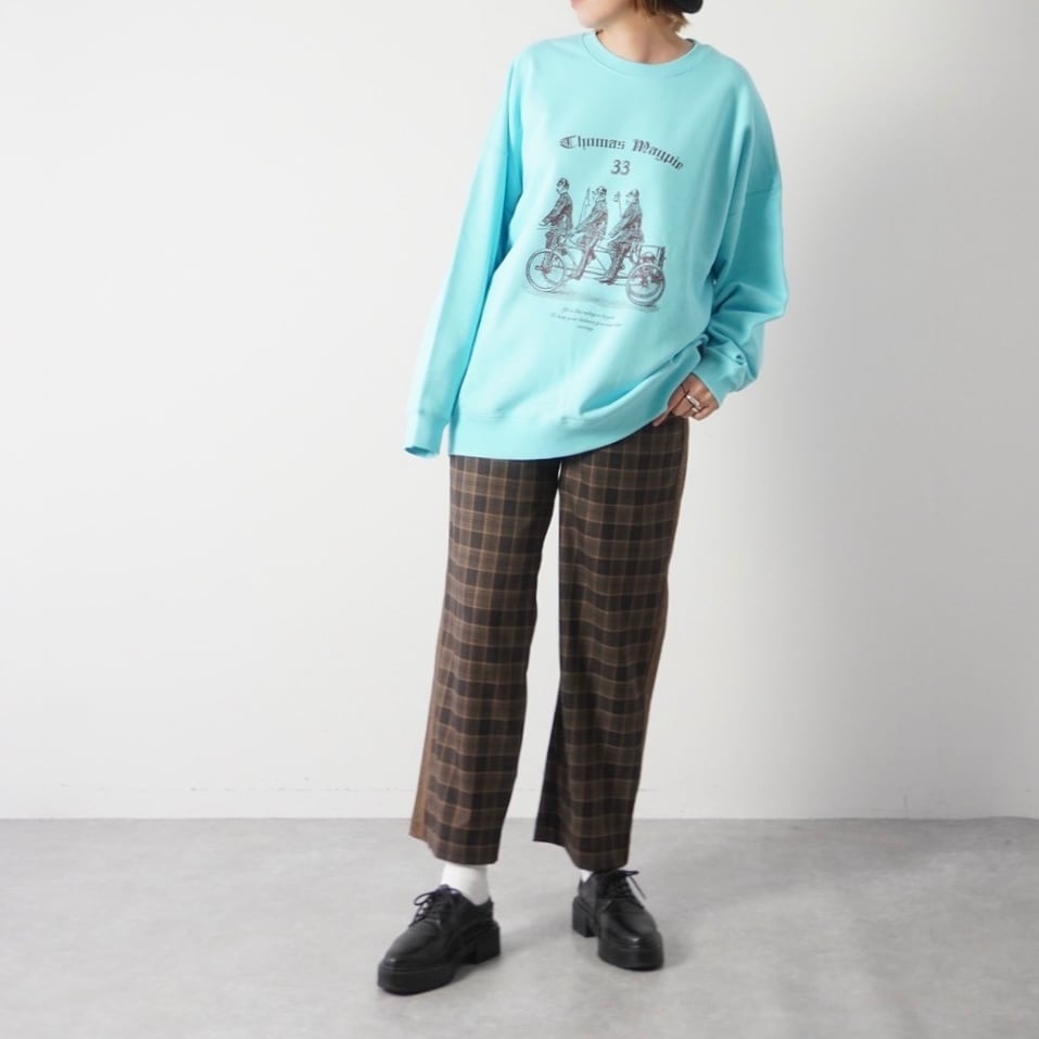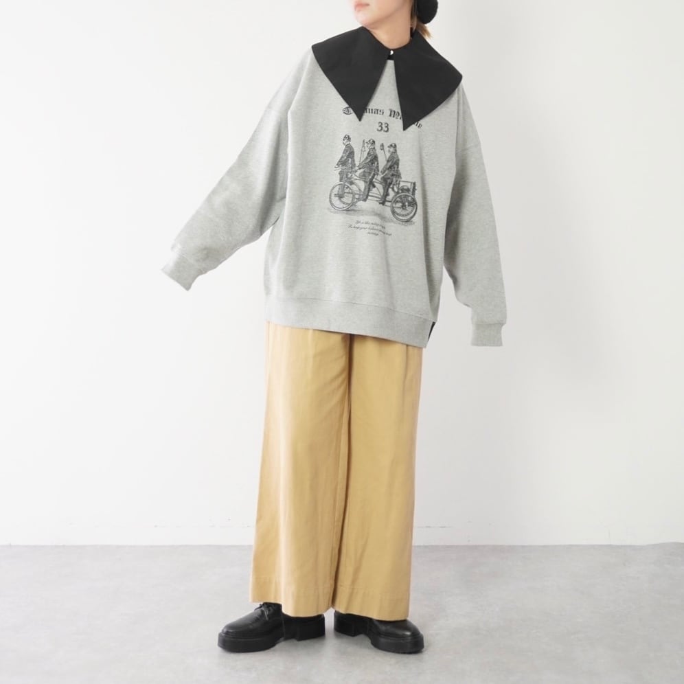 自転車に乗る男性のクラシカルなグラフィックと「33」のコレクションナンバー入りで、テーマ「NOT BORE」に沿った遊び心と人生のバランスを表現。着丈は長めでワンピース風にも、タイトスカートとのコーディネートも◎。しっかりとしたオリジナルボディで耐久性が高く、長く愛用できる一着です。