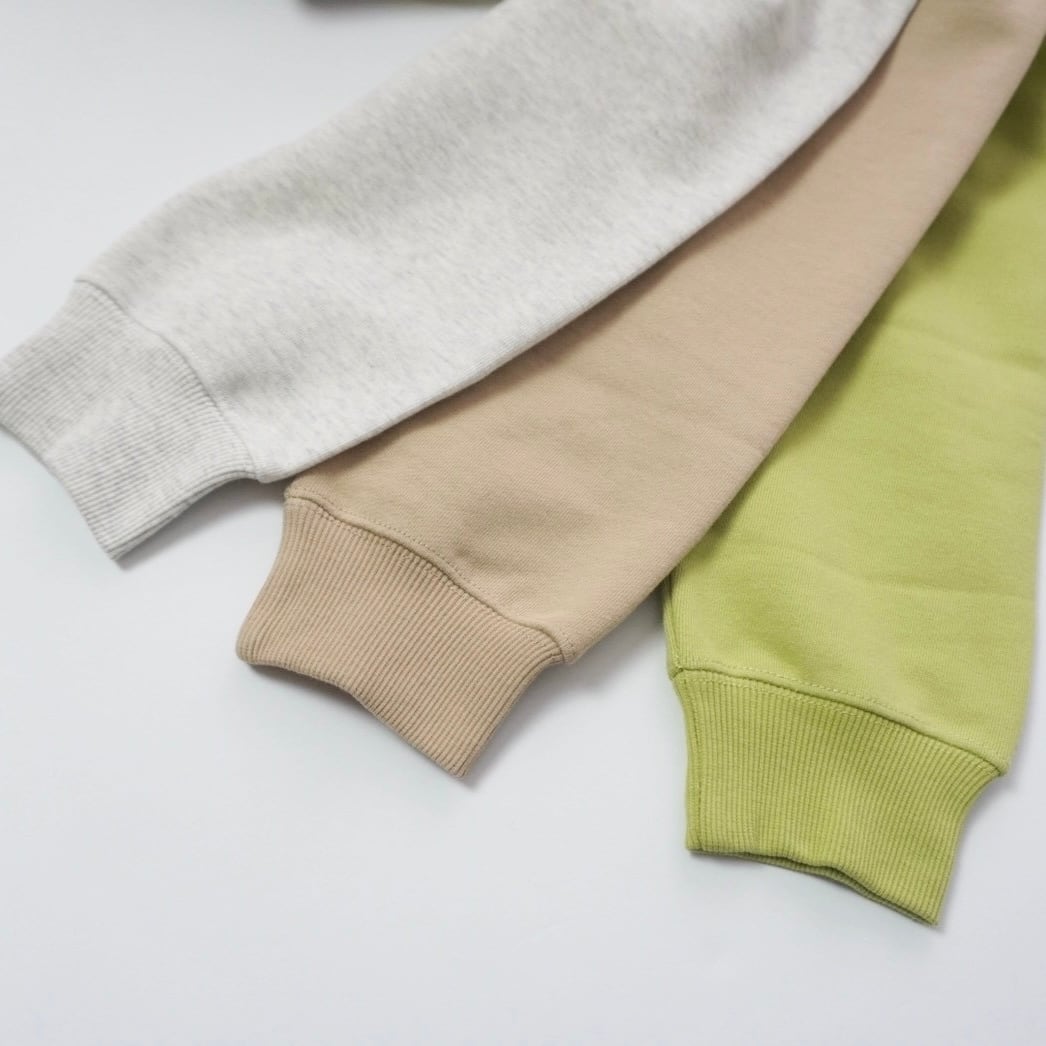 裏毛のコットンポリエステル素材で軽く、伸びが良く耐久性も◎。袖口リブはしっかりしていて、たくし上げやすい仕様です。