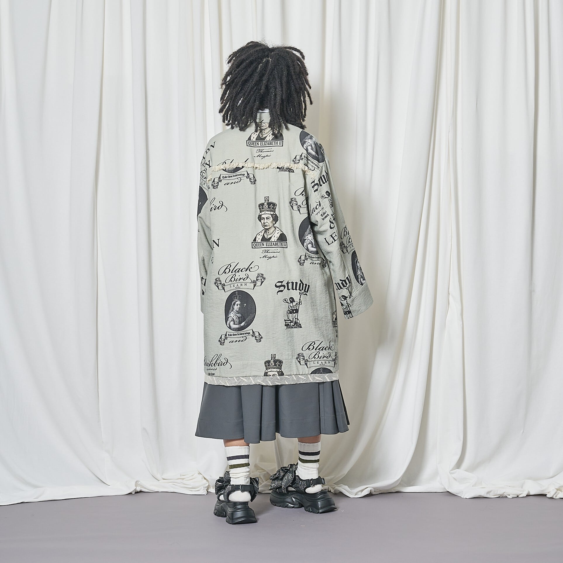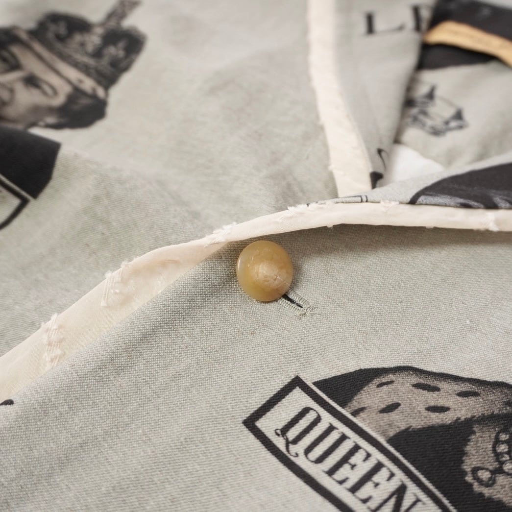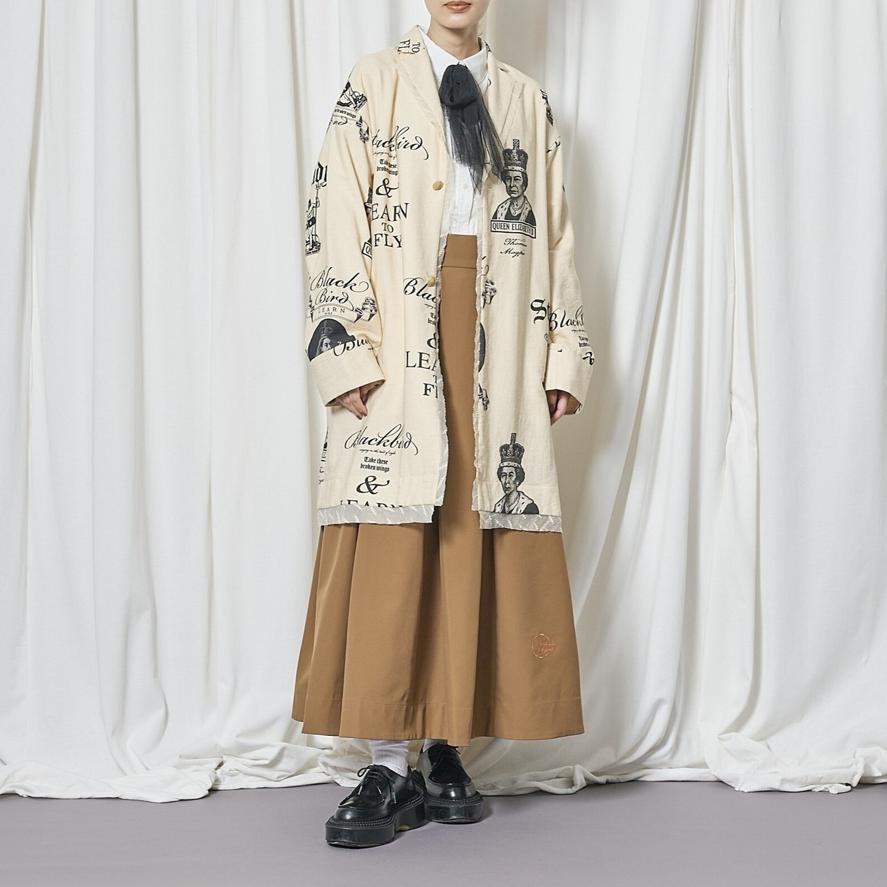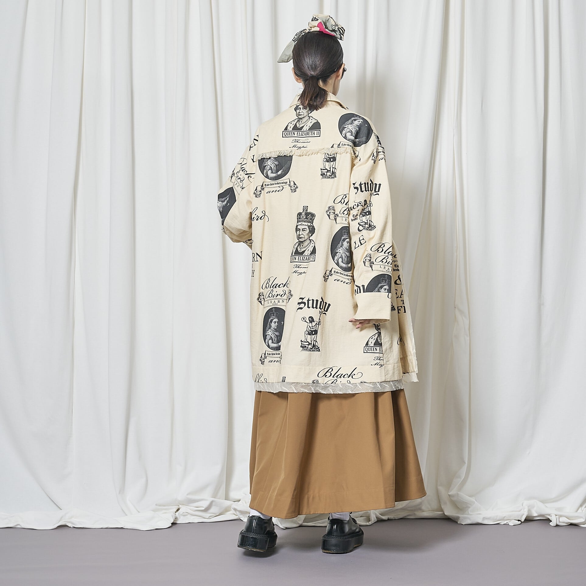 素材はリネン調のコットンリネンナイロン混紡。ブラックのプリントで、ヴィクトリア女王とエリザベス2世、学びへの葛藤を描いたイラスト、そしてビートルズ「Blackbird」の歌詞の一部 “LEARN TO FLY” を表現。