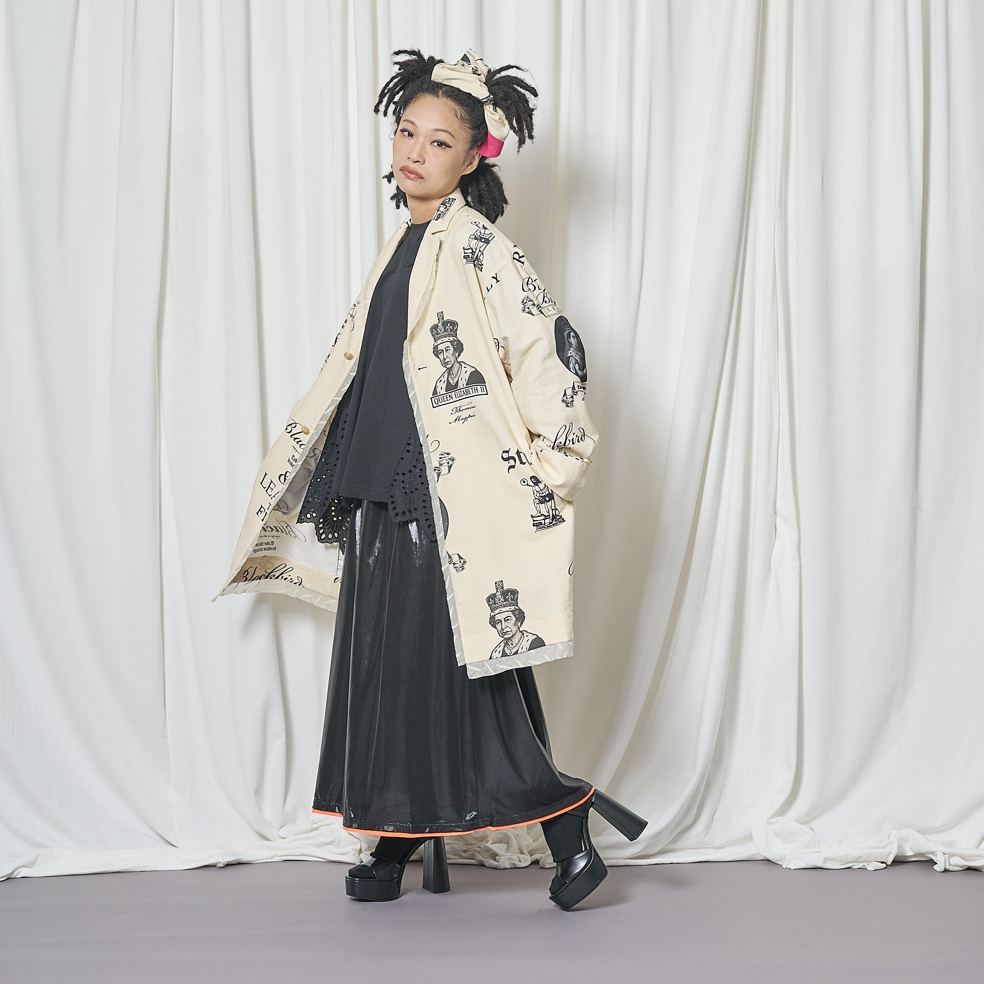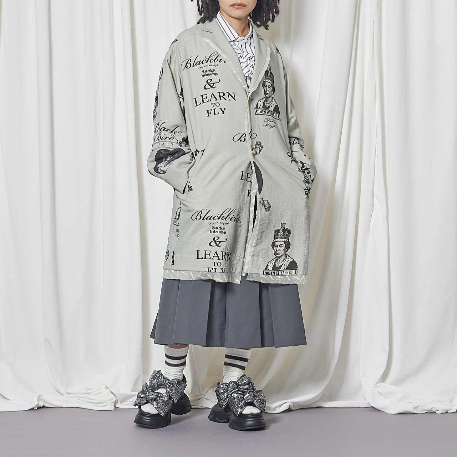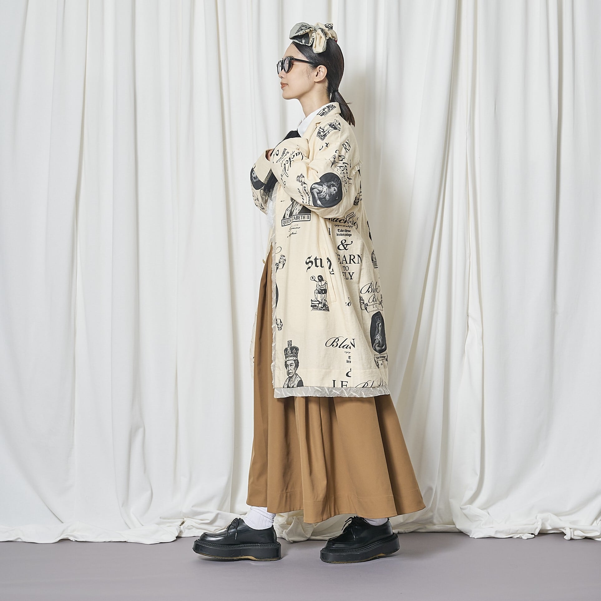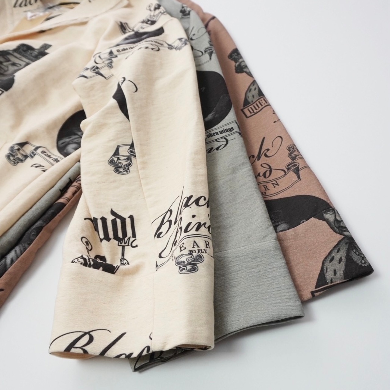素材はリネン調のコットンリネンナイロン混紡。ブラックのプリントで、ヴィクトリア女王とエリザベス2世、学びへの葛藤を描いたイラスト、そしてビートルズ「Blackbird」の歌詞の一部 “LEARN TO FLY” を表現。