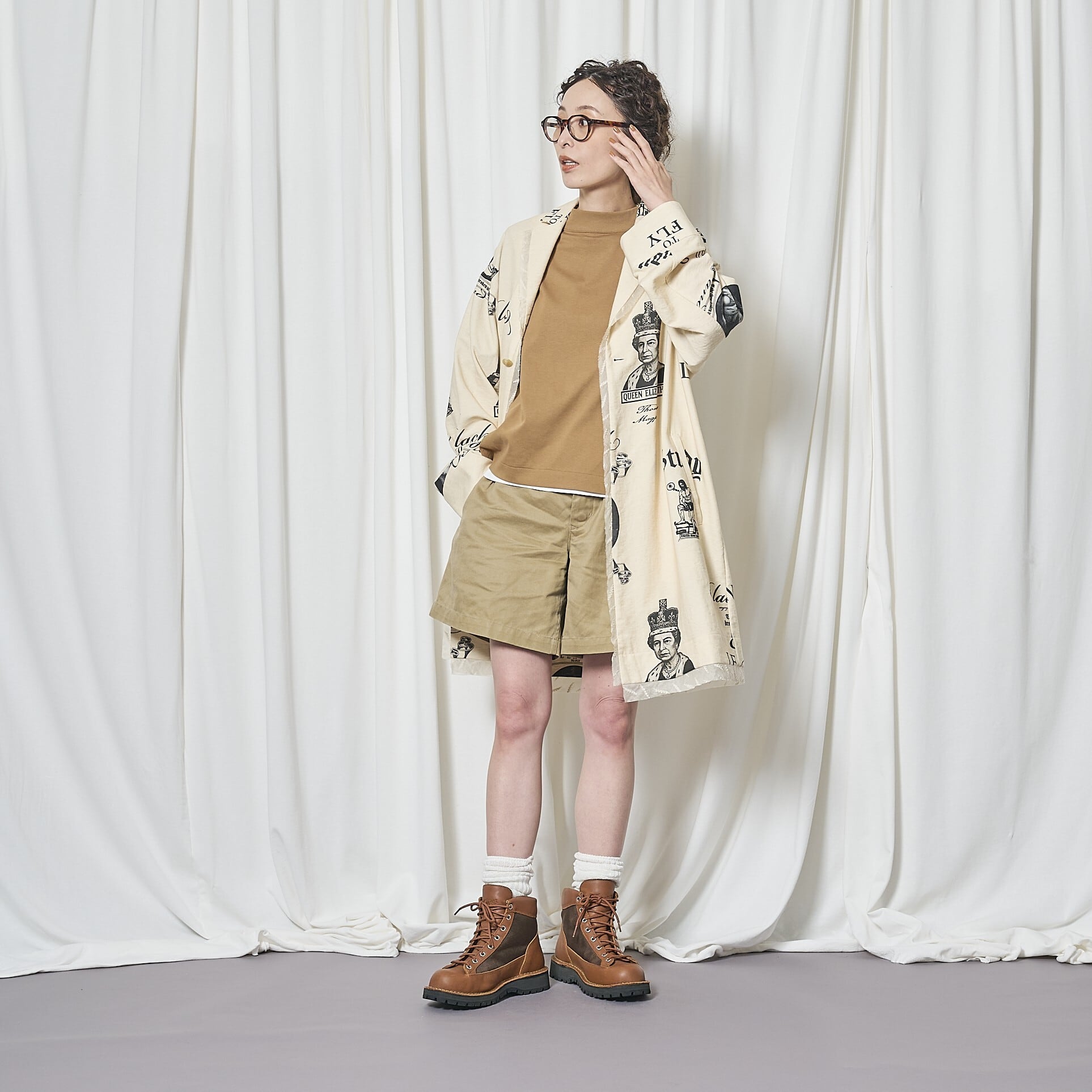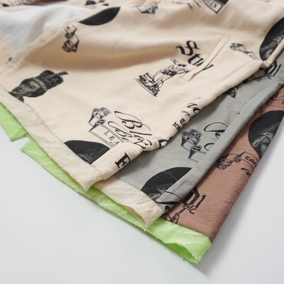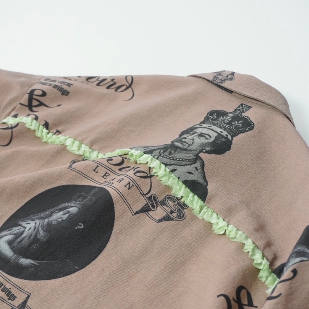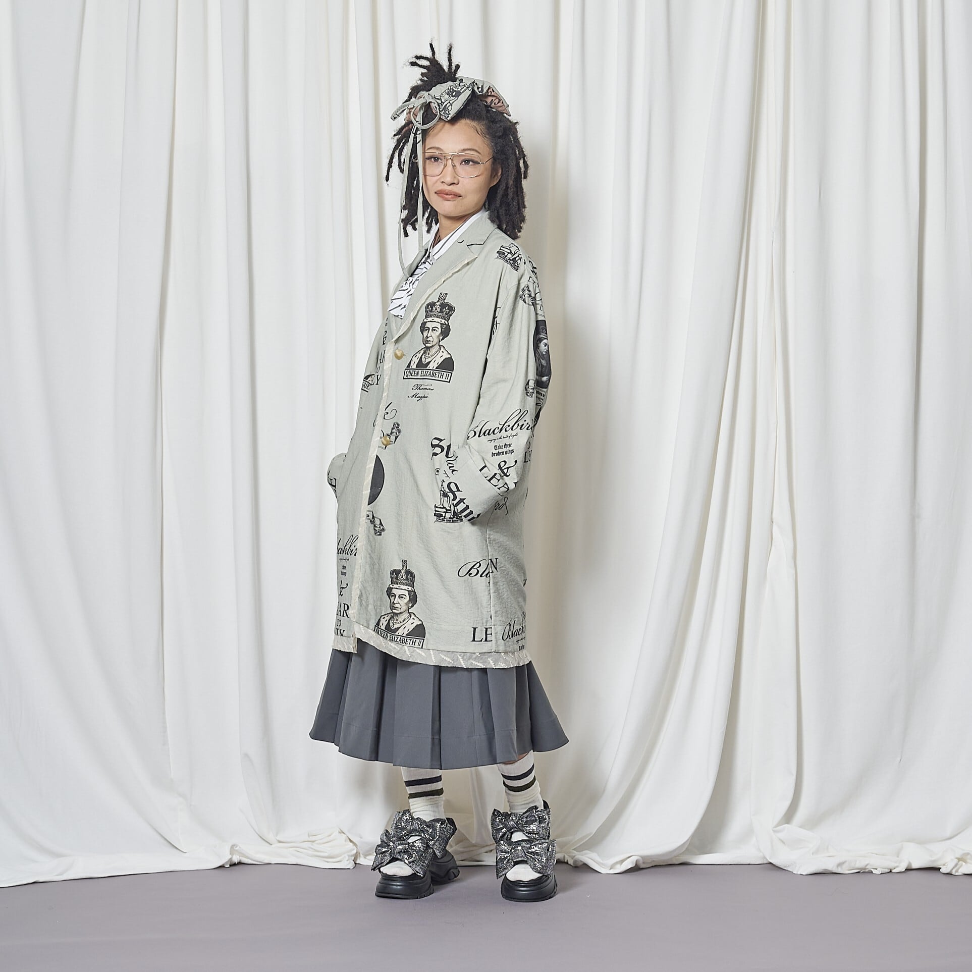 素材はリネン調のコットンリネンナイロン混紡。ブラックのプリントで、ヴィクトリア女王とエリザベス2世、学びへの葛藤を描いたイラスト、そしてビートルズ「Blackbird」の歌詞の一部 “LEARN TO FLY” を表現。