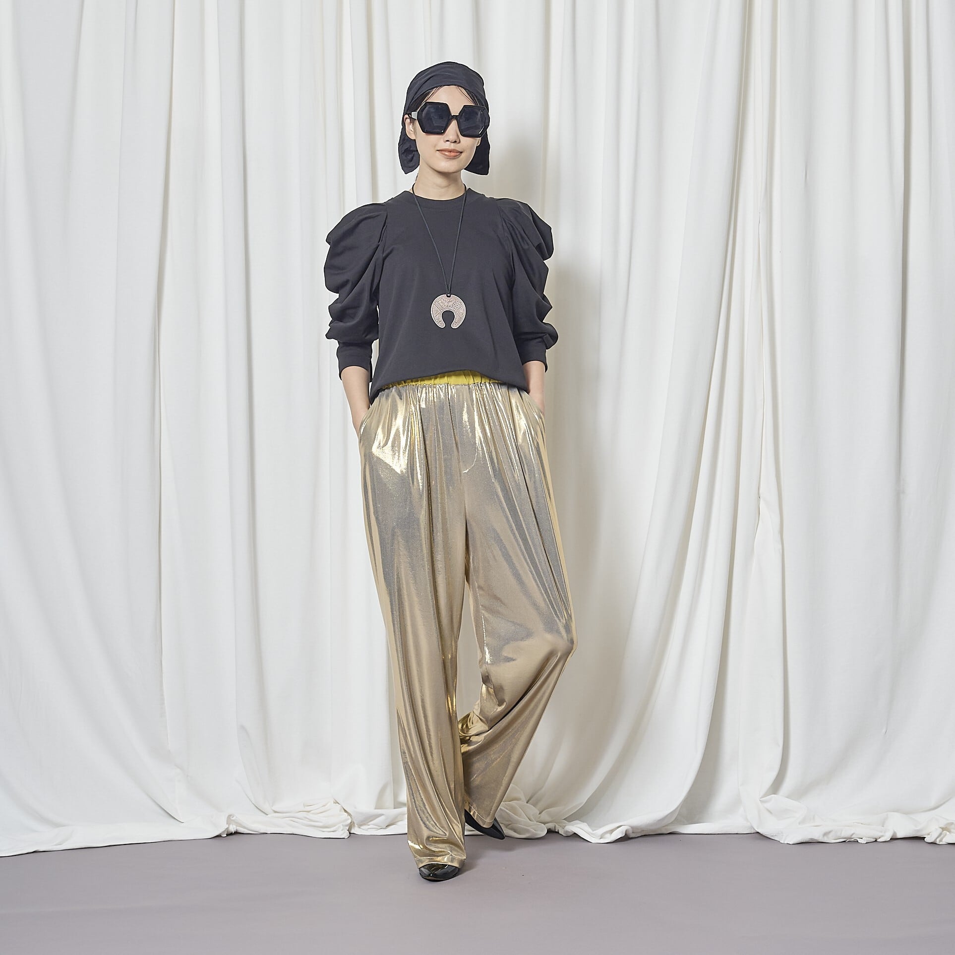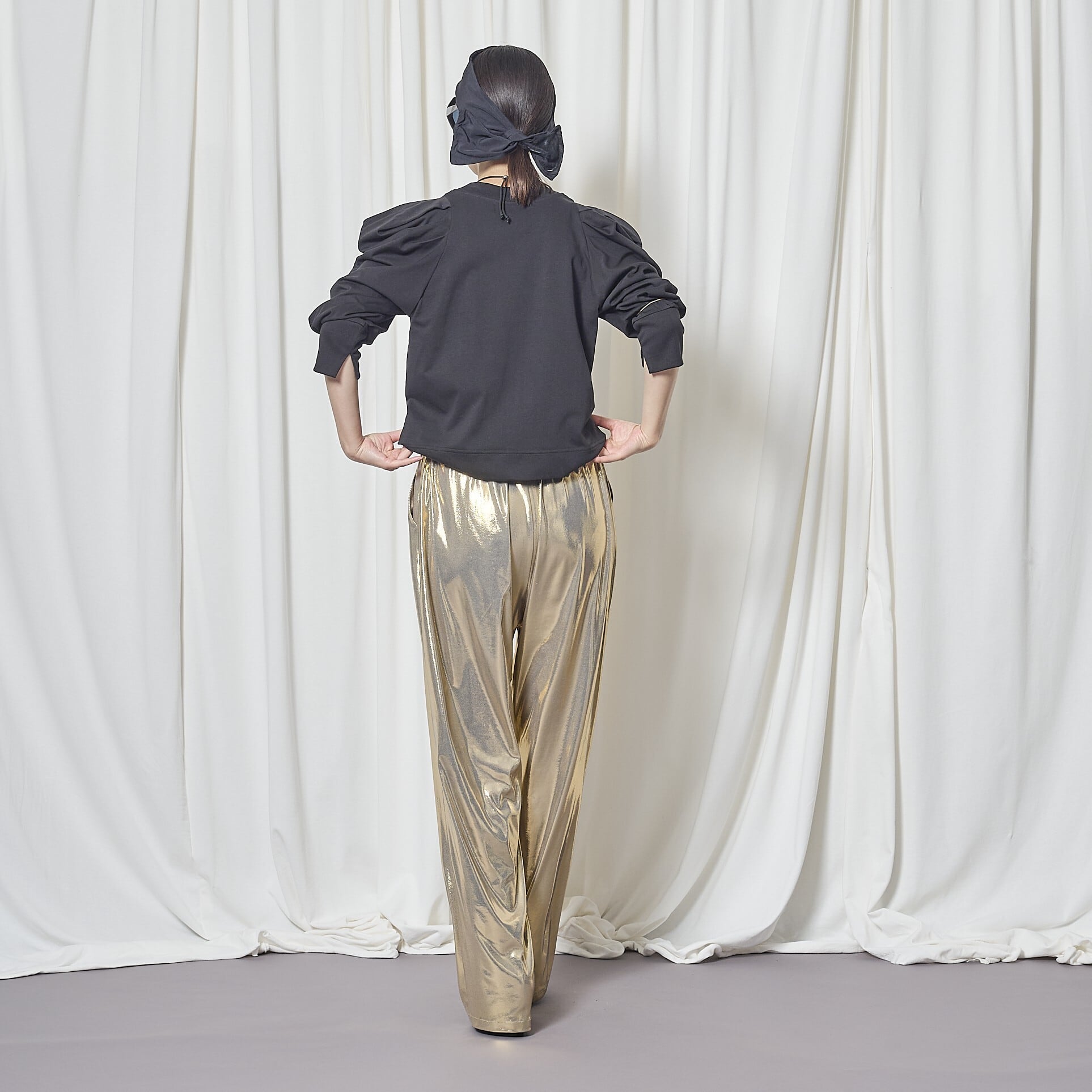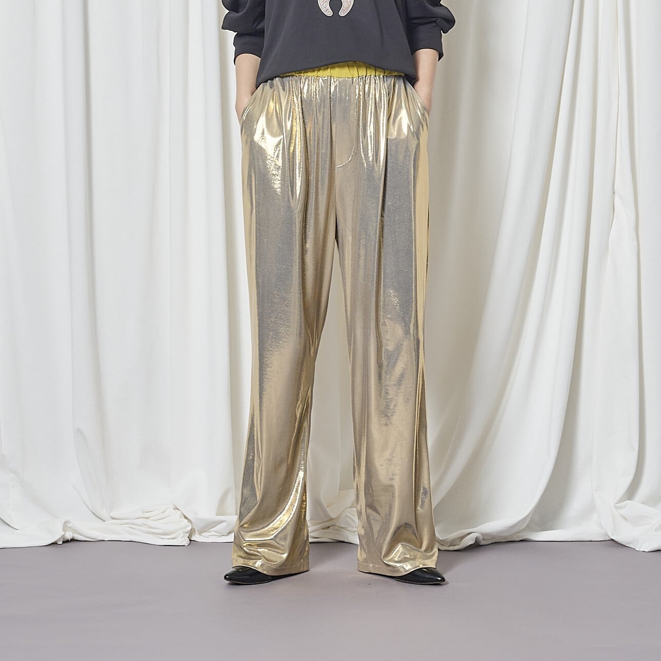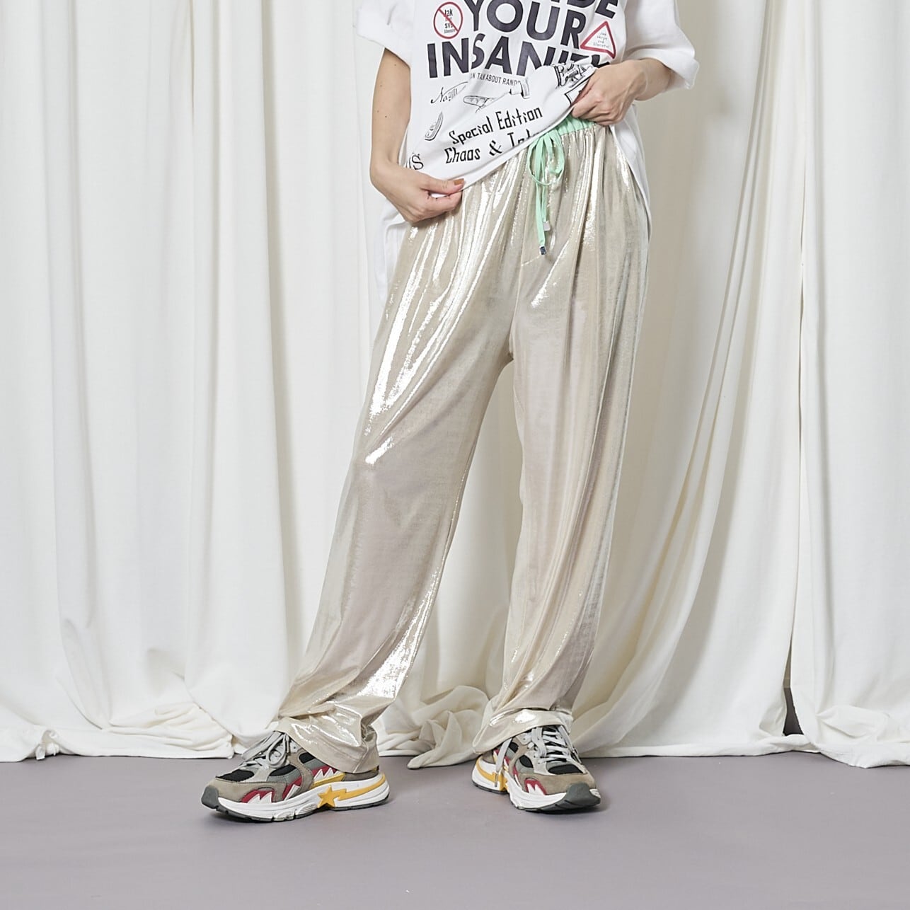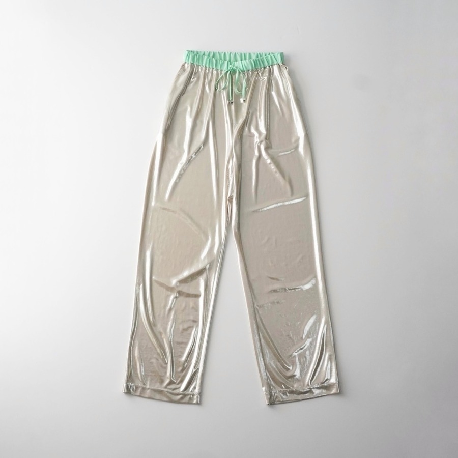 ウエストゴム+ドローストリングで大きく調整できる、ストレッチ性抜群のメタリックパンツ。