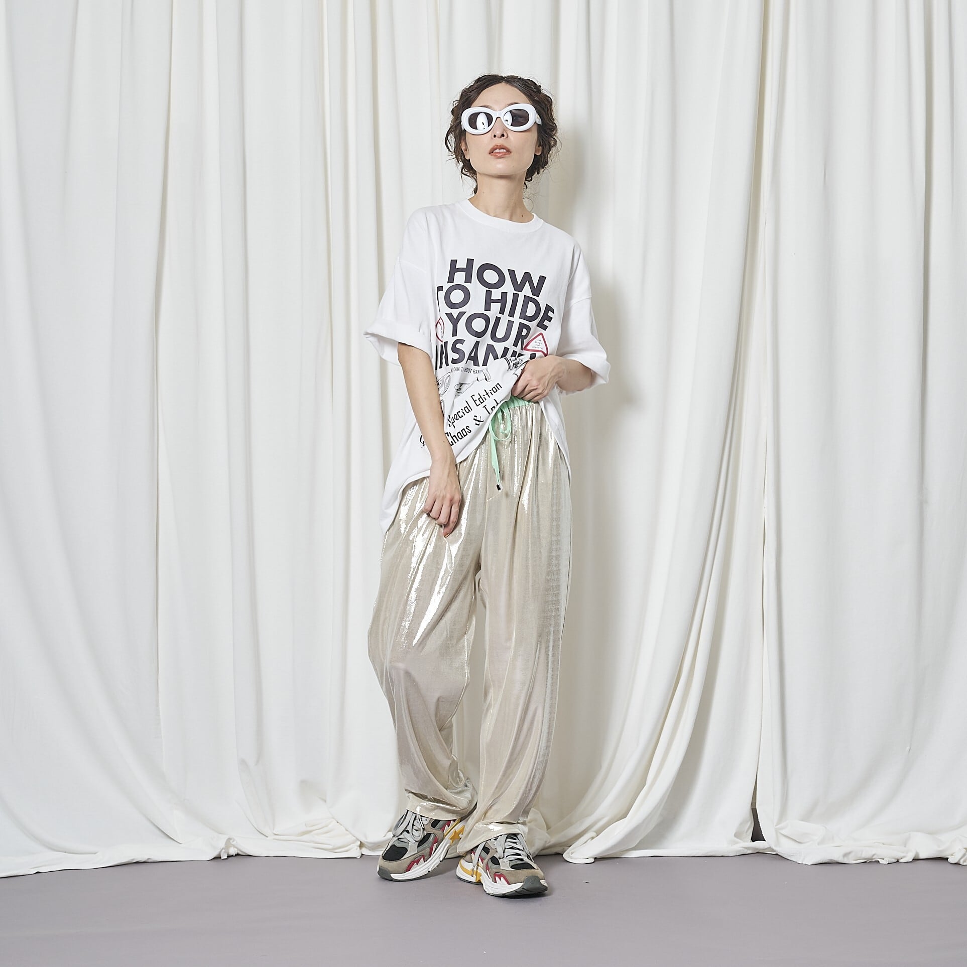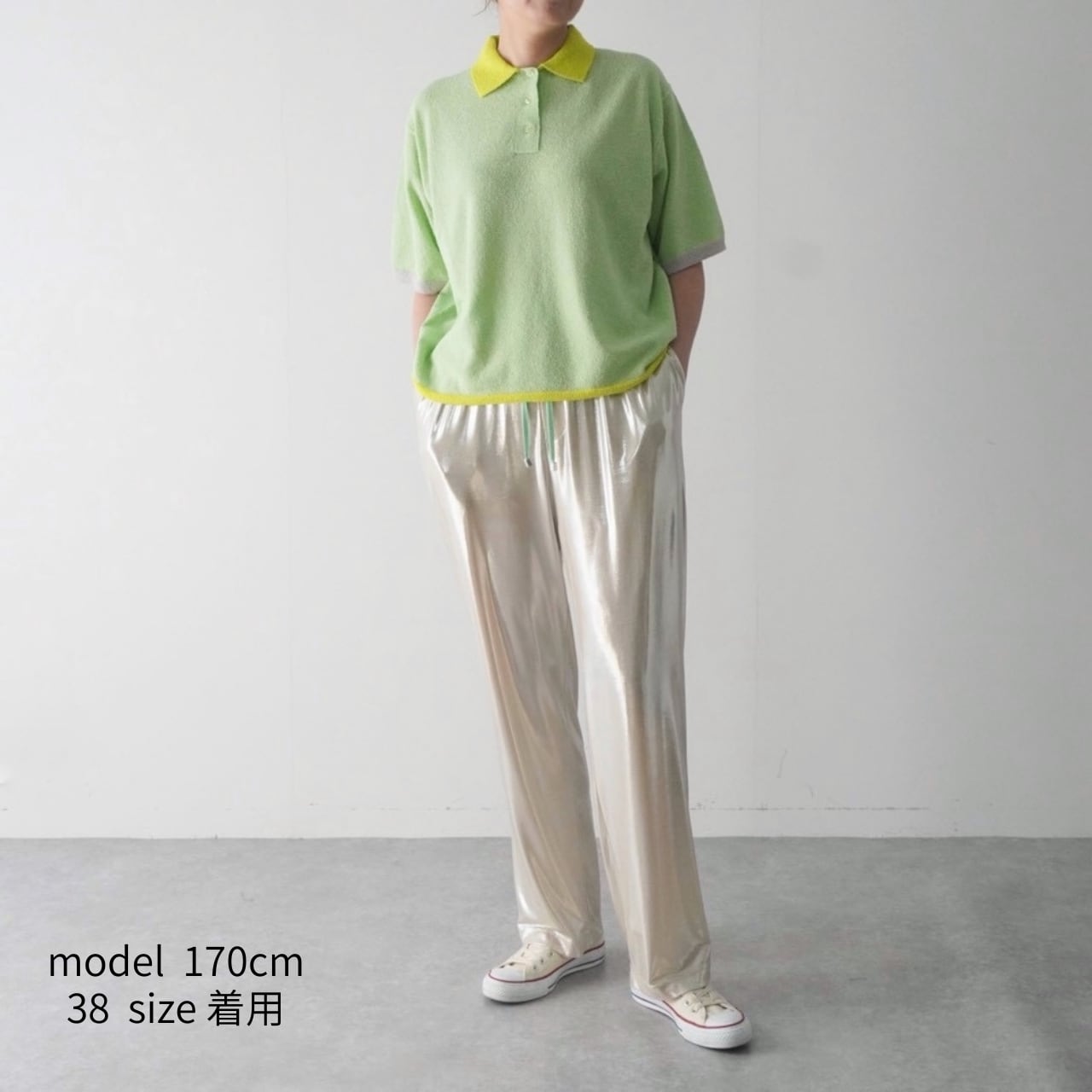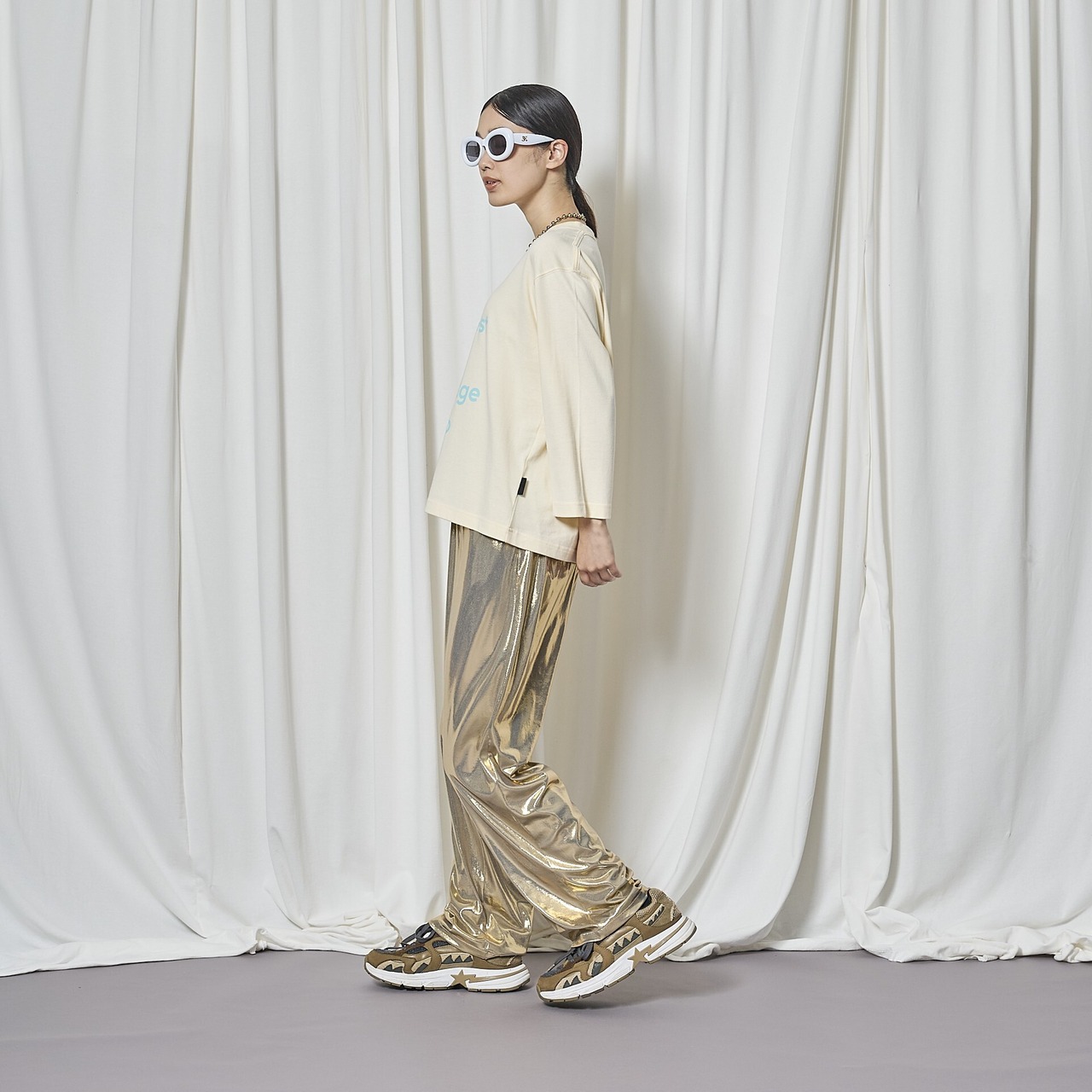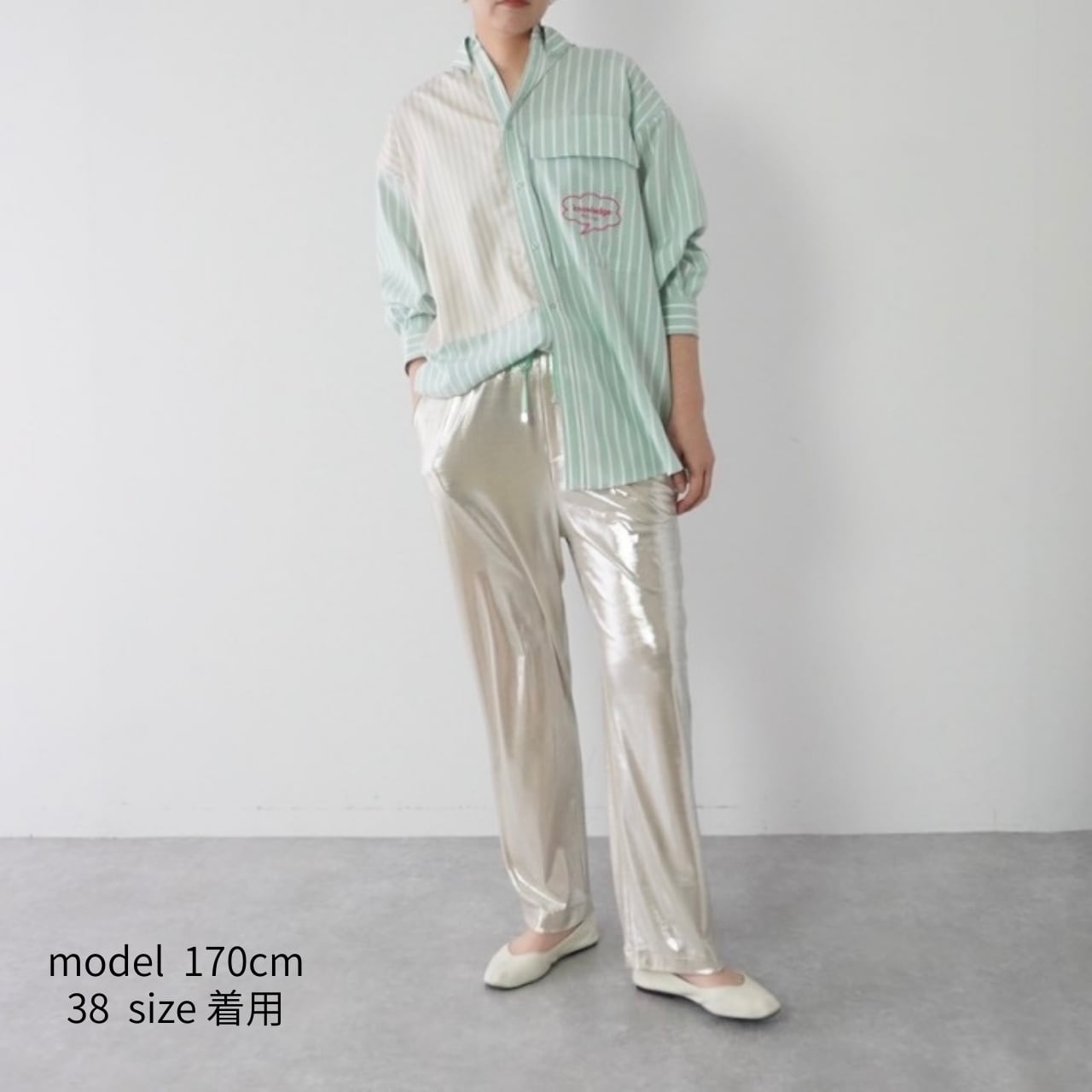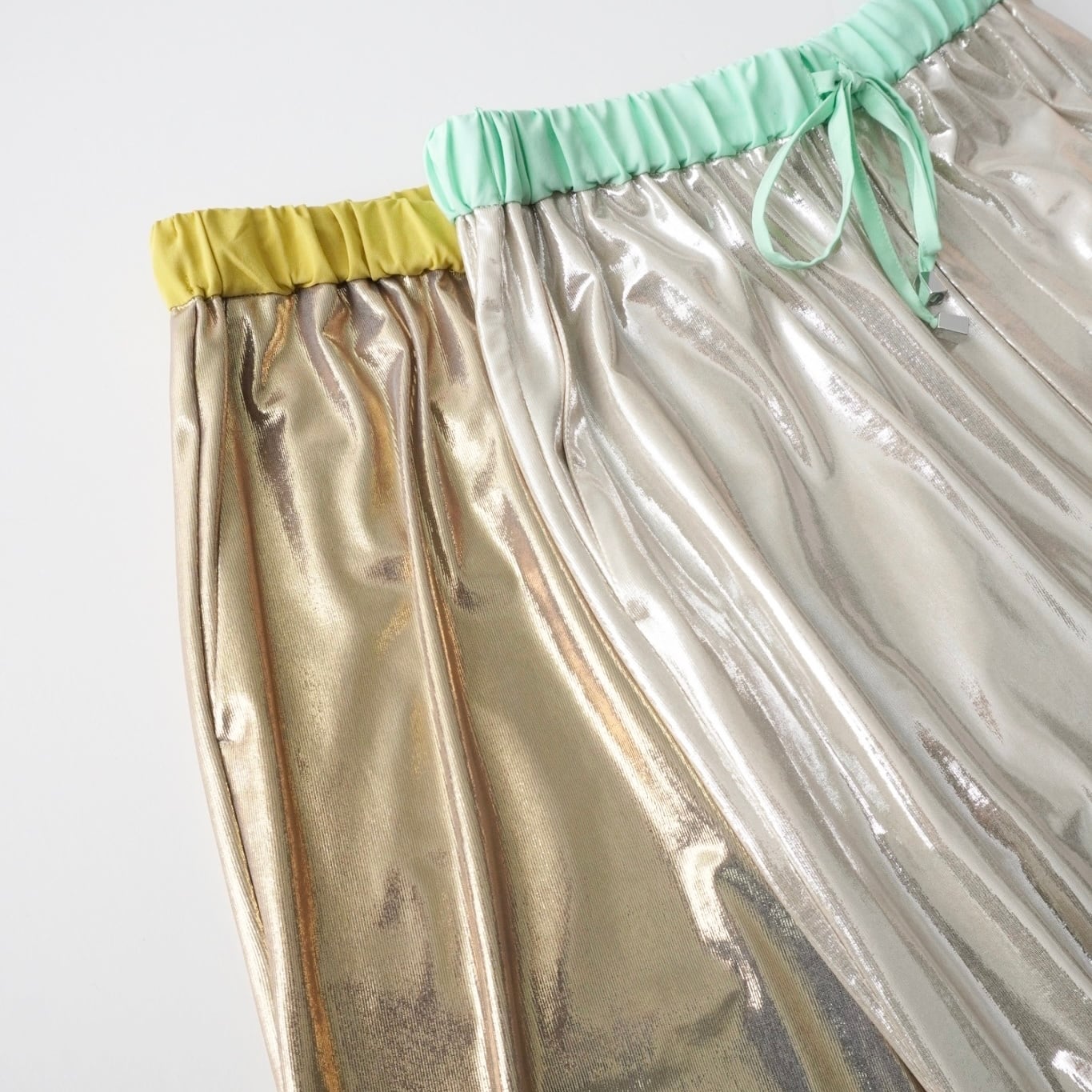ウエストゴム+ドローストリングで大きく調整できる、ストレッチ性抜群のメタリックパンツ。