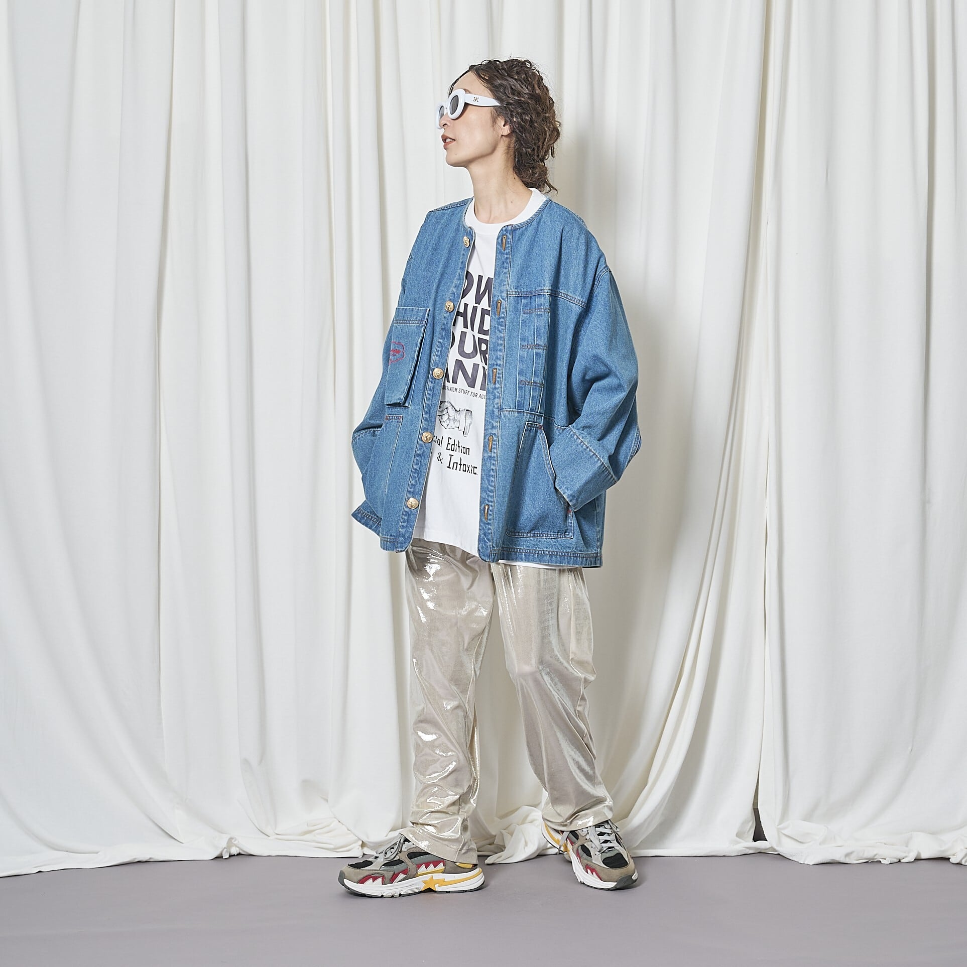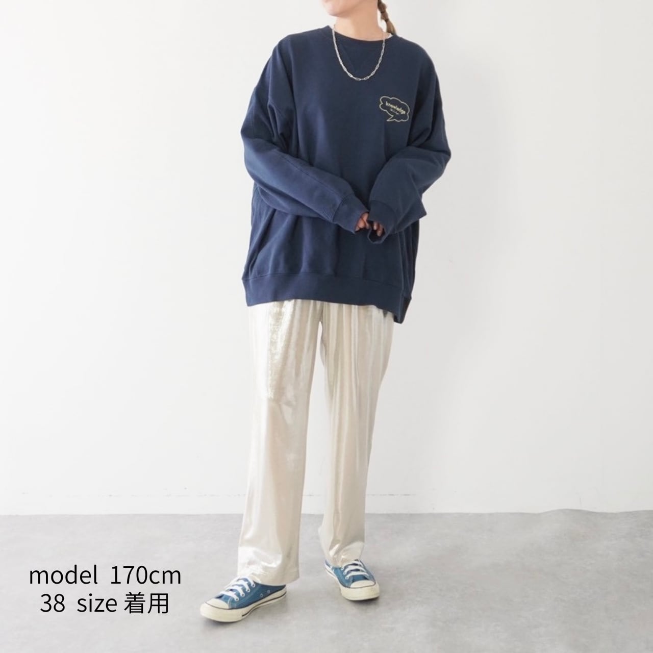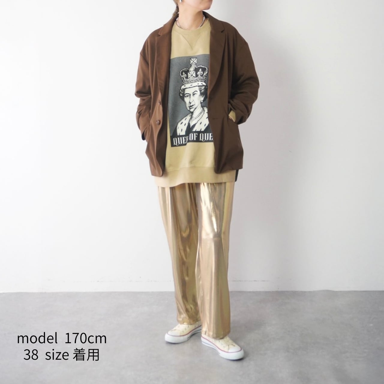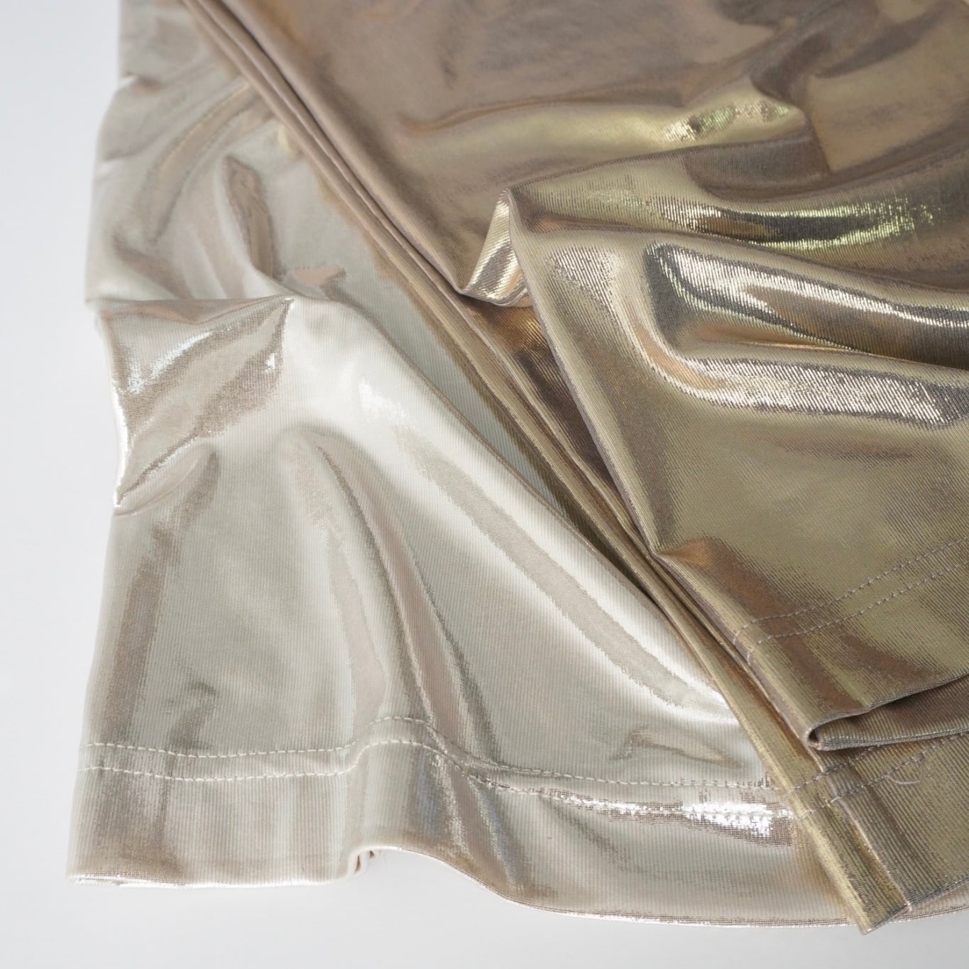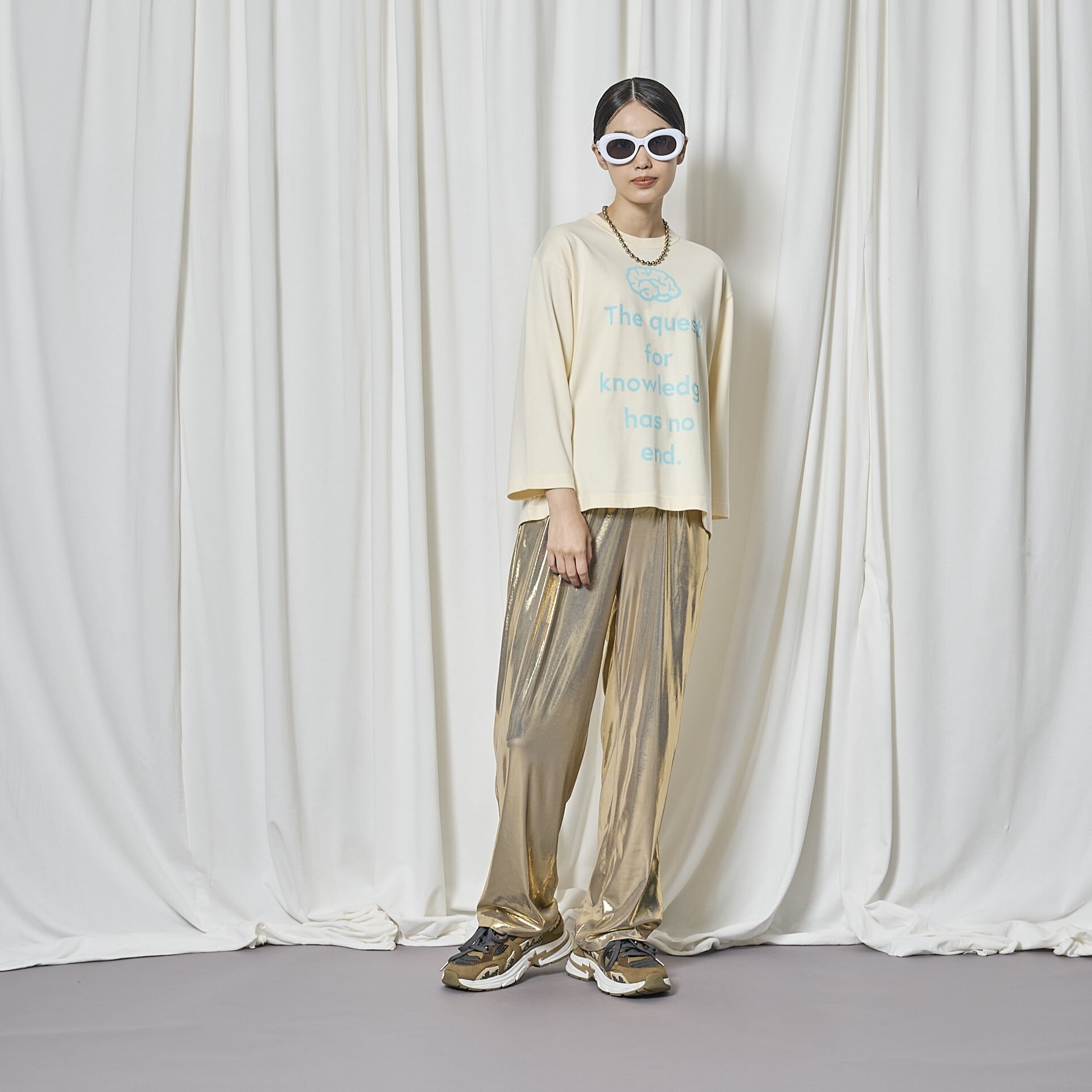 ウエストゴム+ドローストリングで大きく調整できる、ストレッチ性抜群のメタリックパンツ。