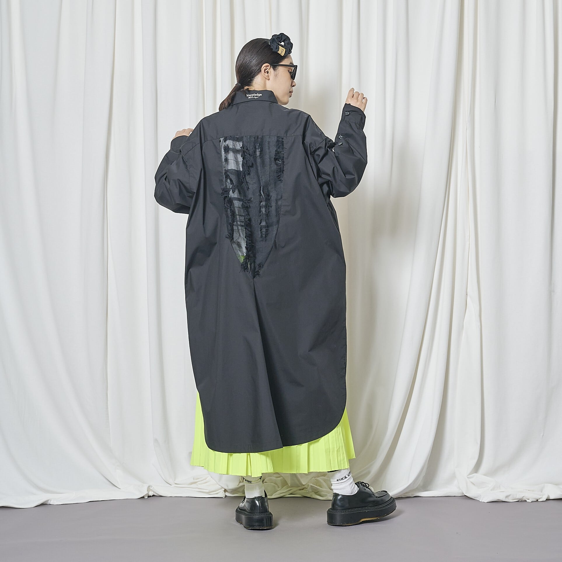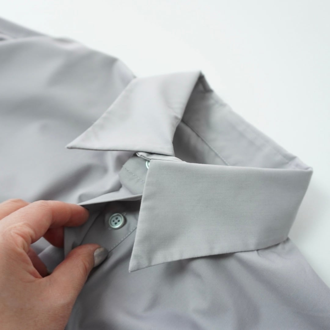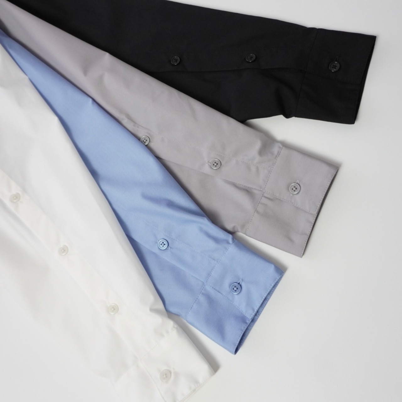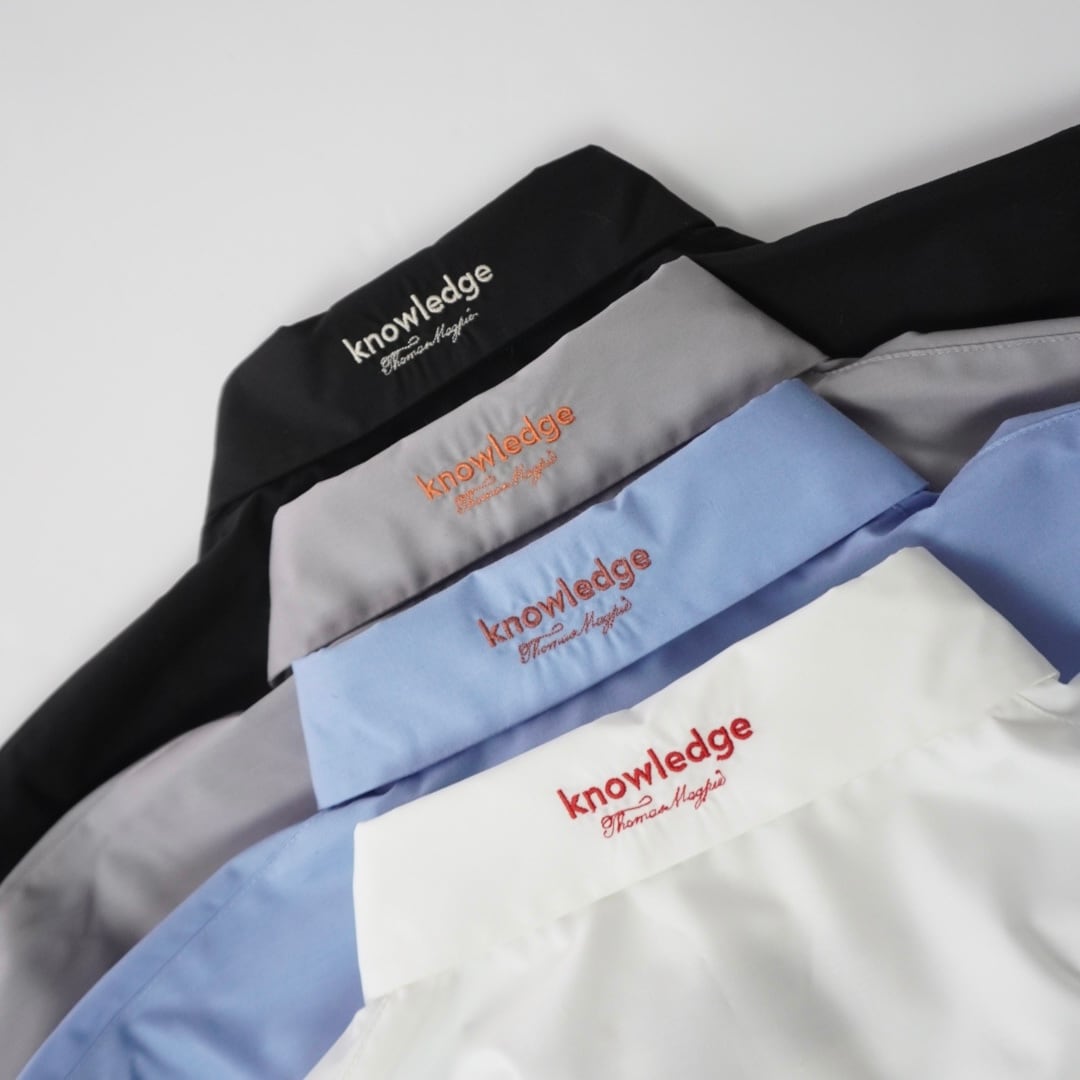 袖はボタンで開閉でき、夏は涼しく調整可能。比翼仕立てのフロントに配色の閂止めステッチ、裾の見返しで上質感をプラス。襟裏には「KNOWLEDGE」の刺繍入りです。