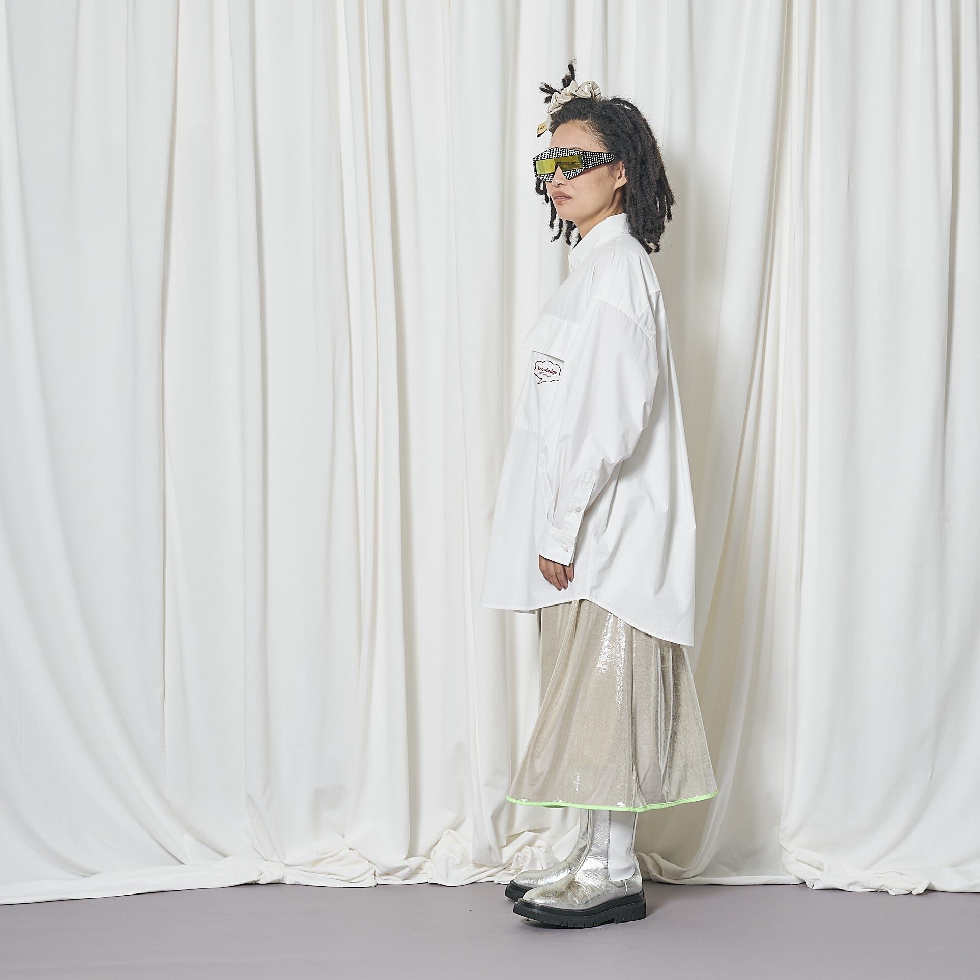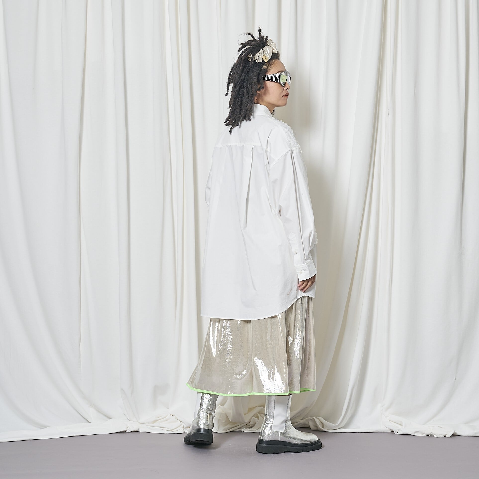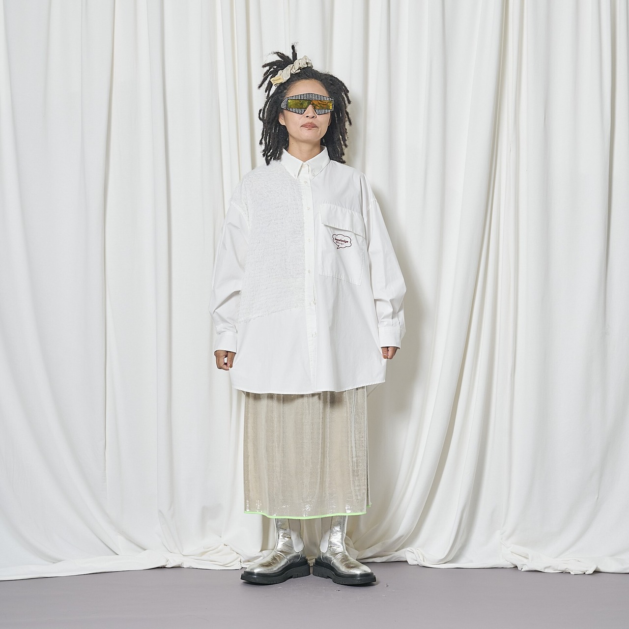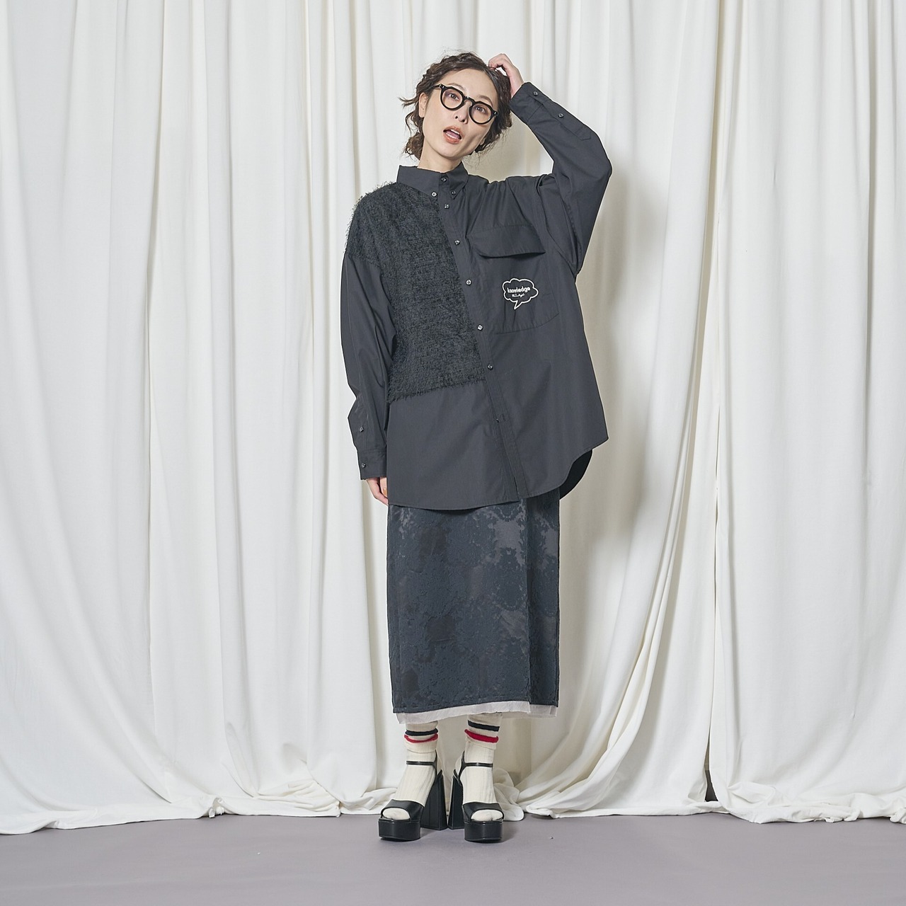 異素材使いがアクセントになったデザインシャツ。
