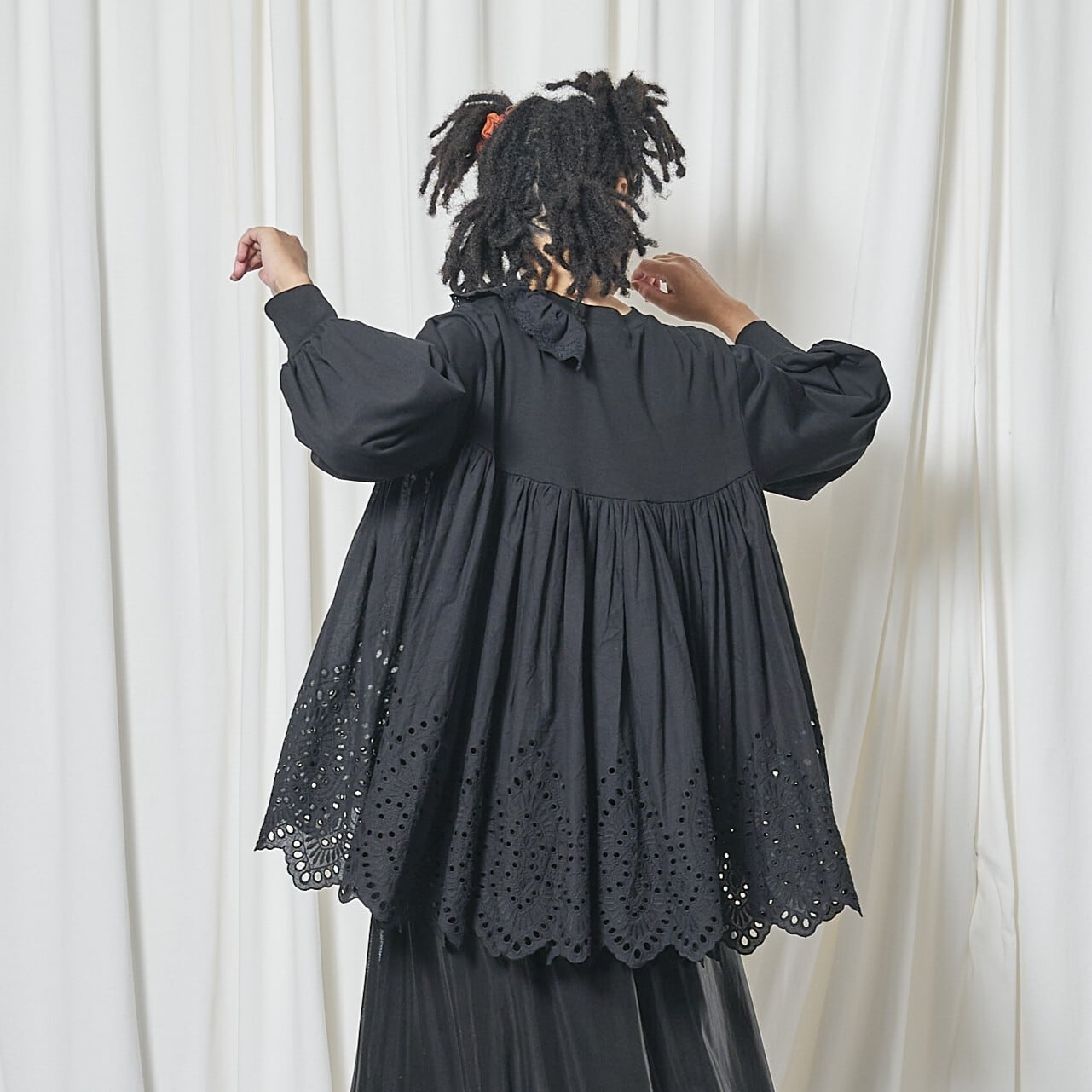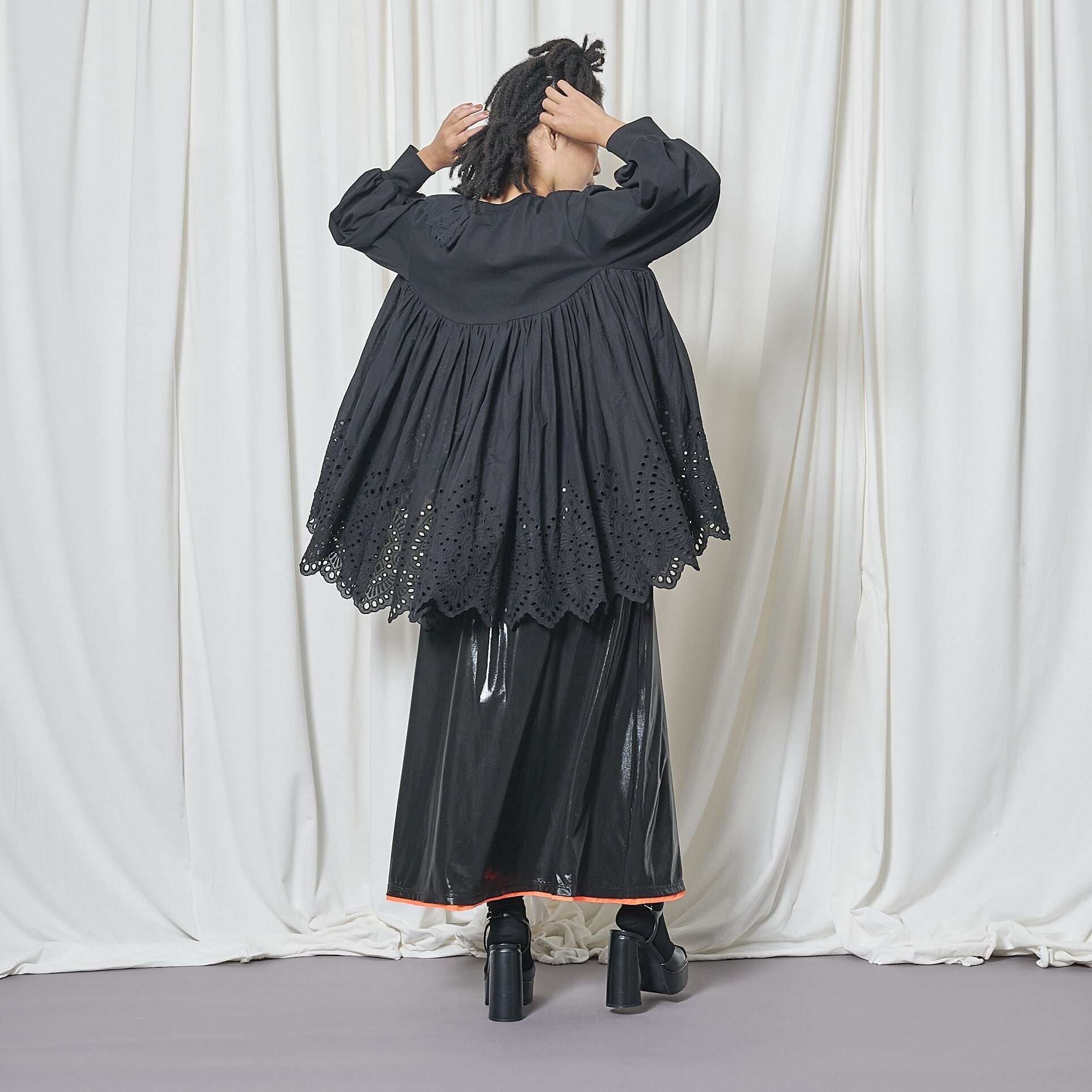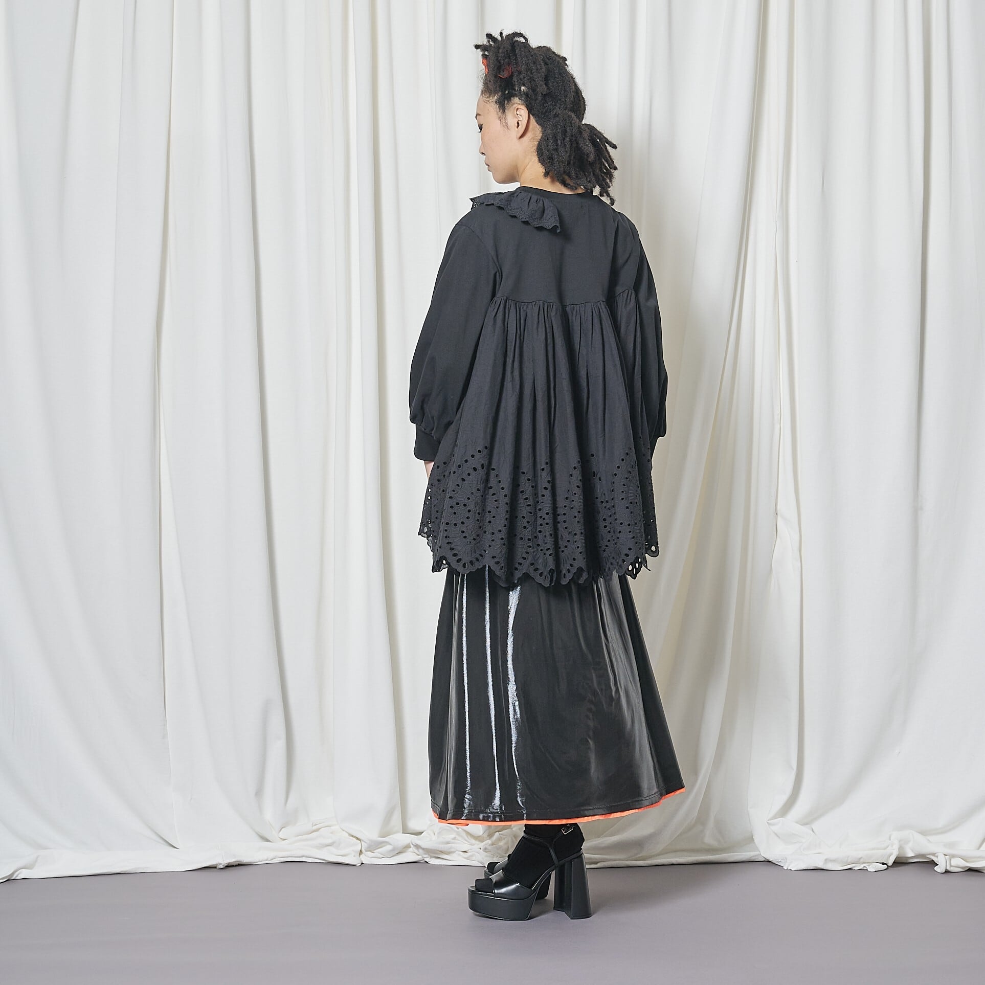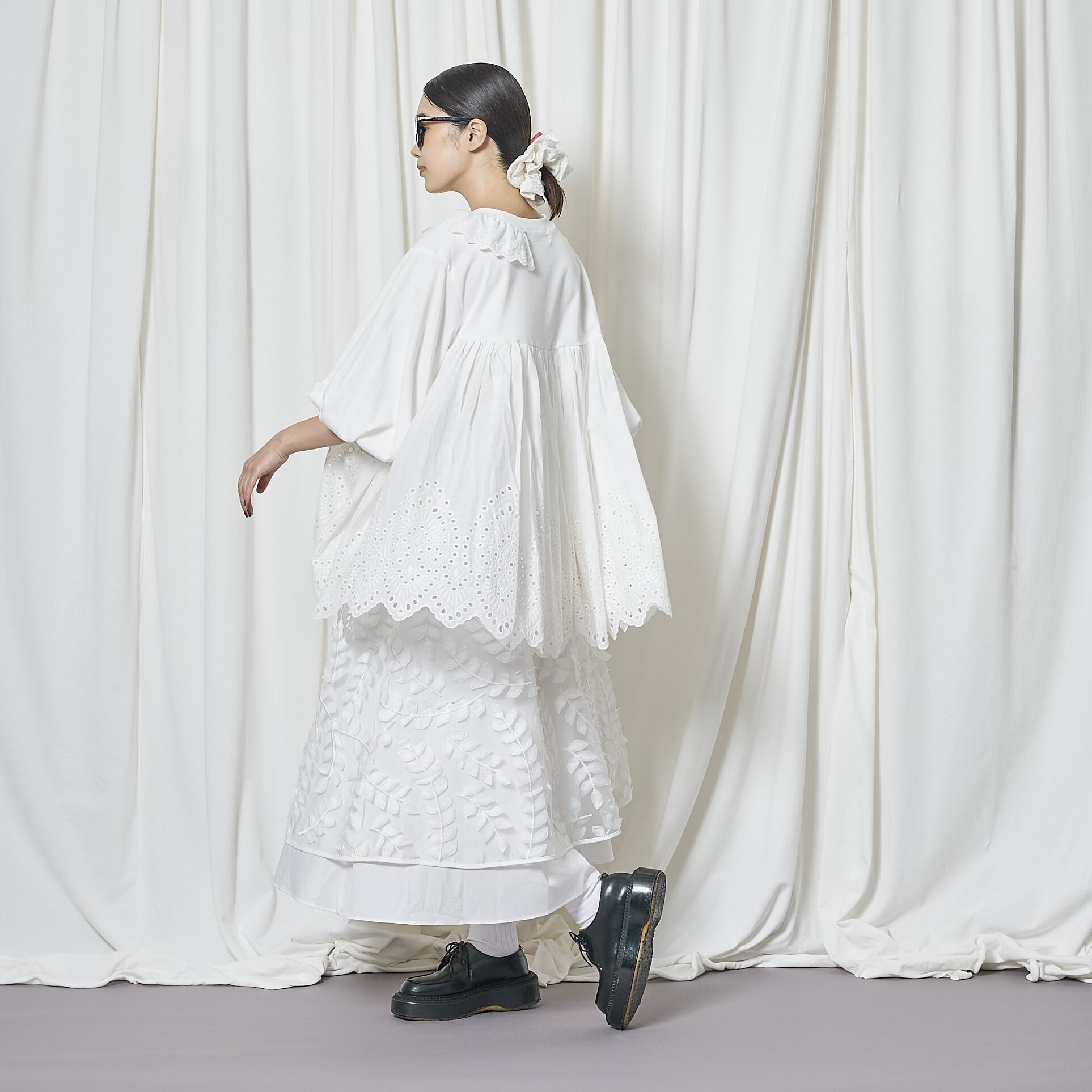 ゆったりとしたシルエットで体のラインを拾いにくく、1枚で主役になる存在感。
