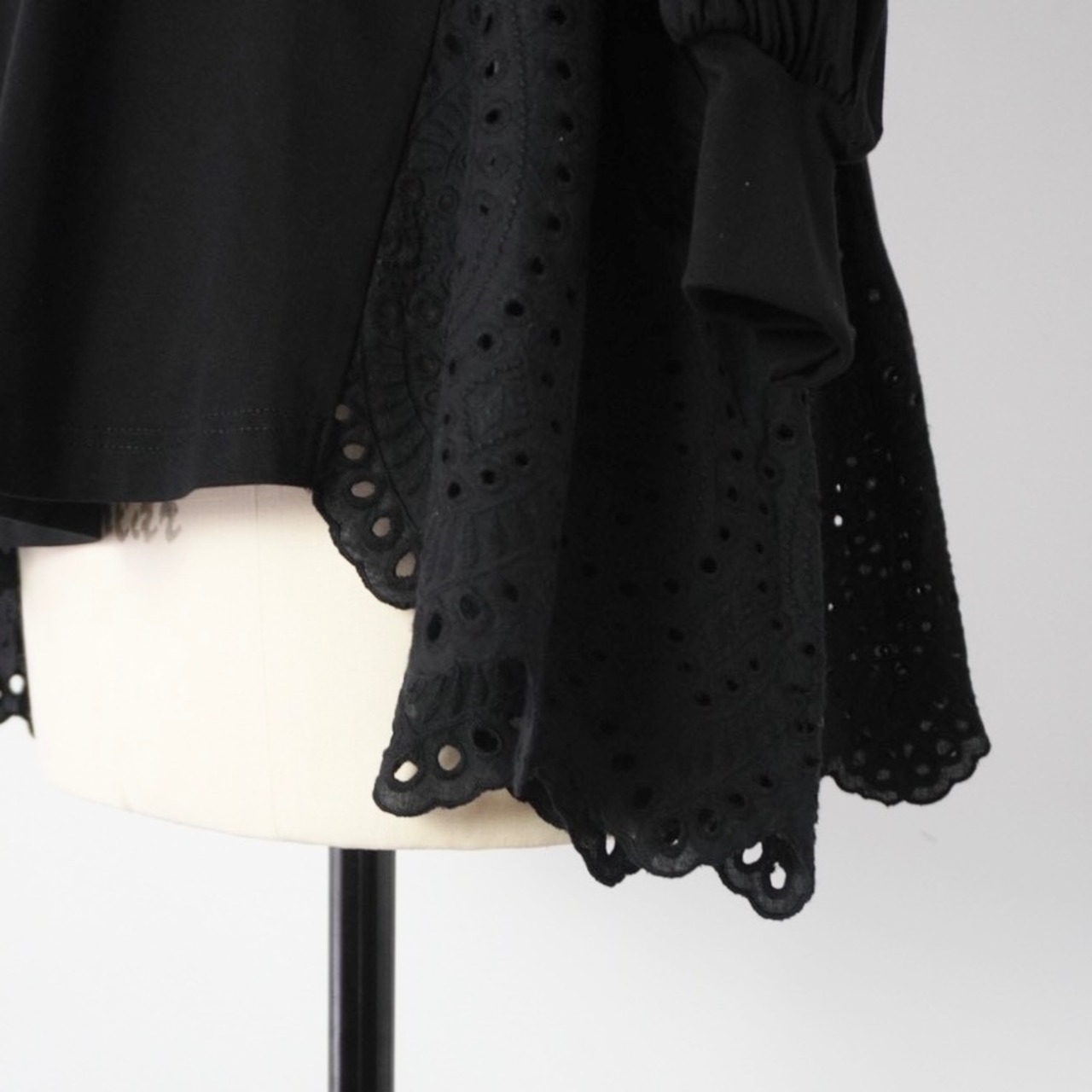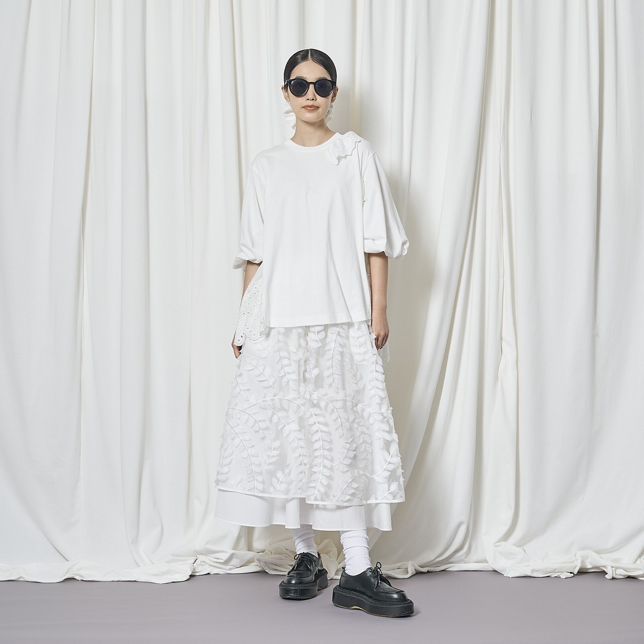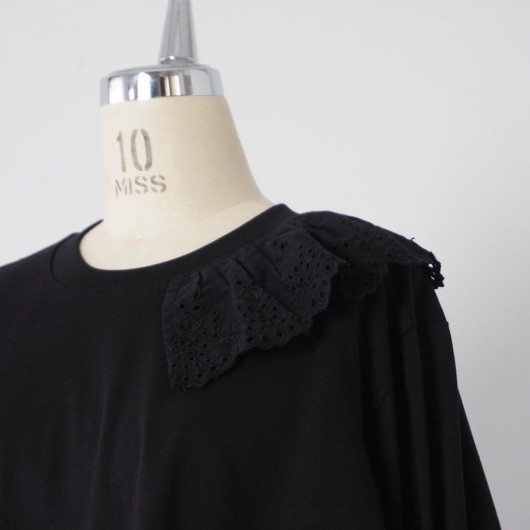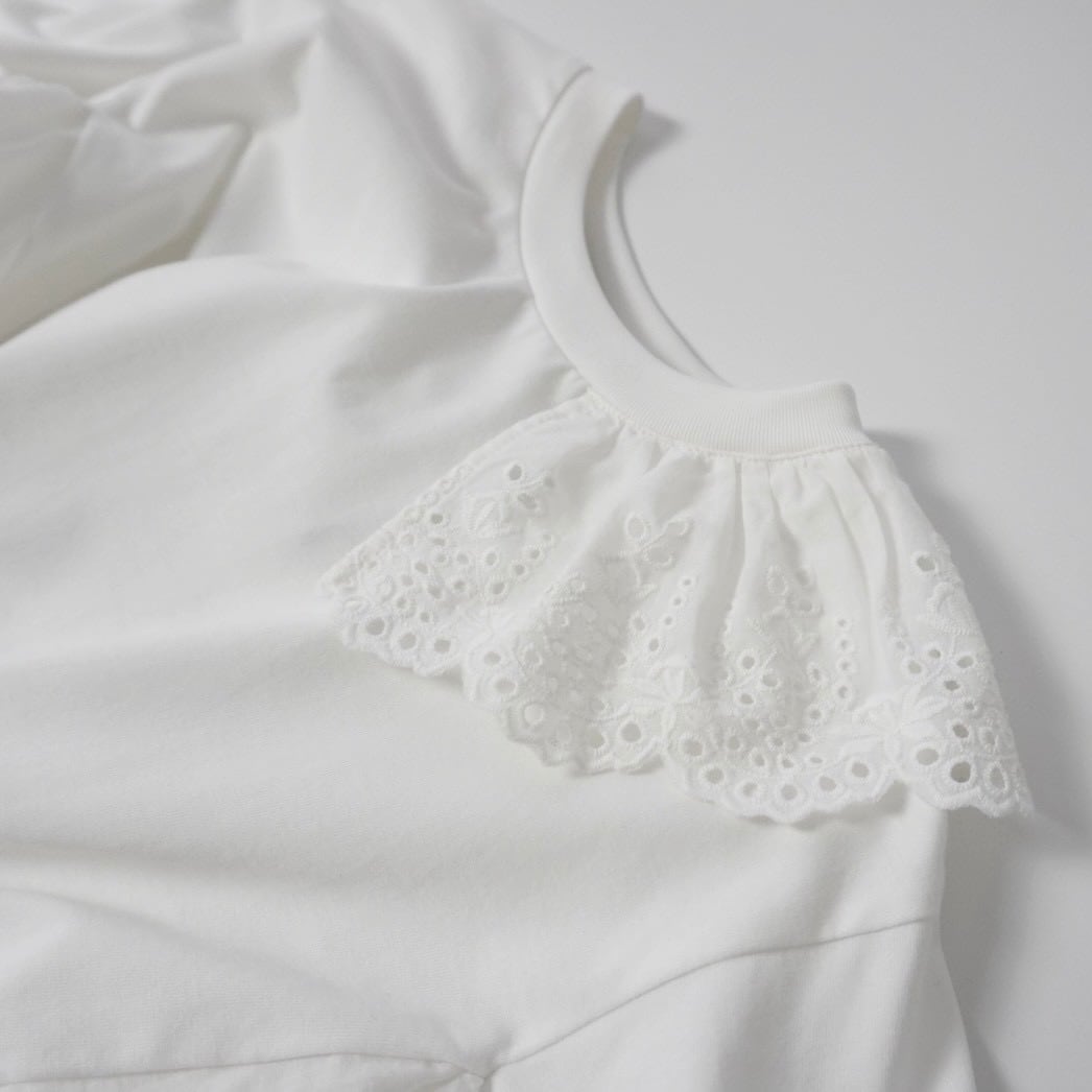 背中一面に施された繊細なレースが、動くたびに表情を生み、カジュアルなTシャツを上品な印象へと昇華します。