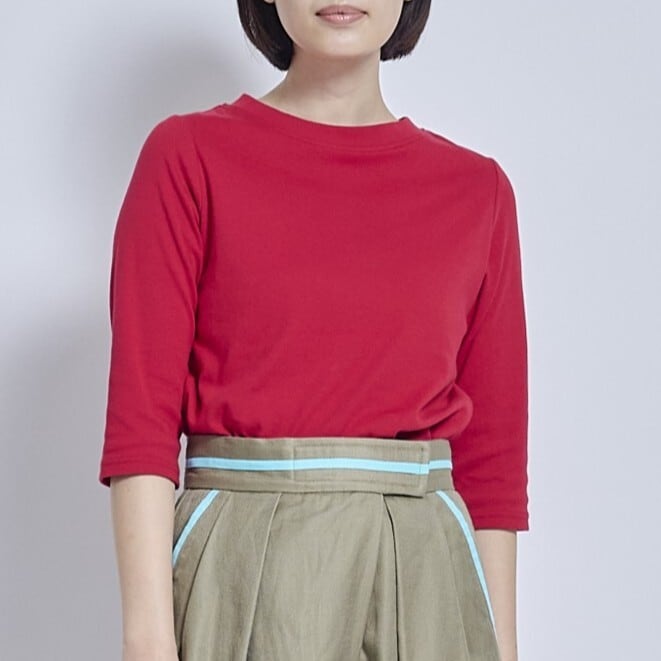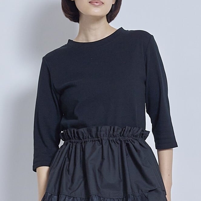 シンプルでコンパクトに見えるストレッチ素材のミニカットソー。