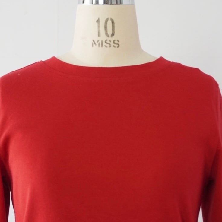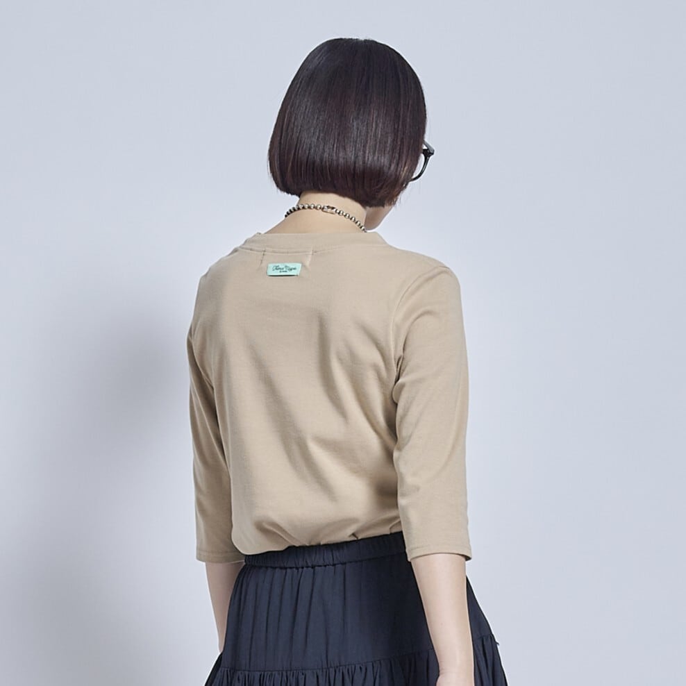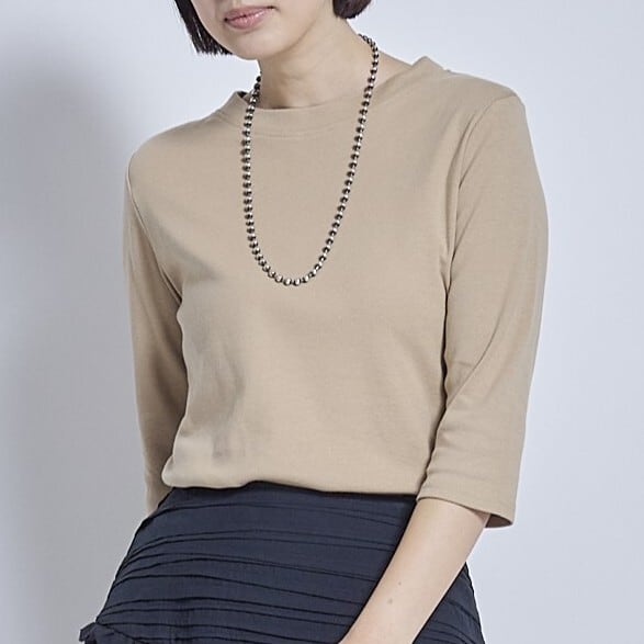 肌触りの良いコットン100%で、程よいフィット感がありながら身幅にゆとりがあり着心地も快適です。透けにくく、やや短めの袖丈で腕をすっきり見せてくれるのもポイント。