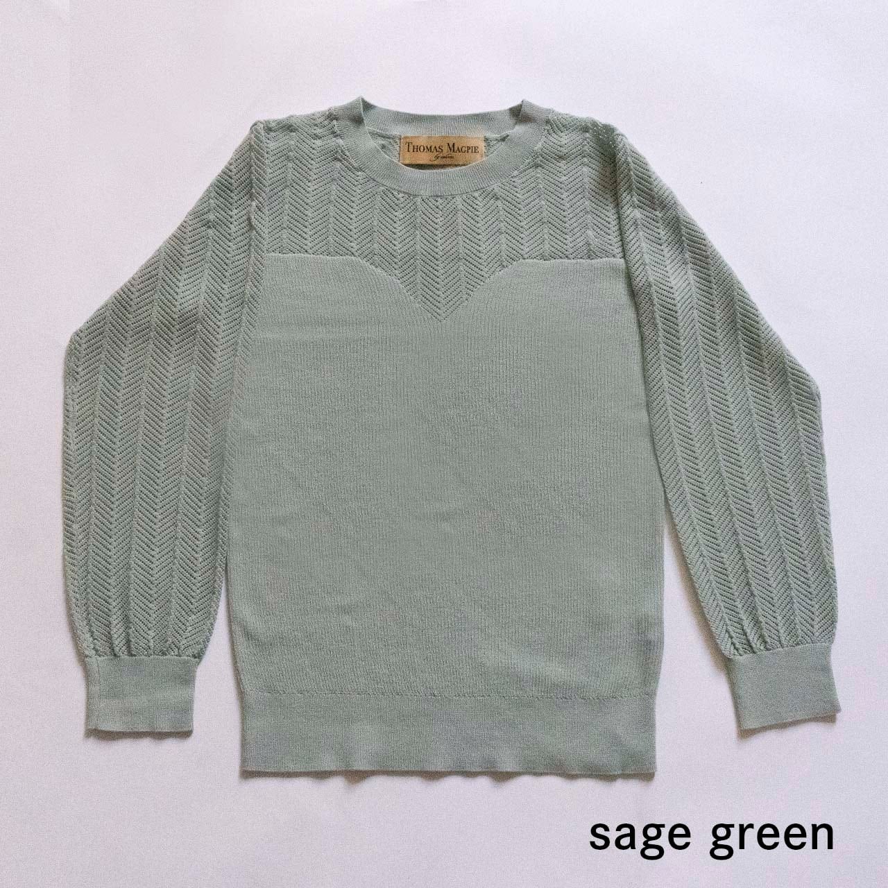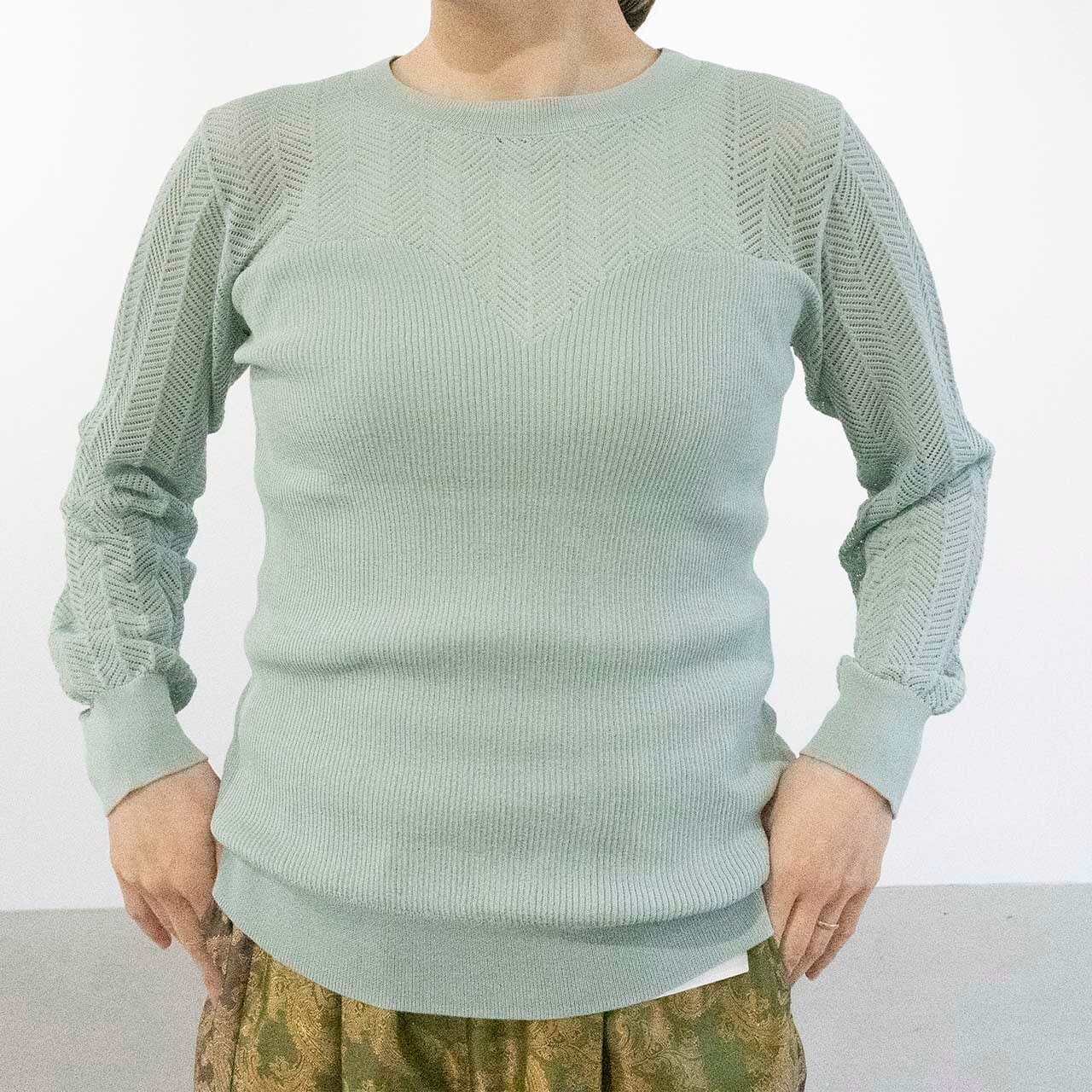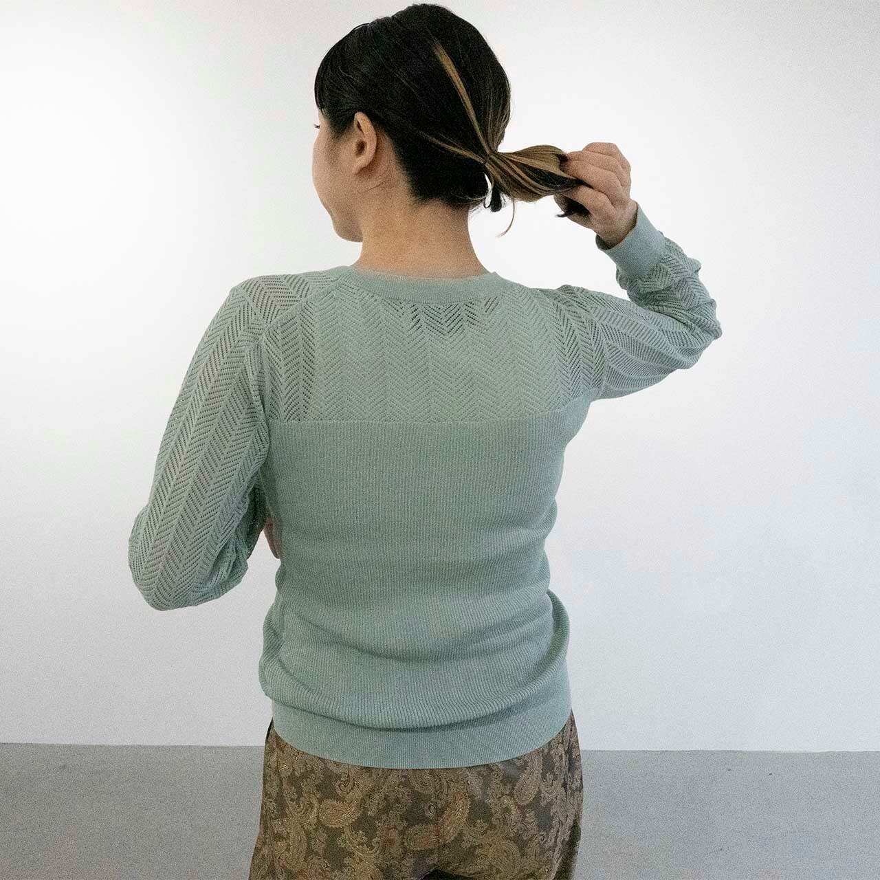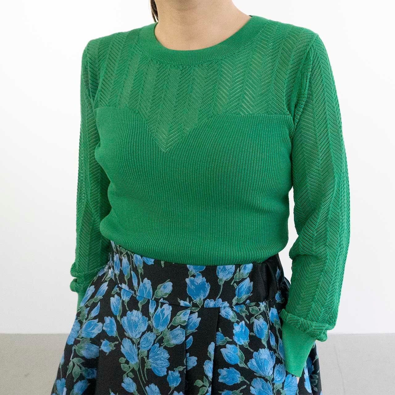 袖からバストまでのヘリンボーン部分には透け感があり、軽い風合いで使いやすいコットンニットです。