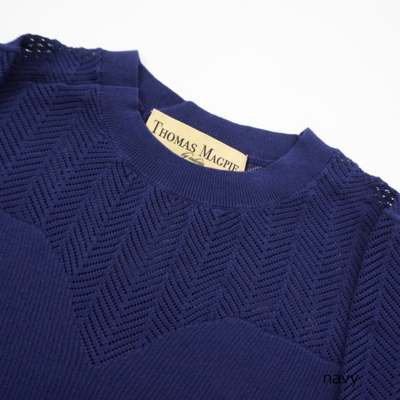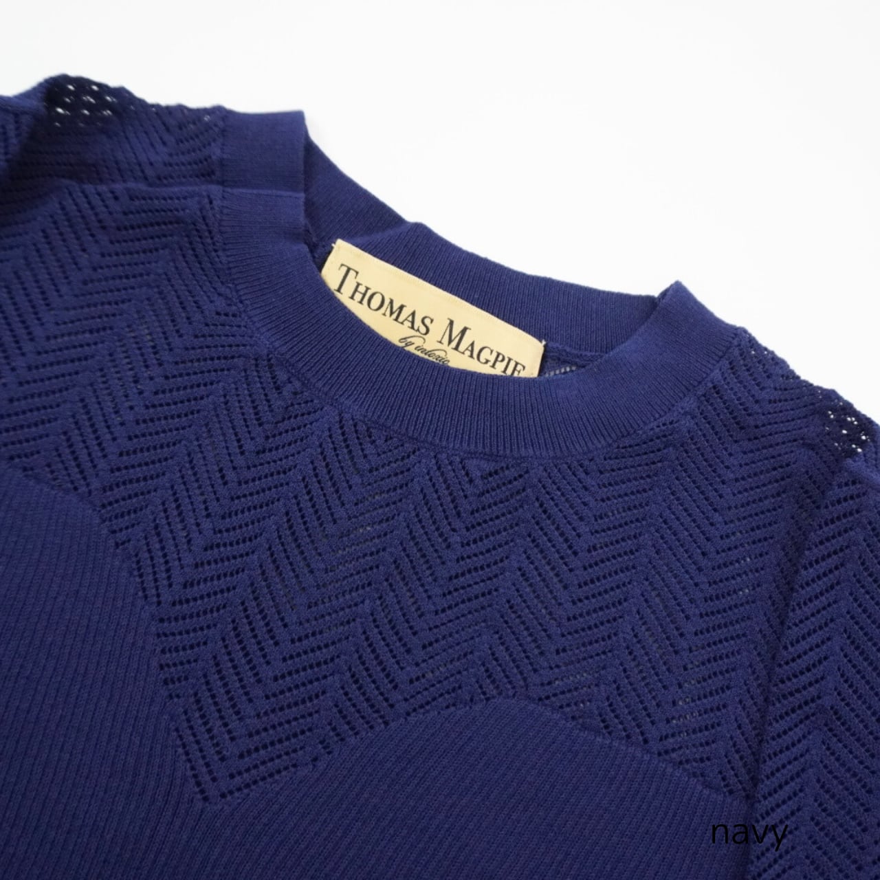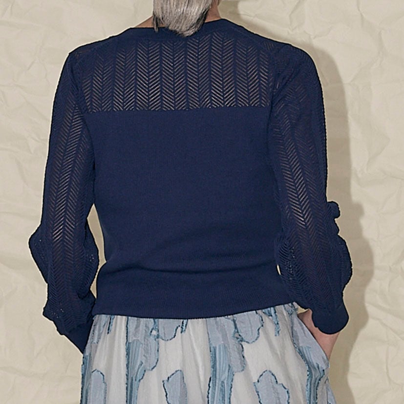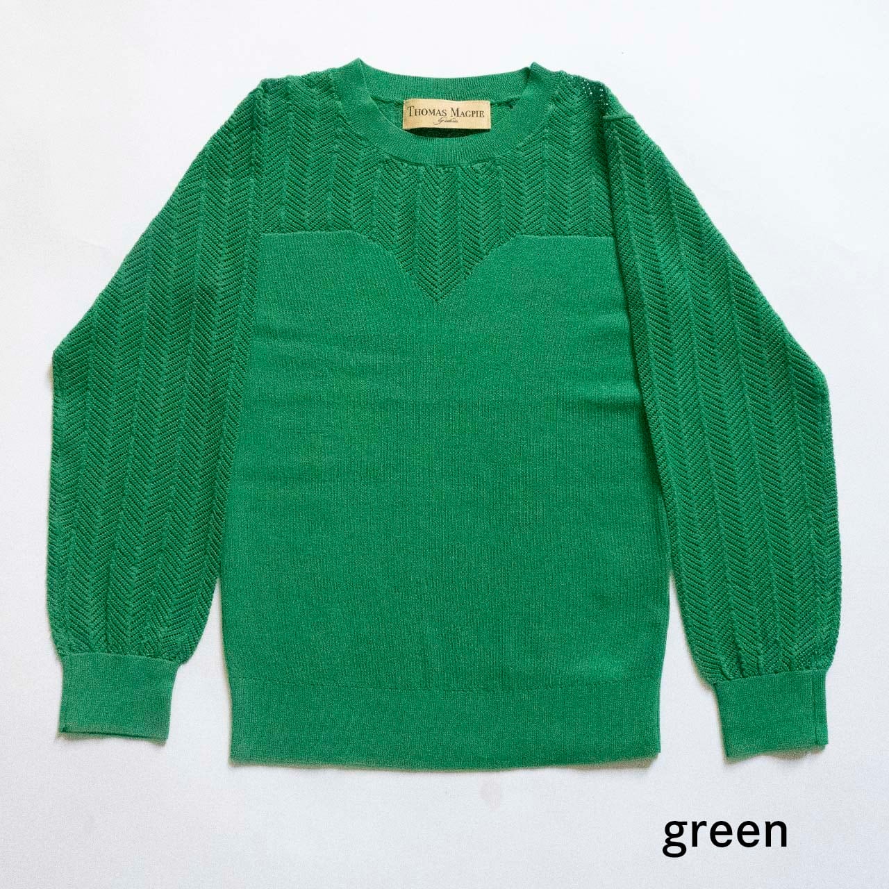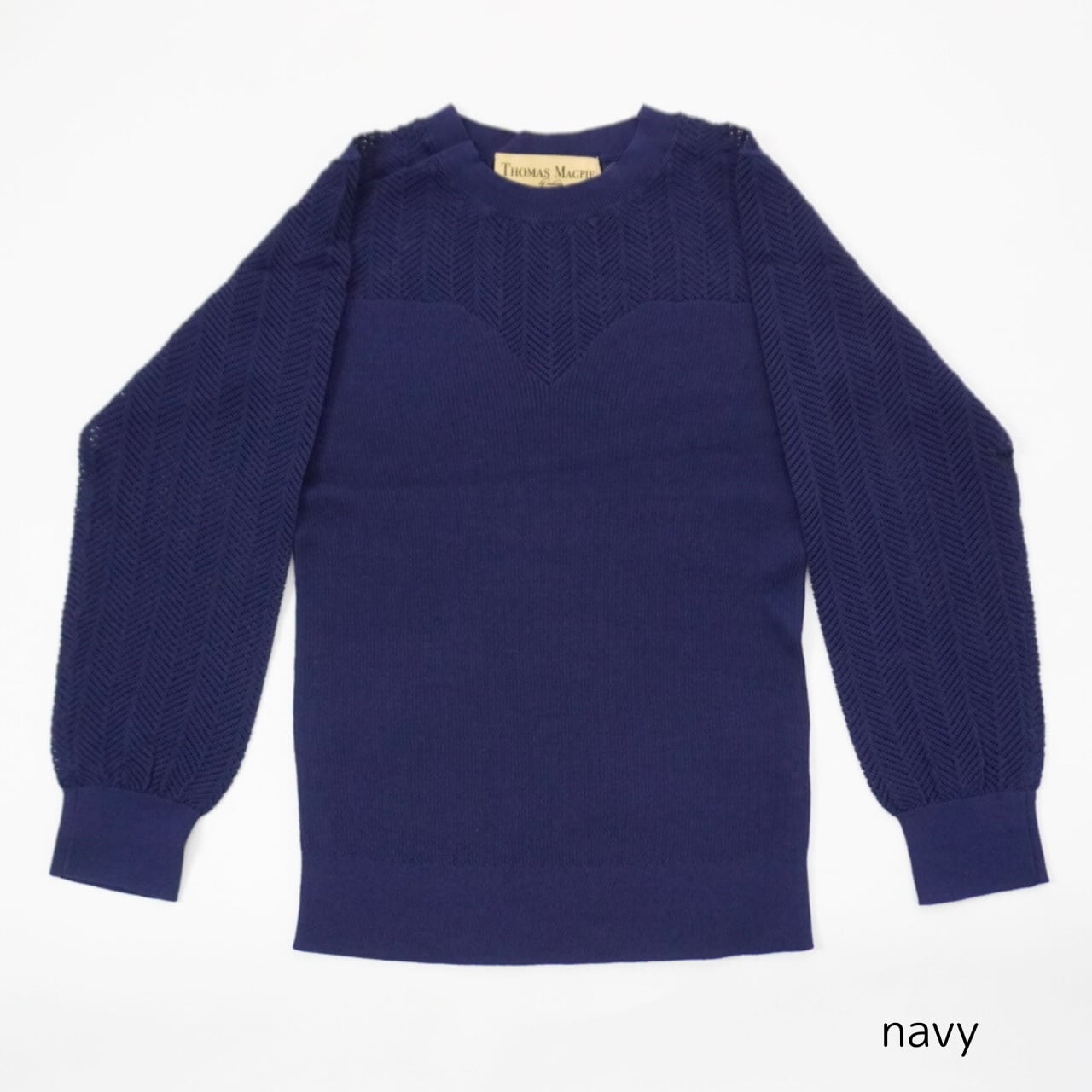 袖からバストまでのヘリンボーン部分には透け感があり、軽い風合いで使いやすいコットンニットです。