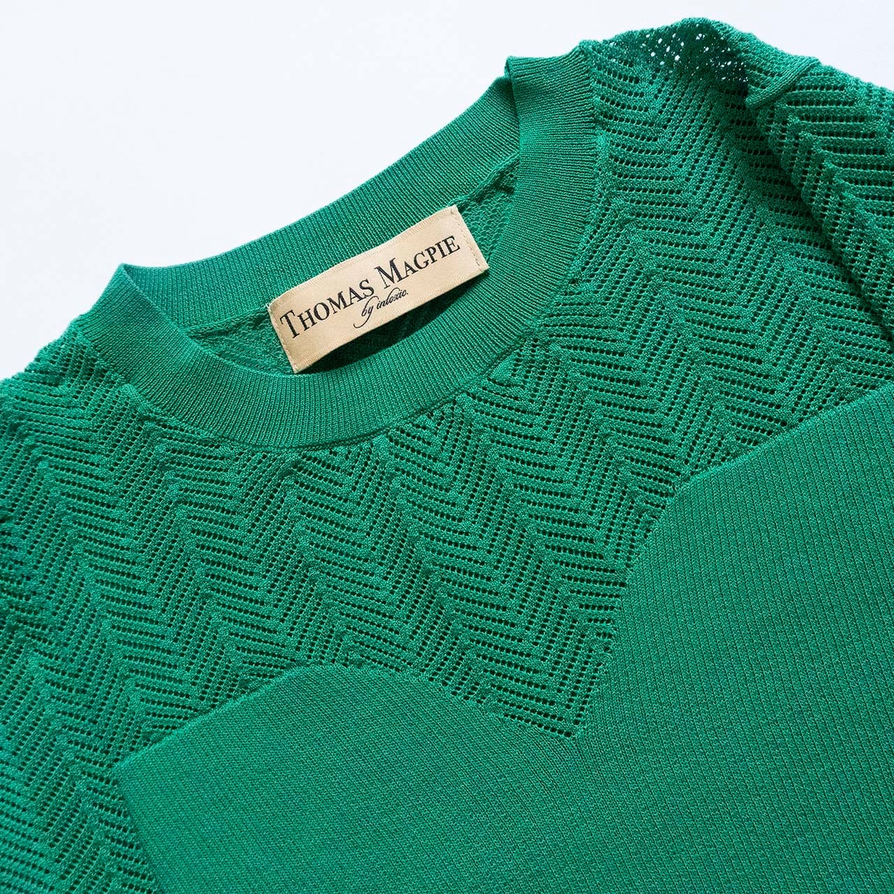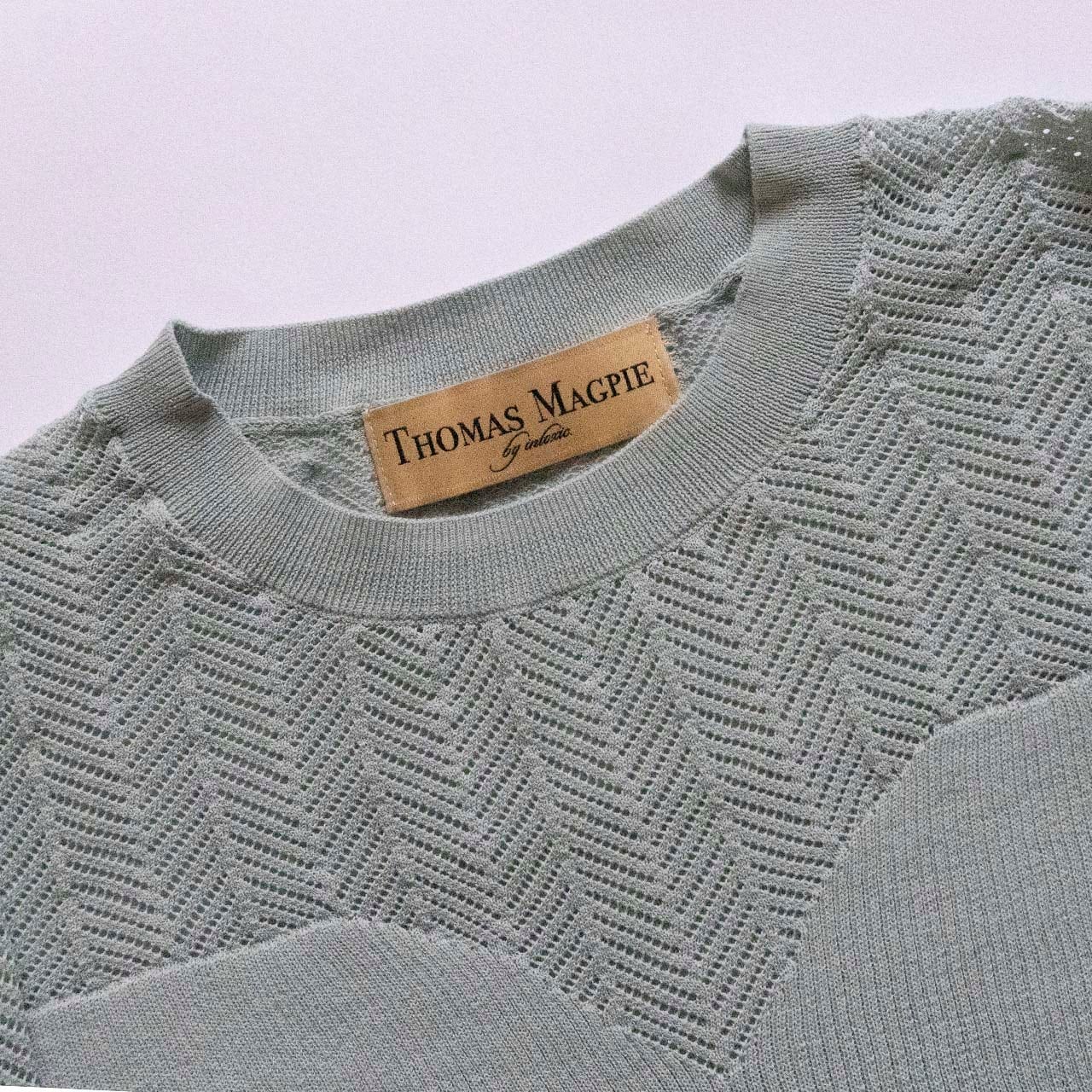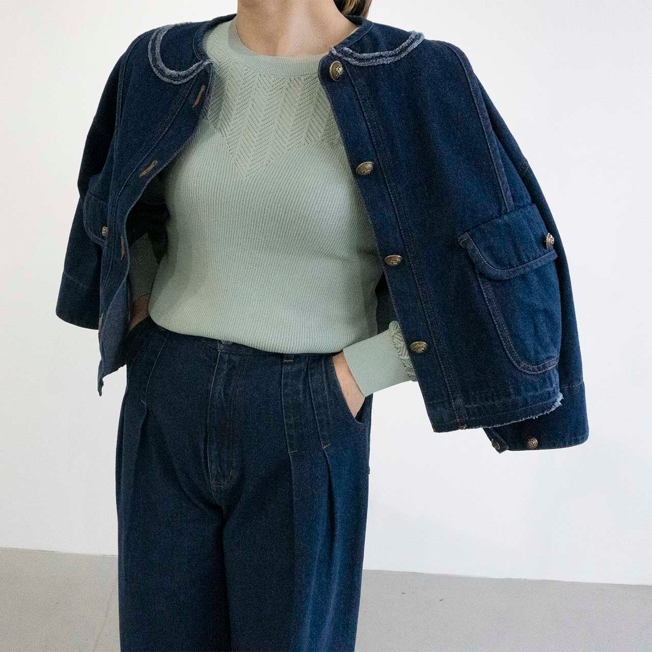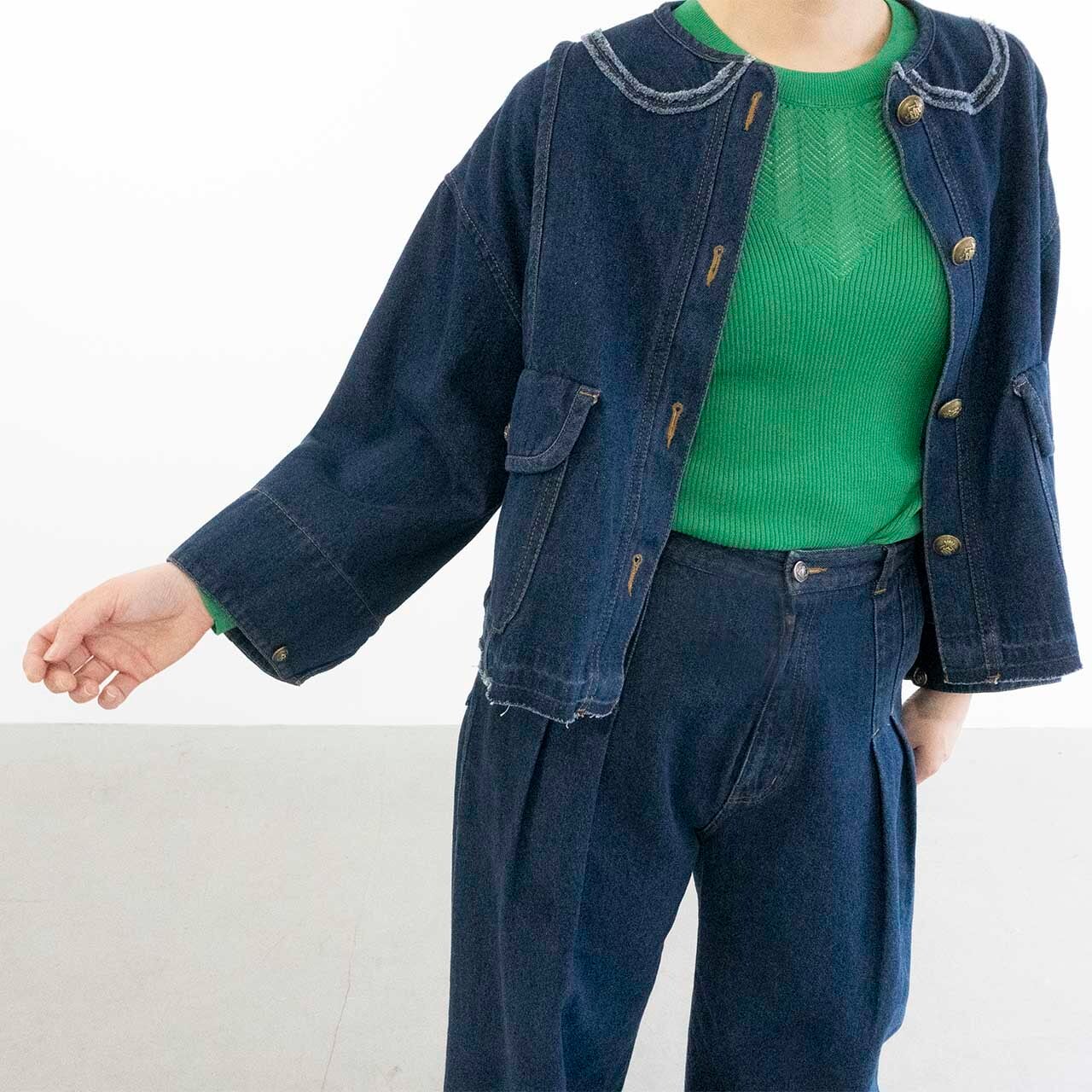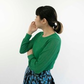 袖からバストまでのヘリンボーン部分には透け感があり、軽い風合いで使いやすいコットンニットです。