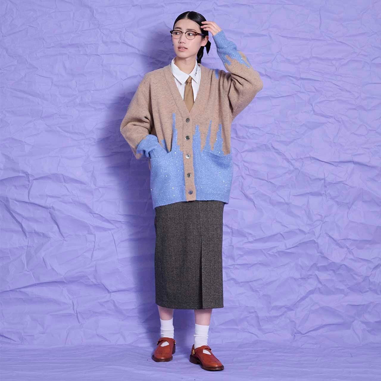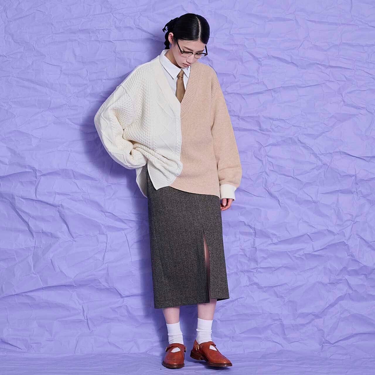 ワイドパンツと同じ素材のシリーズ。秋冬に向いている素材でストレッチ。フロント中央に深いスリットが入り、真っすぐなI ラインのタイトスカート。履くと大人のかっこよさが表現できます。タイトですが、太ももに張り付く感じはなく、ストレッチも入りmストレートなので着やすいと人気のアイテムです。膝下丈でビジネスシーンに向いていますが、今年のスリットは深めなので透け感のないタイツなどでセクシーすぎないように着てもらうと、モードな雰囲気になります。今年チャレンジしてみたい流行のタイトスカートです。