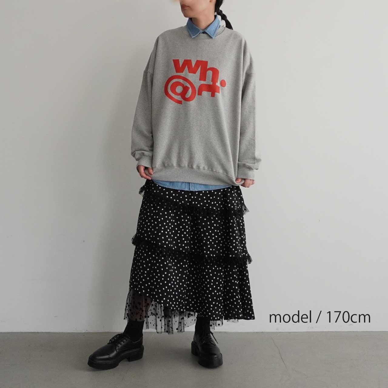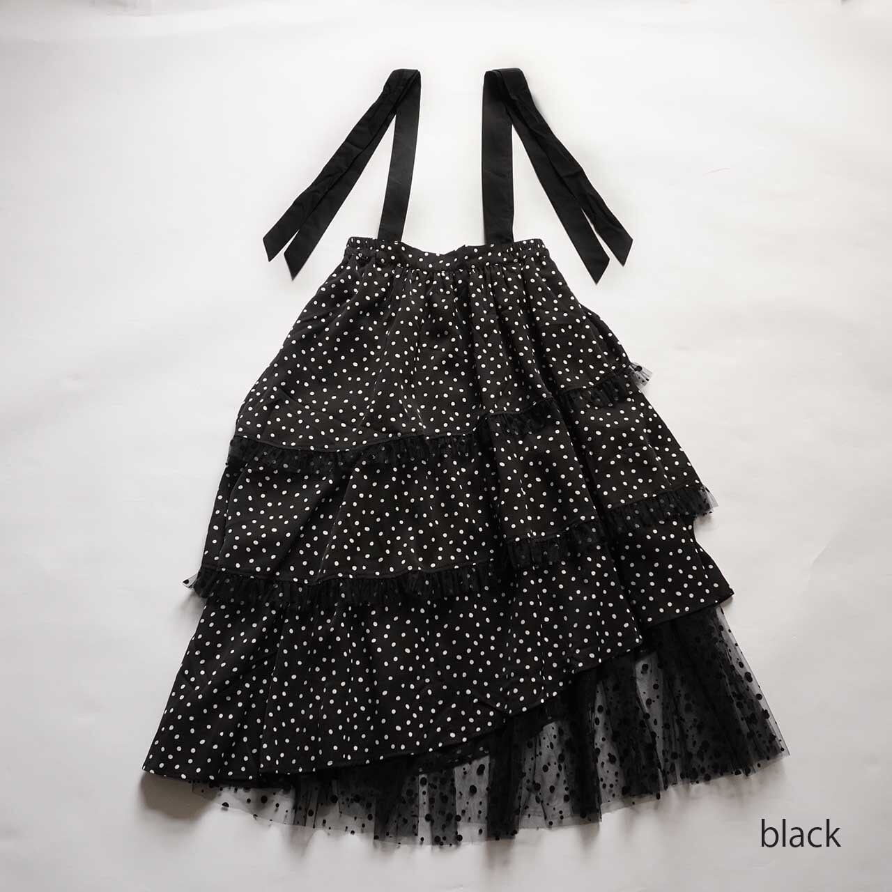 斜めのラインにした3段のスカートです。ウエストは後ろにゴムをつけてサイズに幅を持たせています。このスカートはとても気に入っていて、今回予約商品にピックアップしました。ウエストから4本の長めの紐が付いているので、結んでスカートのストラップにしたり、胸の上まで持ってきてベアトップ風にも着ることができるようになっています。スカートはいつもプリーツスカートが人気ですが、これも実用的にも合わせられるスカートではないかなと思っています。ちょっと横広にボリュームがあるのも好きです。色々な楽しみ方ができるように紐付きにしてデザインしました。気分じゃない時は中に入れても、リボン結びで垂らしてもOK。フリルがチュール生地なので透け感も可愛いです。甘いお洋服がお好きな方だけではなく、ちょっとカジュアルに来てもらいたいと思っています。いろいろな着方で楽しんでオールシーズン着たいスカートです。ポケット付き。