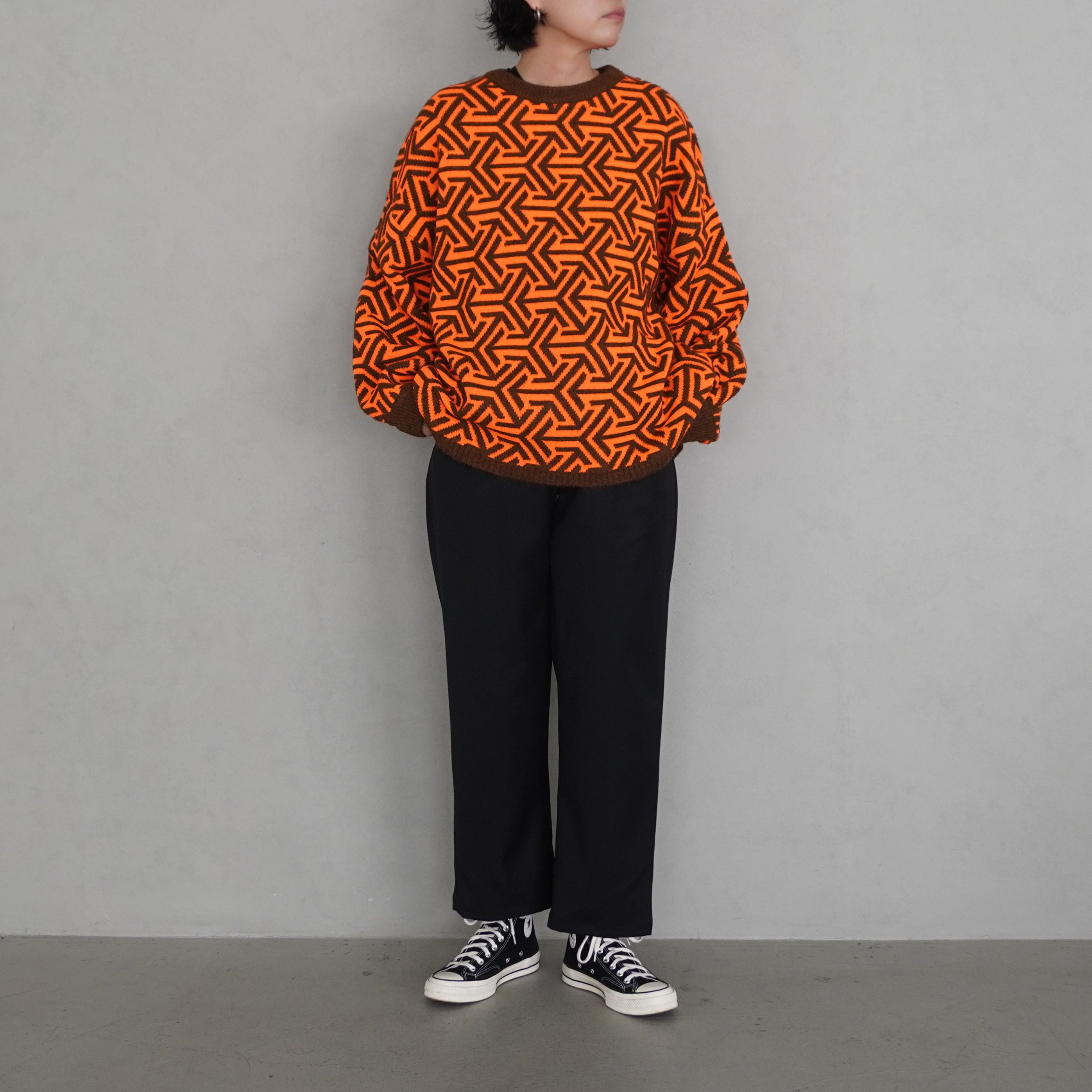 矢印柄です。四方八方という名前にしました。オリジナルの柄を編み込んでジャガードにしてニットを作りました。今回のニットは、柄とベース部分の糸を変えて立体感を出すことにチャレンジしました。いつもはフラットな同じ糸を使った幾何学模様で作り上げていますが、今回は糸自体を2種類にしてチャレンジをしてみました。2つの糸を使う事で、画像では分かりにくいですが、立体感に加えて高級感が生まれているように感じます。ニットはいつもチャレンジをしたくて、難しいものにもチャレンジしていこうと模索していますが、今回初めてのチャレンジがうまく出来上がっているのではないかと思います。