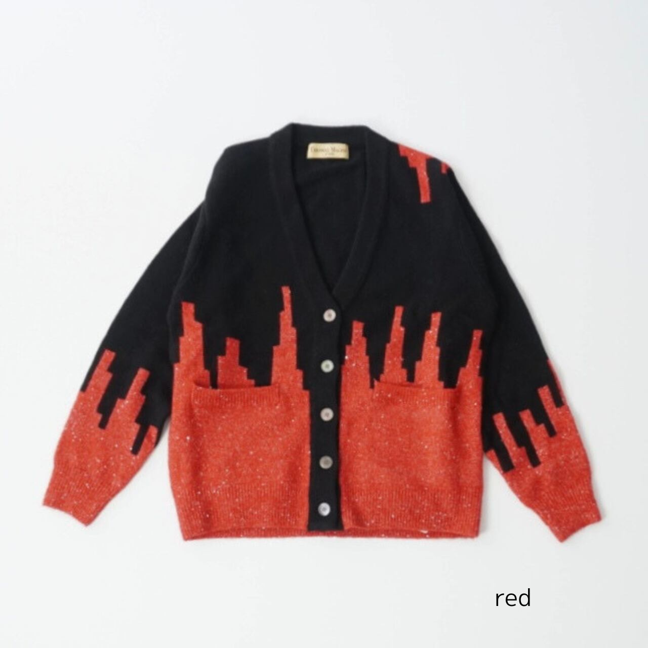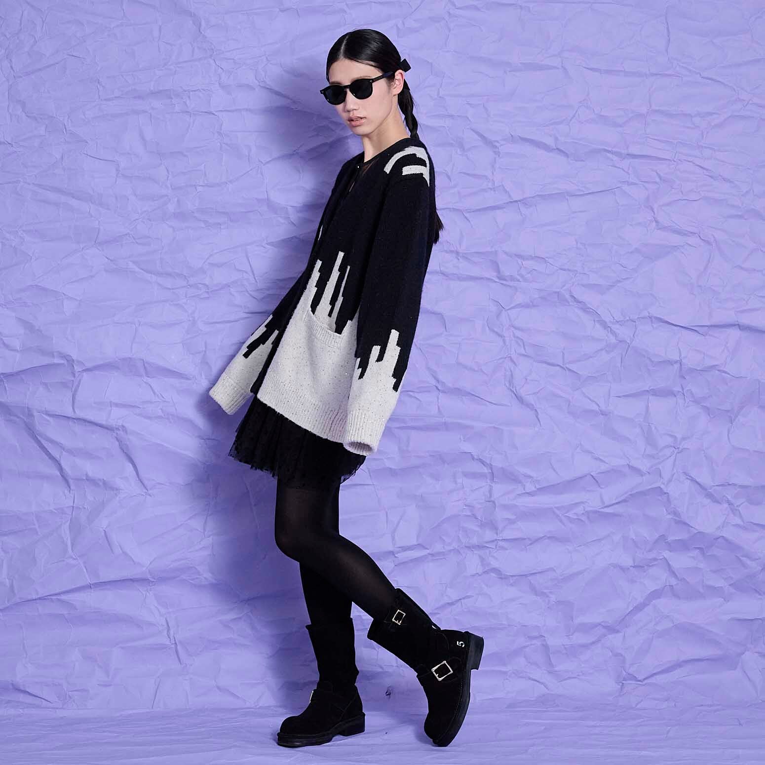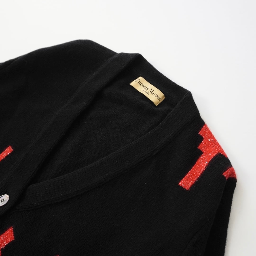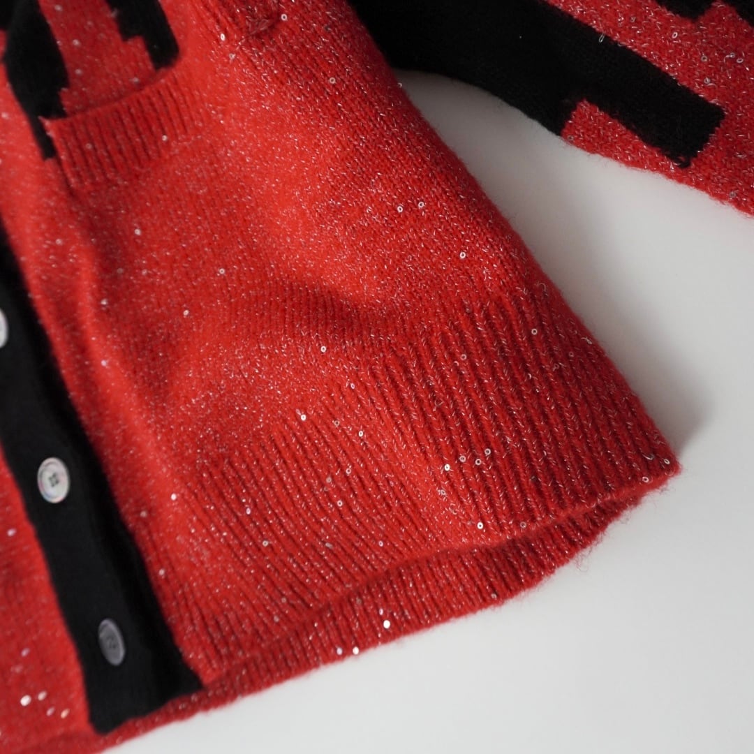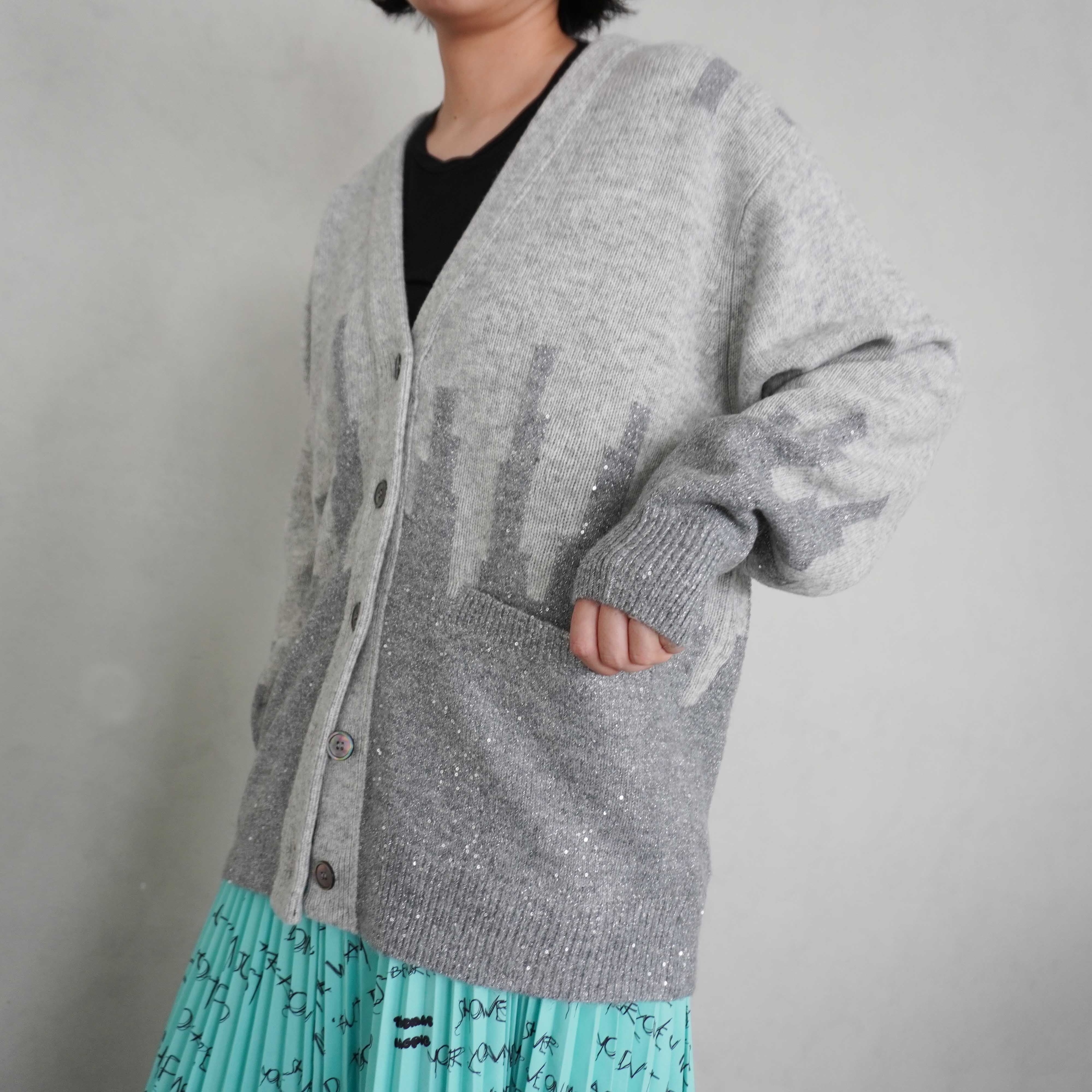 インターシャで柄をつけたバイカラーニットカーディガン。下の切り替えた部分がスパンコール付きのラメ付きになっています。オーバーサイズ。