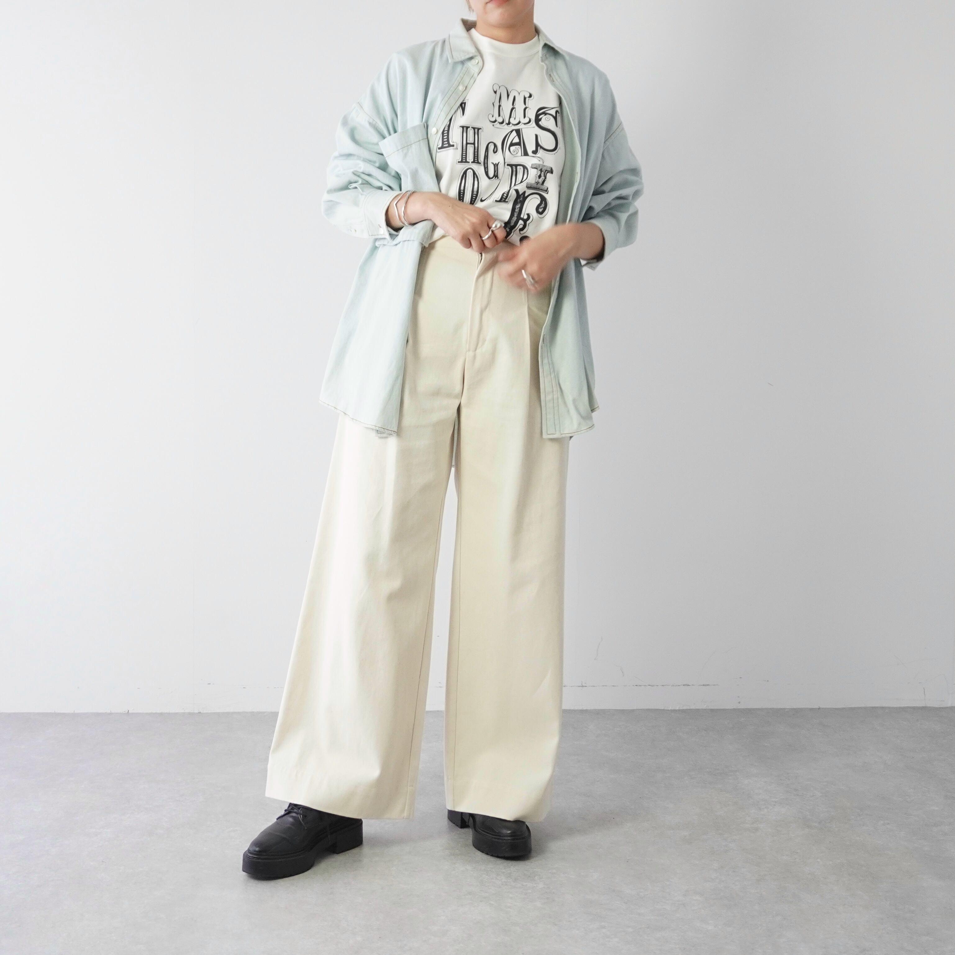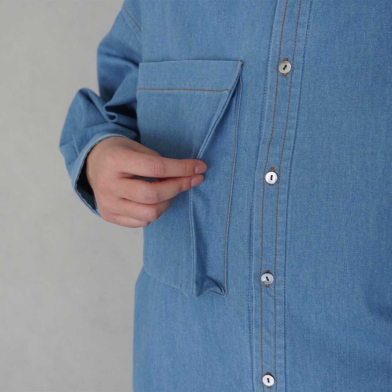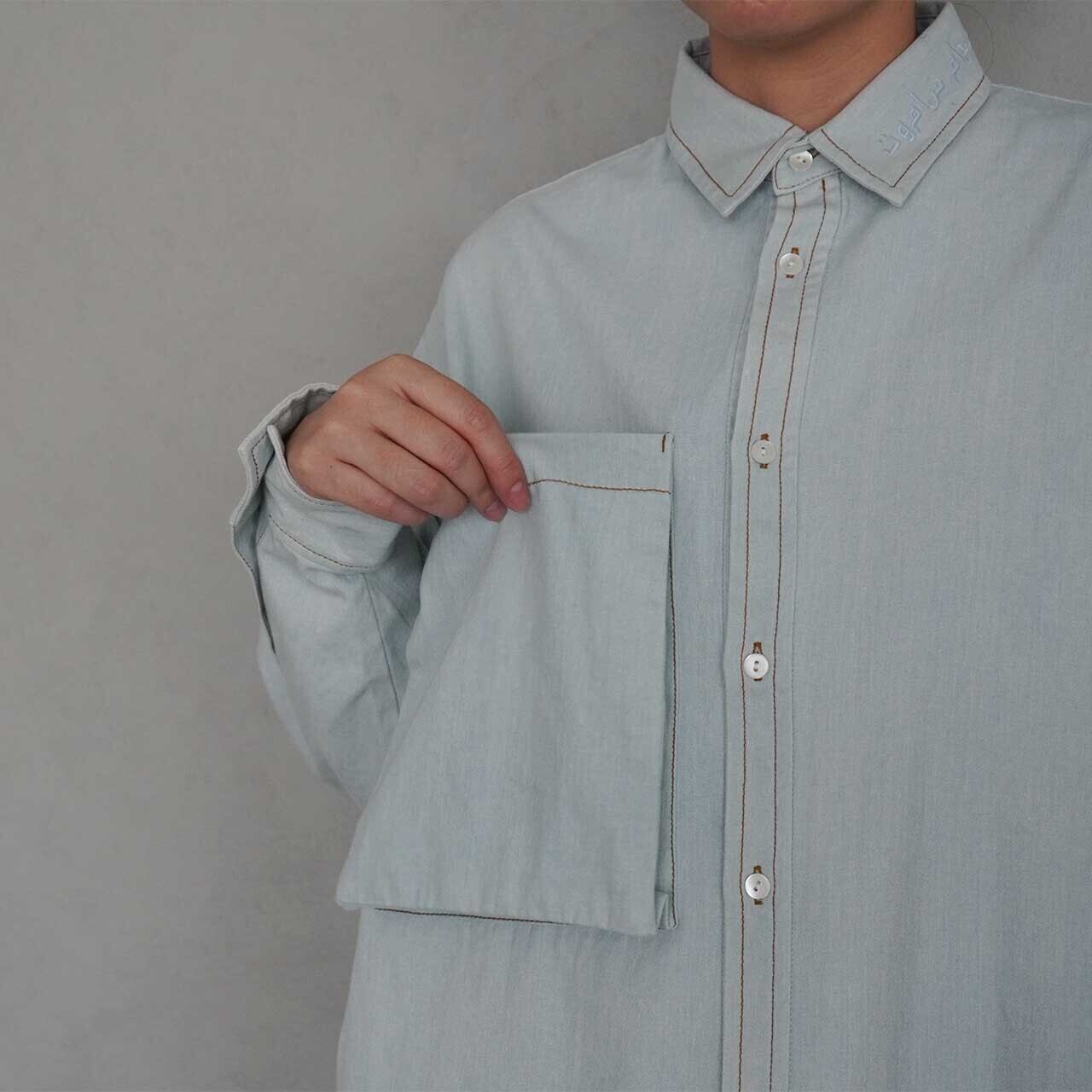 立体感ある大きなポケットが特徴的です。ポケットはマチをつけて膨らみを出しました。また、襟にはアラビア文字でThomas Magpieの刺繍を入れています。ヒップまである着丈の長さも使いやすいです。これまで作ってきた大きめのシャツは、カジュアルなプリントを施した物が多く、存在感がありました。このビッグポケットシャツは無地に大きなポケットでシンプルで、とてもコーディネートしやすく着やすいと思います。一枚で単純に着ても、モードな雰囲気も楽しめます。これまでキレイにお洋服を着ているジャストサイズトップス派の方も、是非チャレンジしてください。また、体型問わずに、細い方も身長が低い方も高い方も、グラマラスさんにもどなたにも似合ってしまう一枚です。