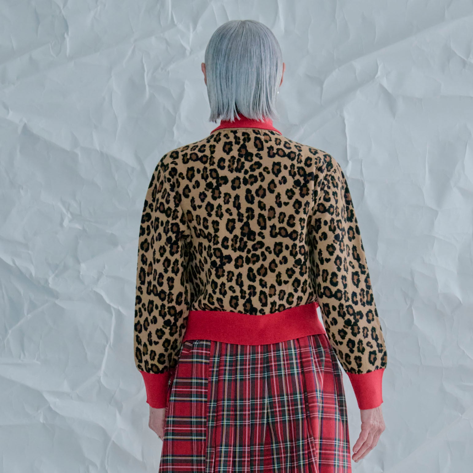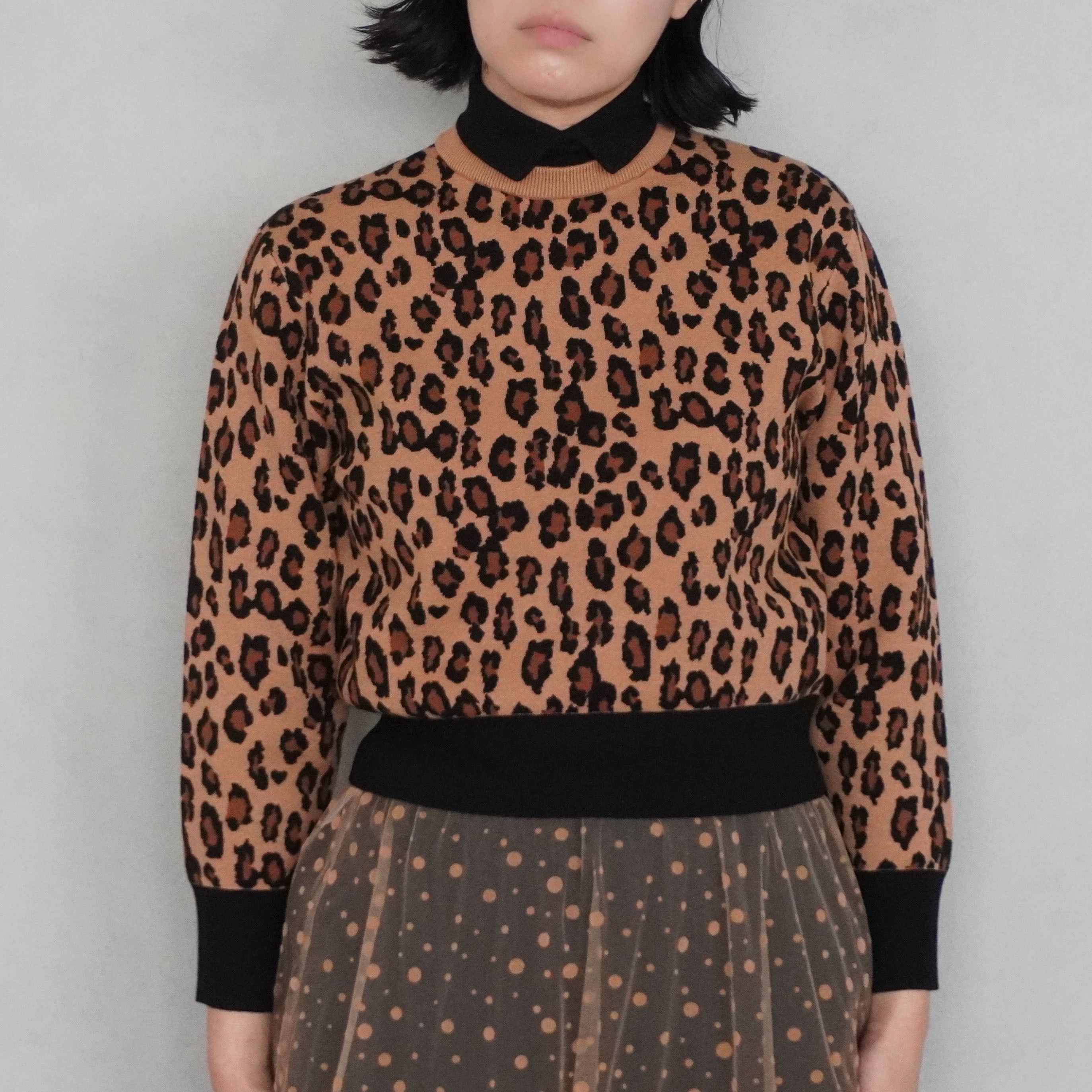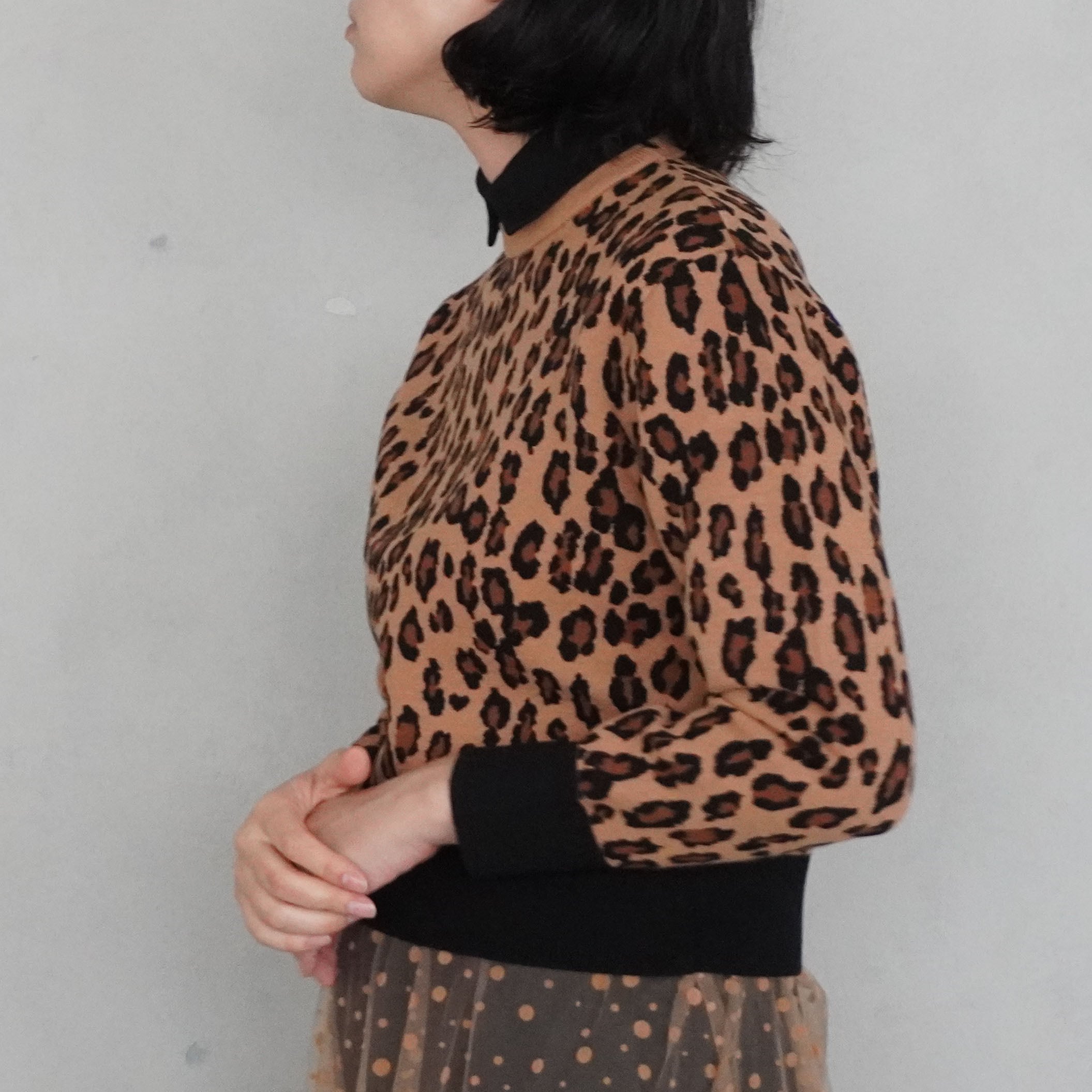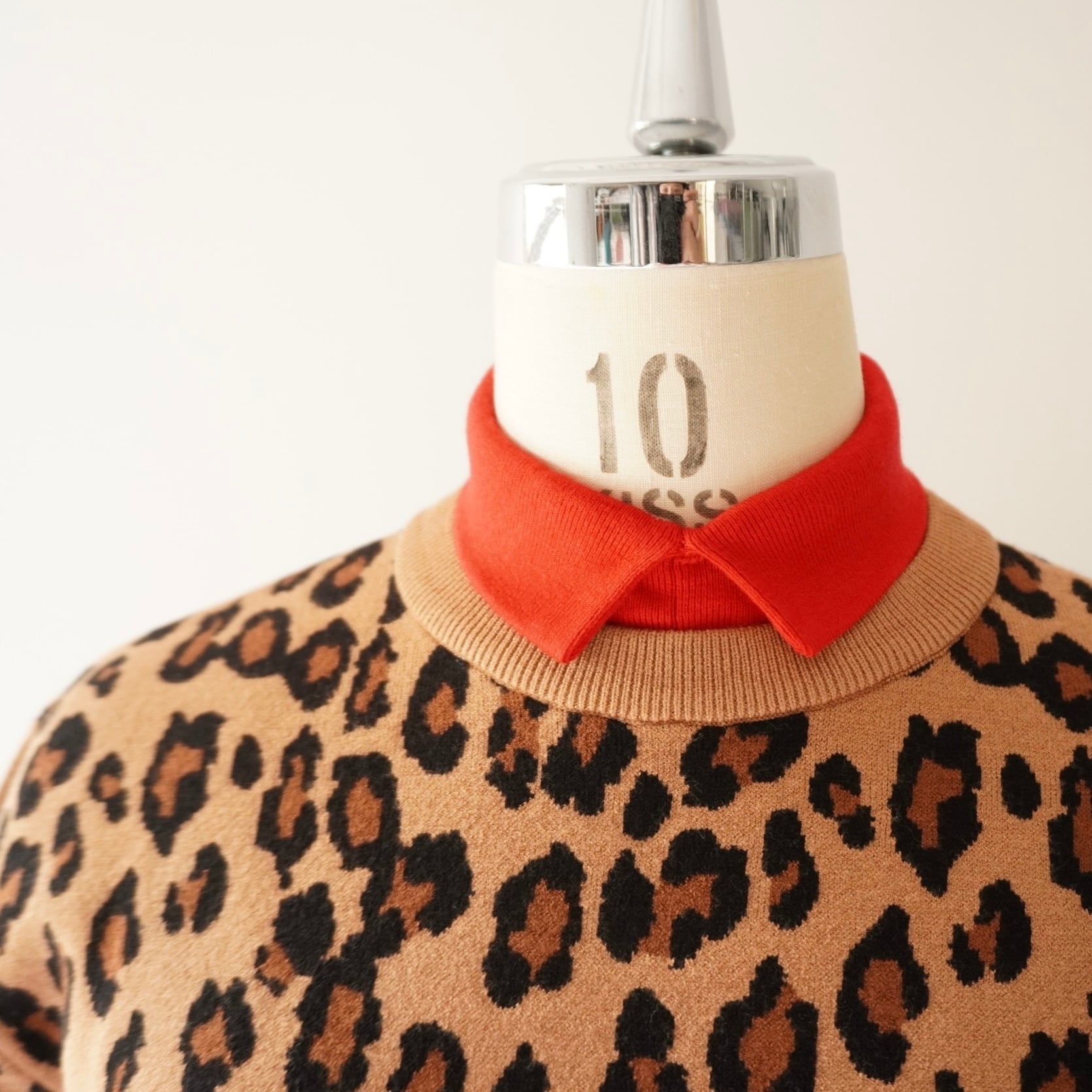 レオパードは定期的に出している大好きな柄です。今回はニットでオリジナルの柄を作りました。トーマスマグパイだけのオリジナルデザインの柄になっています。ニットは柄はどれもオリジナルで、毎回苦心しながらデザインしていますが、レオパードの柄は初めてのチャレンジです。定期的に着なくなる時期がありますが、数年おきにレオパードに対するブームがあるのか、今年の冬にまた着たいなと思いデザインしました。