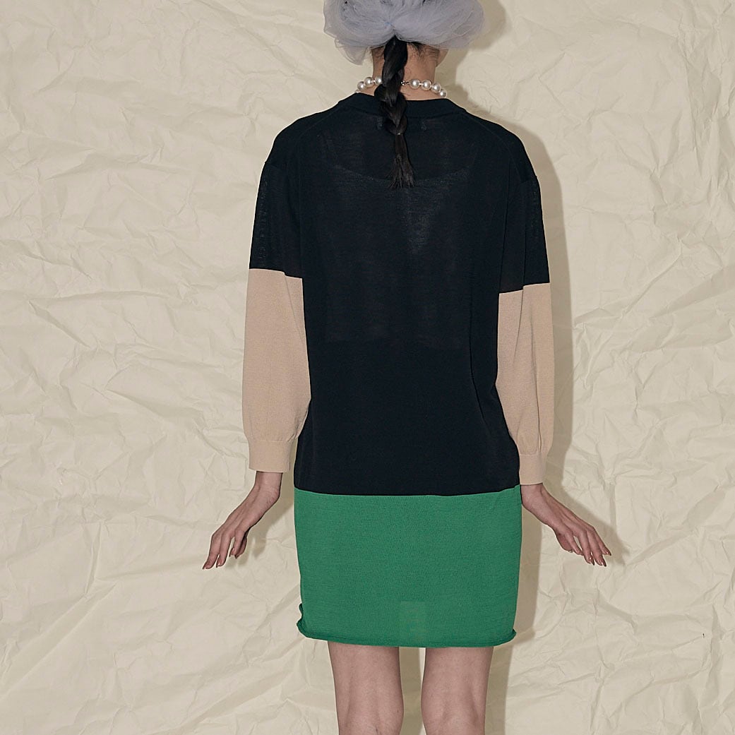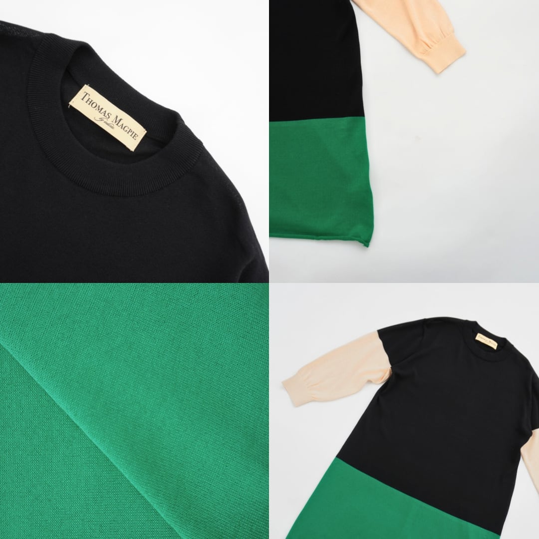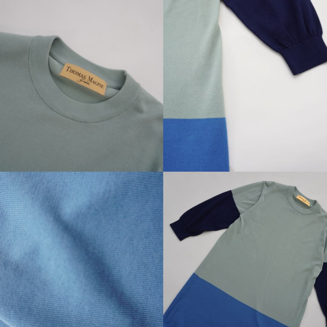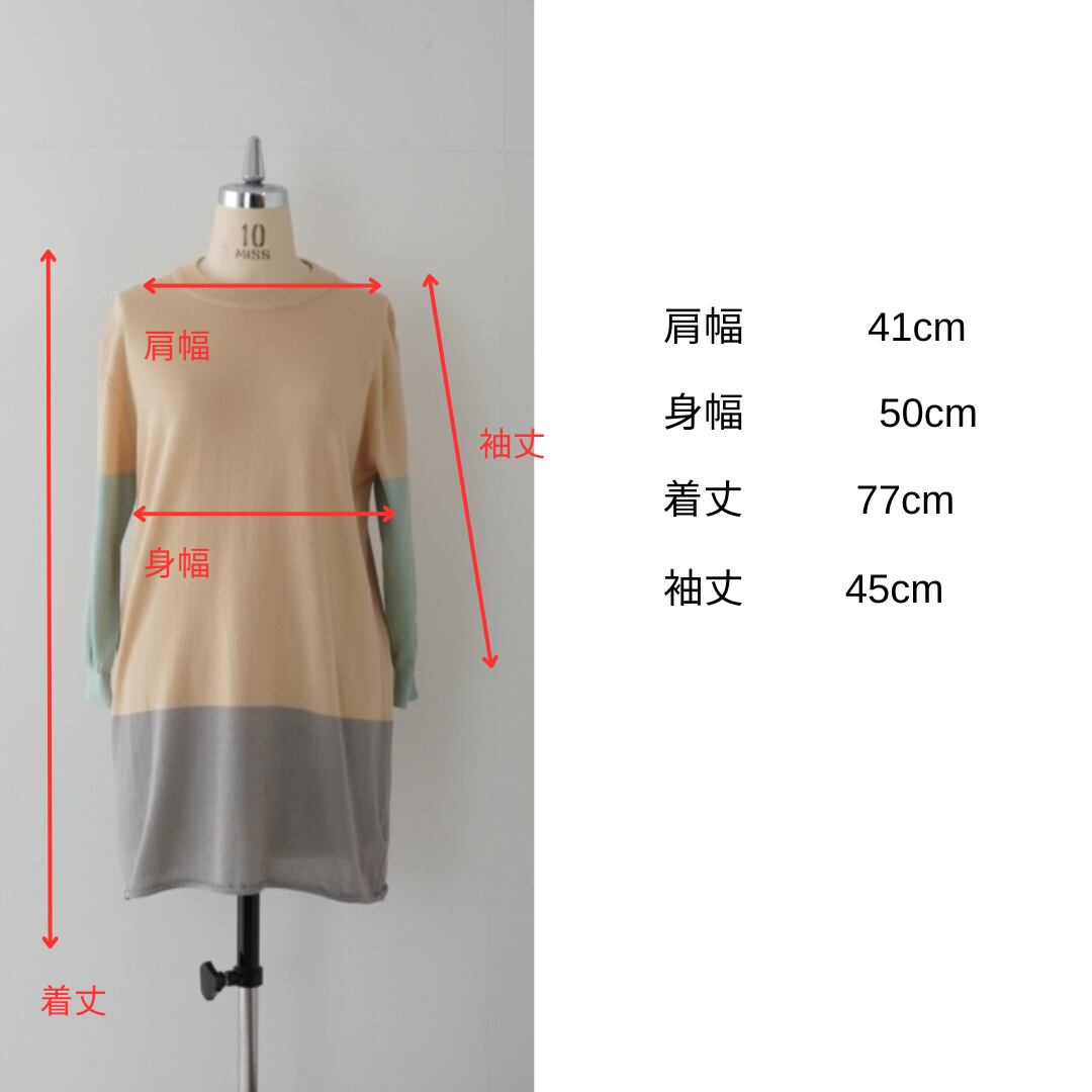 トリコロールカラーが鮮やかで、一枚でもインナーとしても使いやすいニットです。
