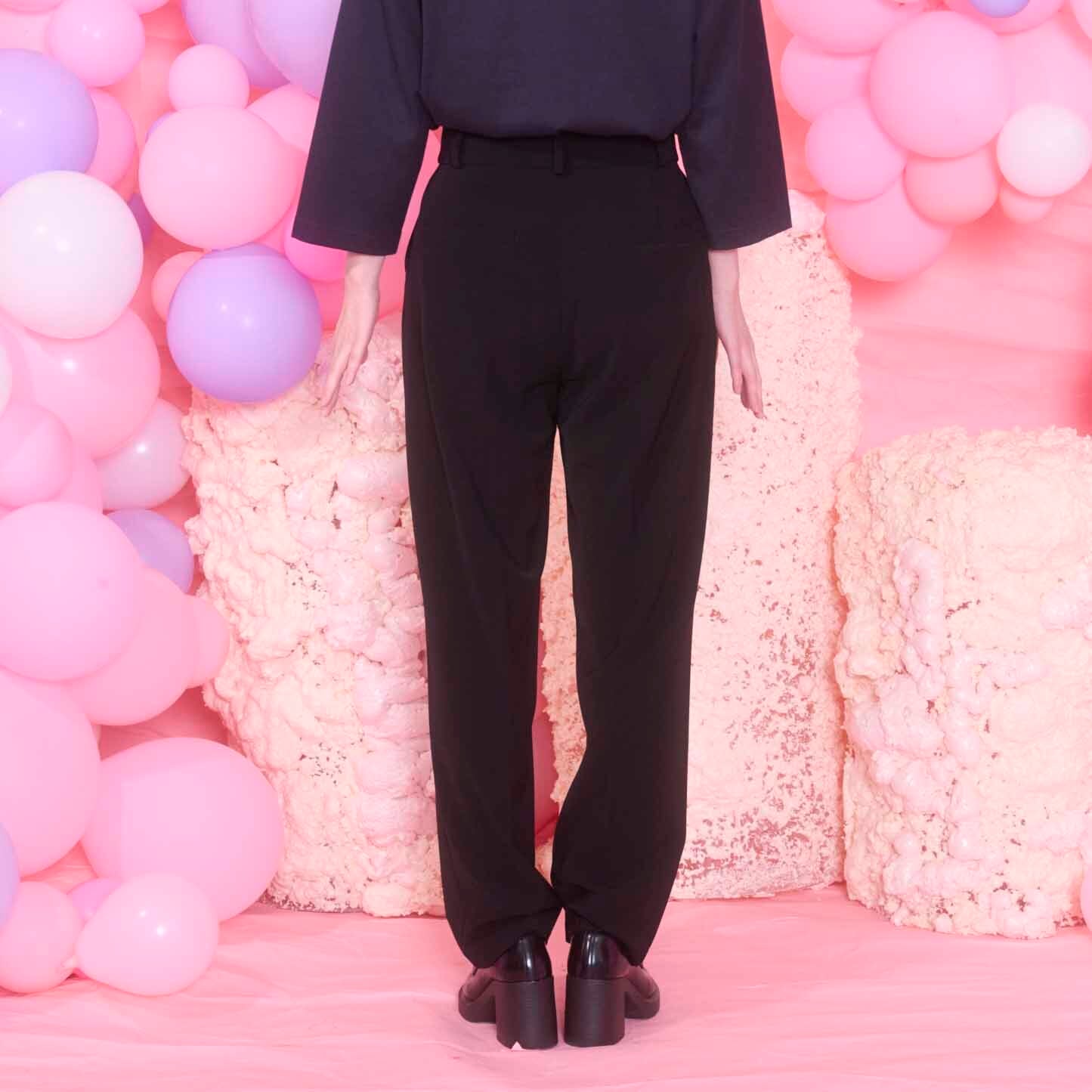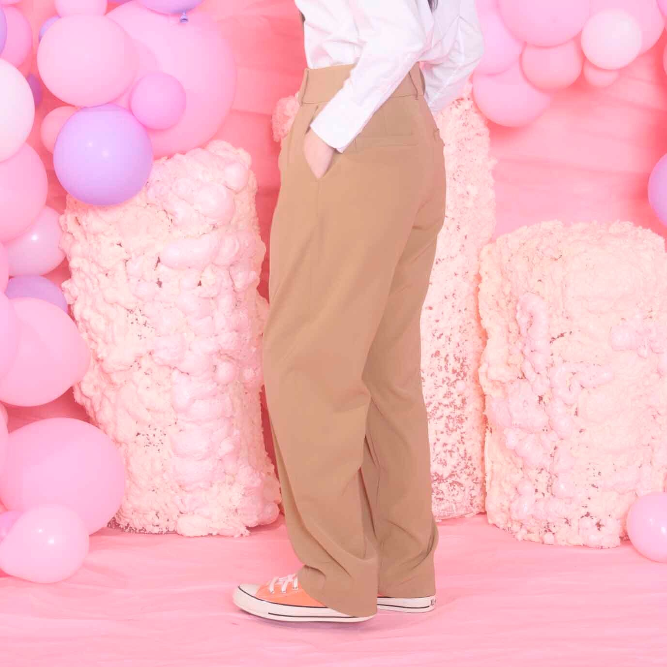 足元はスッキリとウエストはタックが入り、落ち感のある素材なので綺麗にみせてくれるパンツです。