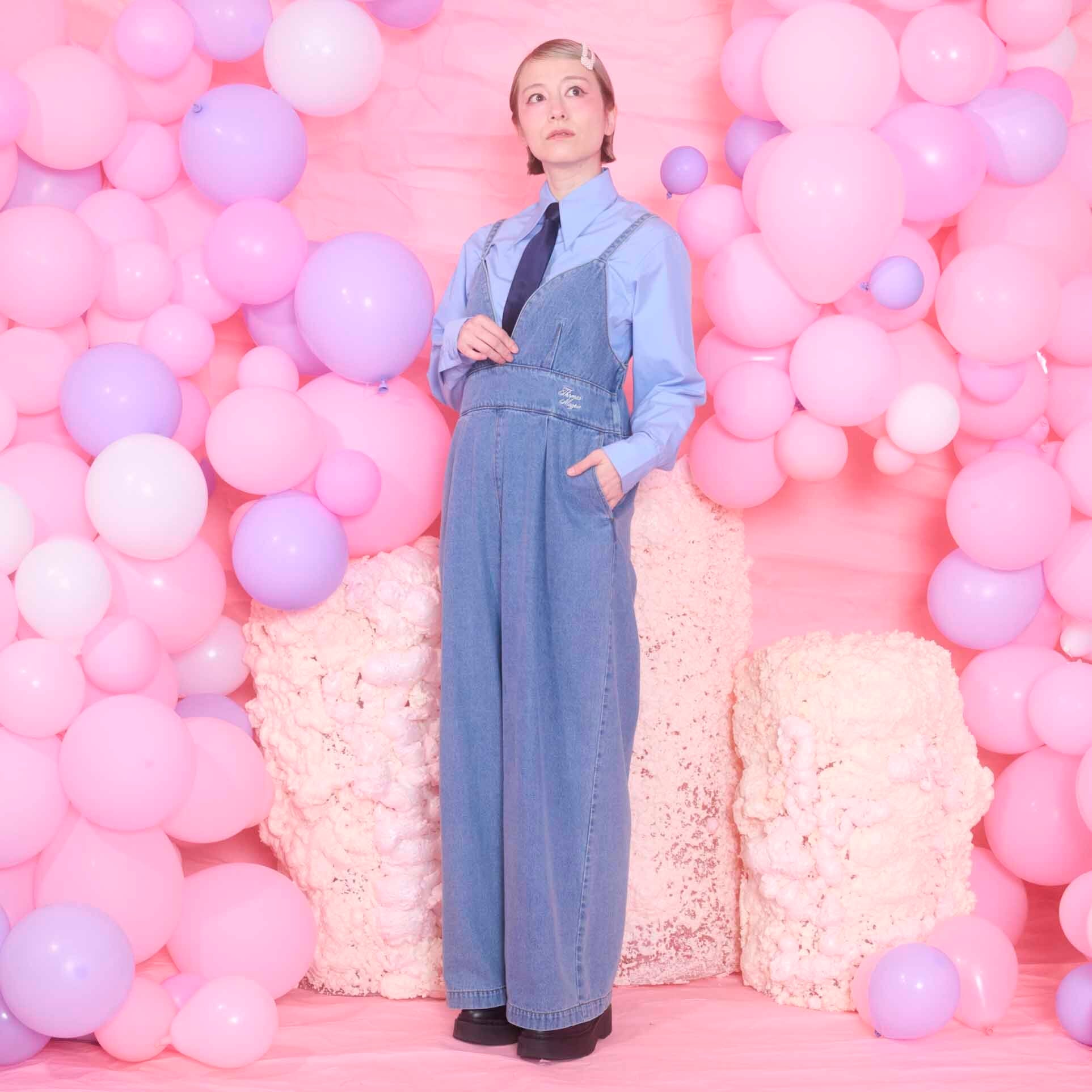 サロペットはこれまでも出してきましたが、非常に人気のアイテムになっています。今回はデニムでも作ってみました。背中にはゴムが入っていて、とても着やすくしています。パンツはワイドですが、丈はストラップで大幅に調節が可能で身長に合わせてスライドする事ができます。パンツの股下はやや長めですが、もし合わない場合はロールアップして縫い留めするか、カットして切りっぱなしも可愛いと思います。身長が154cmから165cmの方が私のようなバランスになるかと思います。モデルの宮島咲良さんは160cm後半ですので身長の高い方は着画で参考になさって下さい。バストはフリーで、ウエストはかなり大きめになっています。サイドジップで着脱しやすくしています。