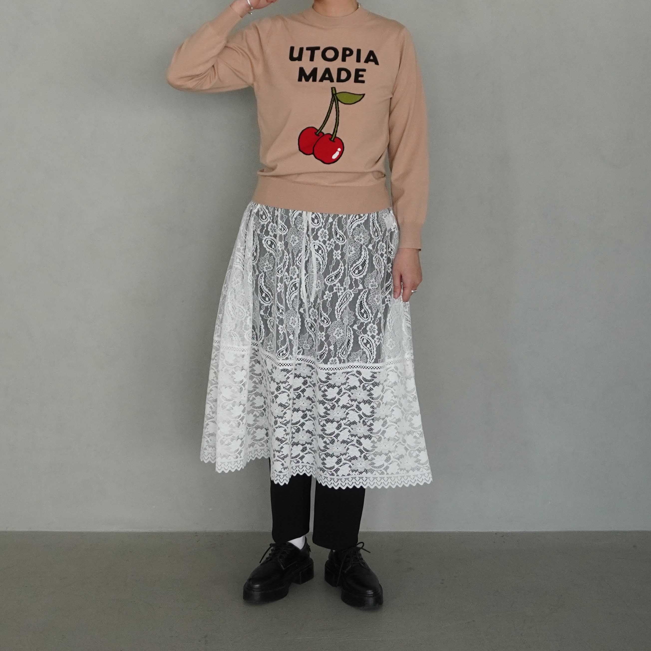 ユートピアで作られたチェリーの絵を描いて入れています。今回のユートピアのイメージは理想郷に入っていきたい、ストレスのない世界なんてないだろうけれどもそんな世界が未来にできたらいいな、という思いからこの言葉を選んでいます。トマスモアのユートピアが16世紀に一番最初に出版され、この言葉が初めて使われました。それはおそらく歴史の授業で知った言葉でした。私なりのユートピアのイメージは今回のコレクションのメインビジュアルになっています。ふわふわとした心地よい世界。イメージを伝えカメラマンとモデルに写真で表現してもらいました。ユートピアでできたチェリーはとても美味しい。このさくらんぼはユートピアでできたものです。さくらんぼの花言葉は”良心”です。心の声に耳を傾け、誠実に行動する精神、善良な教育、上品さ、幼いピュアな心、というものがあるそうです。みんなが良心という心で人々に接することができれば世界はきっと心地よいものになるのだろうな、なかなか出来はしないけど。という理想を表現しています。また現実的にはきっと出来ない、でも精神の世界で理想郷に入れたらいいな、という私自身の妄想でもあります。